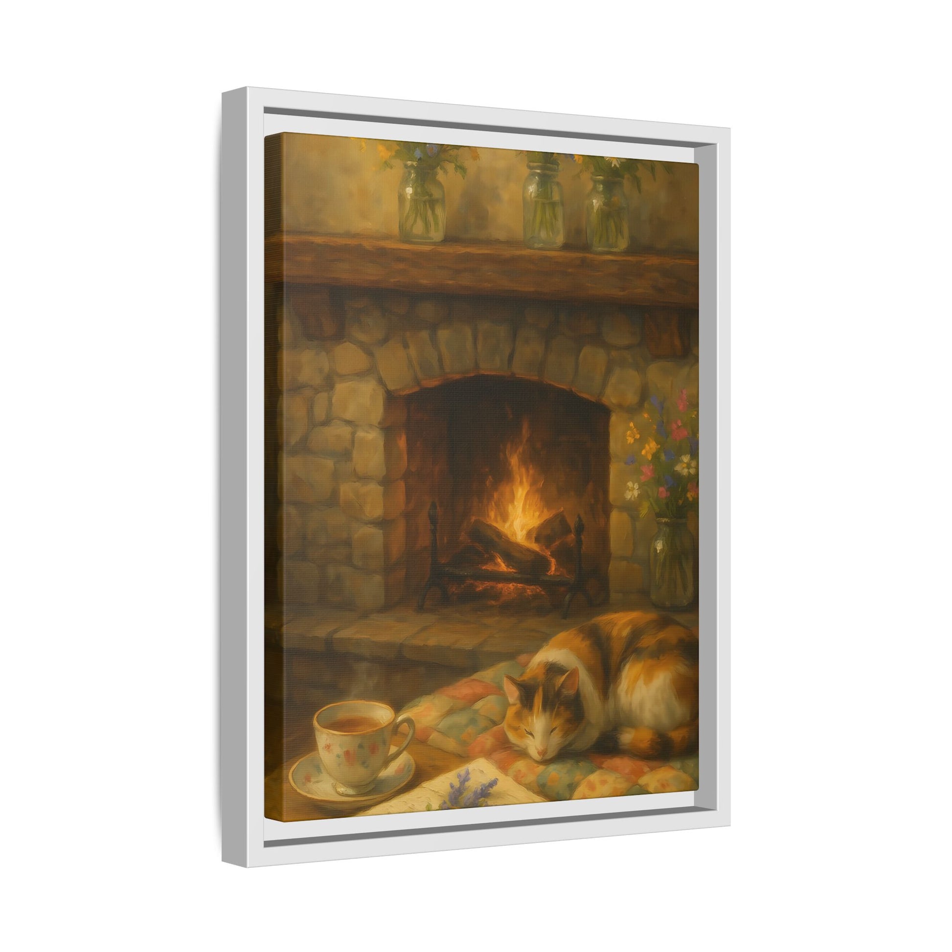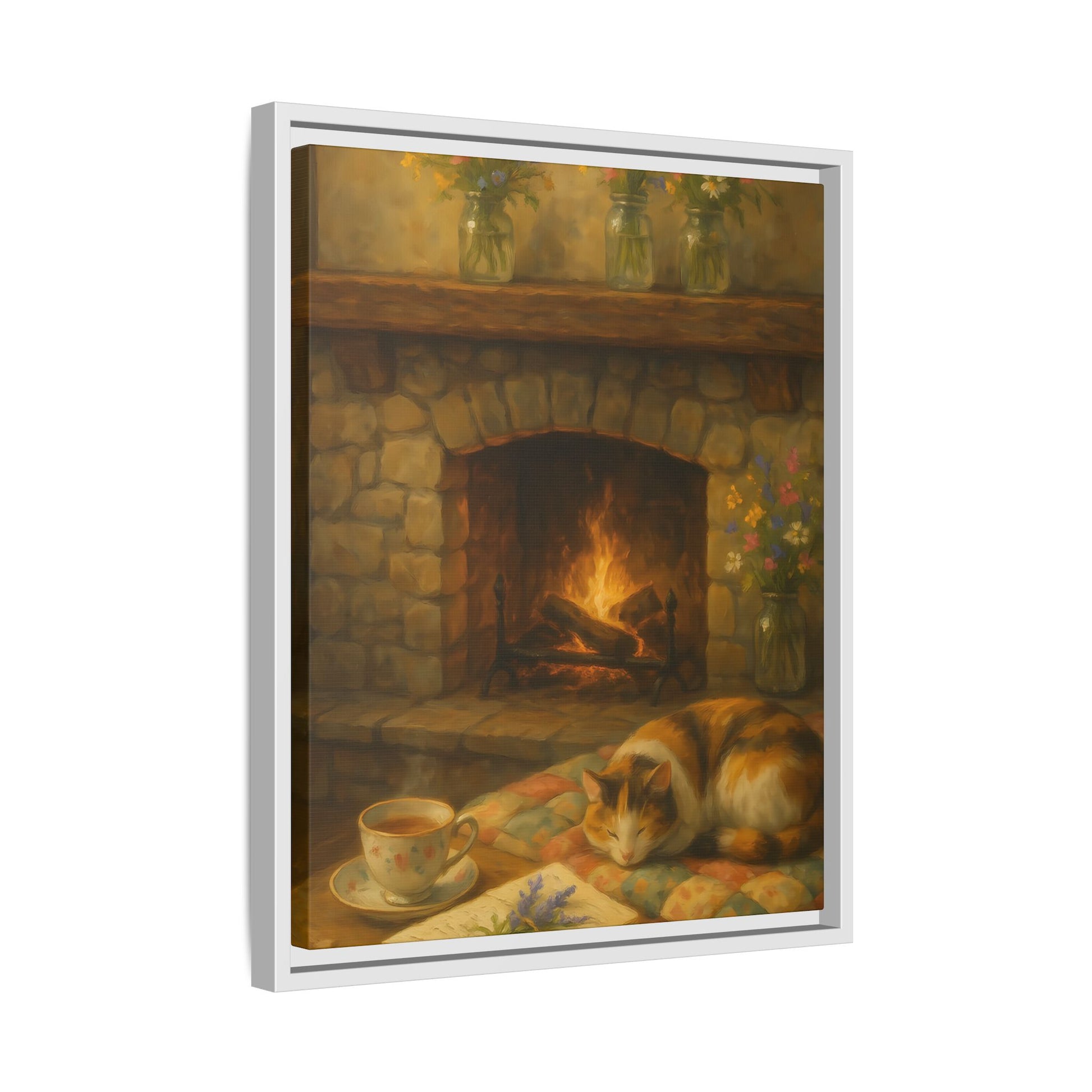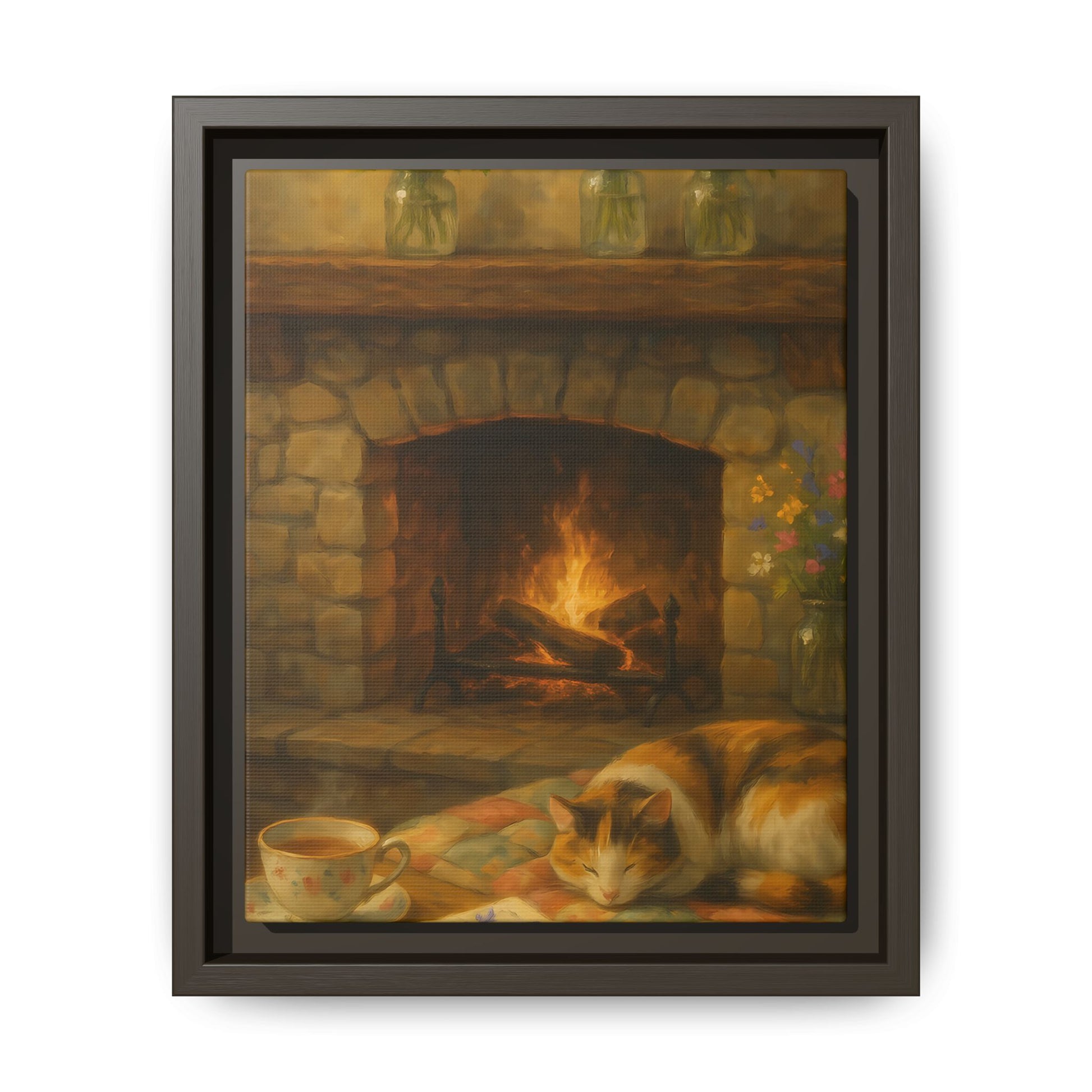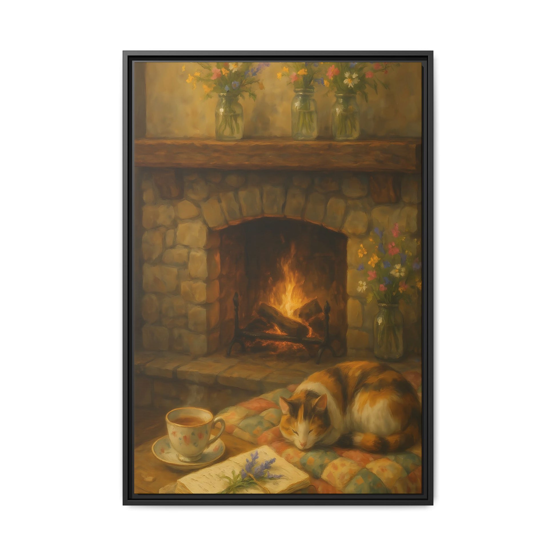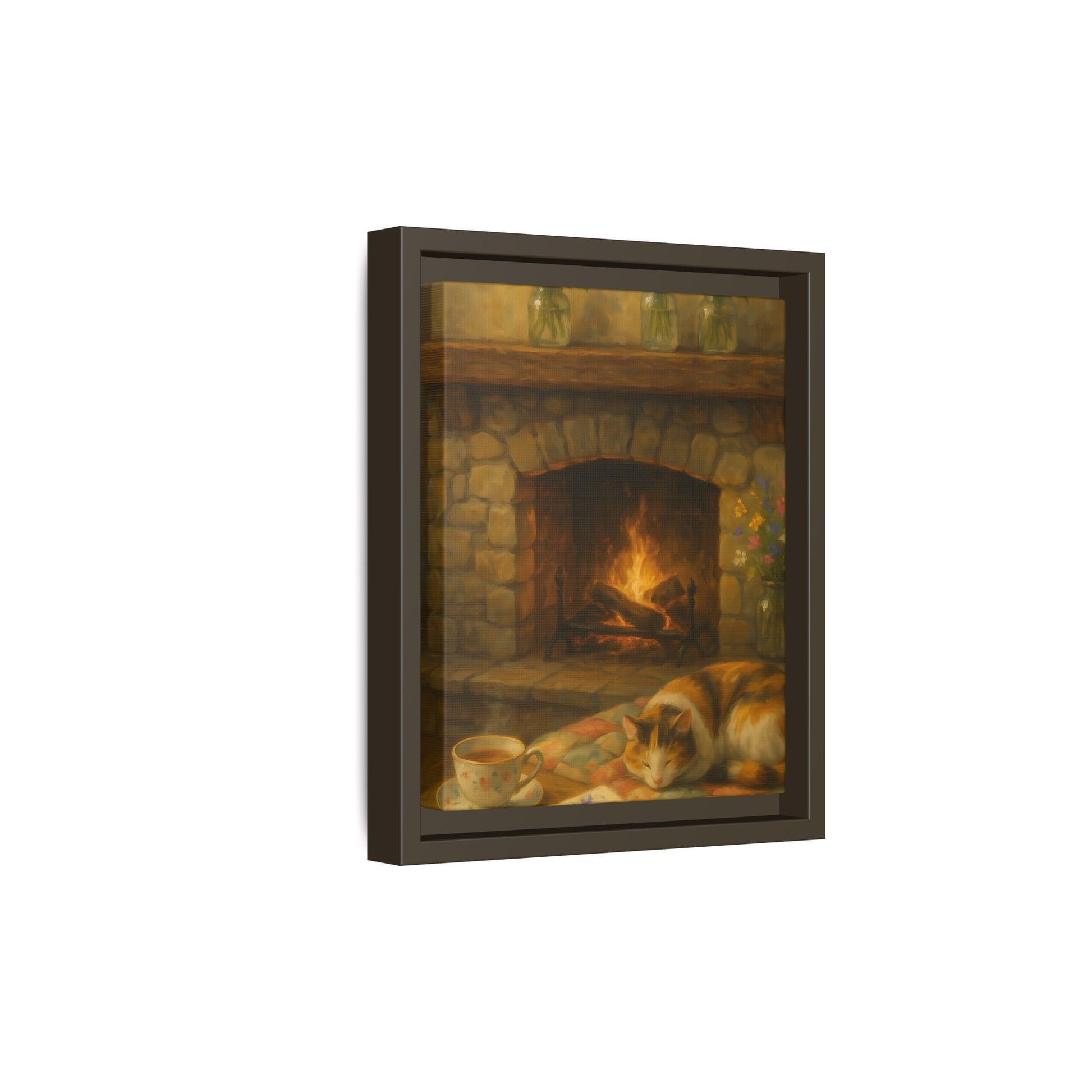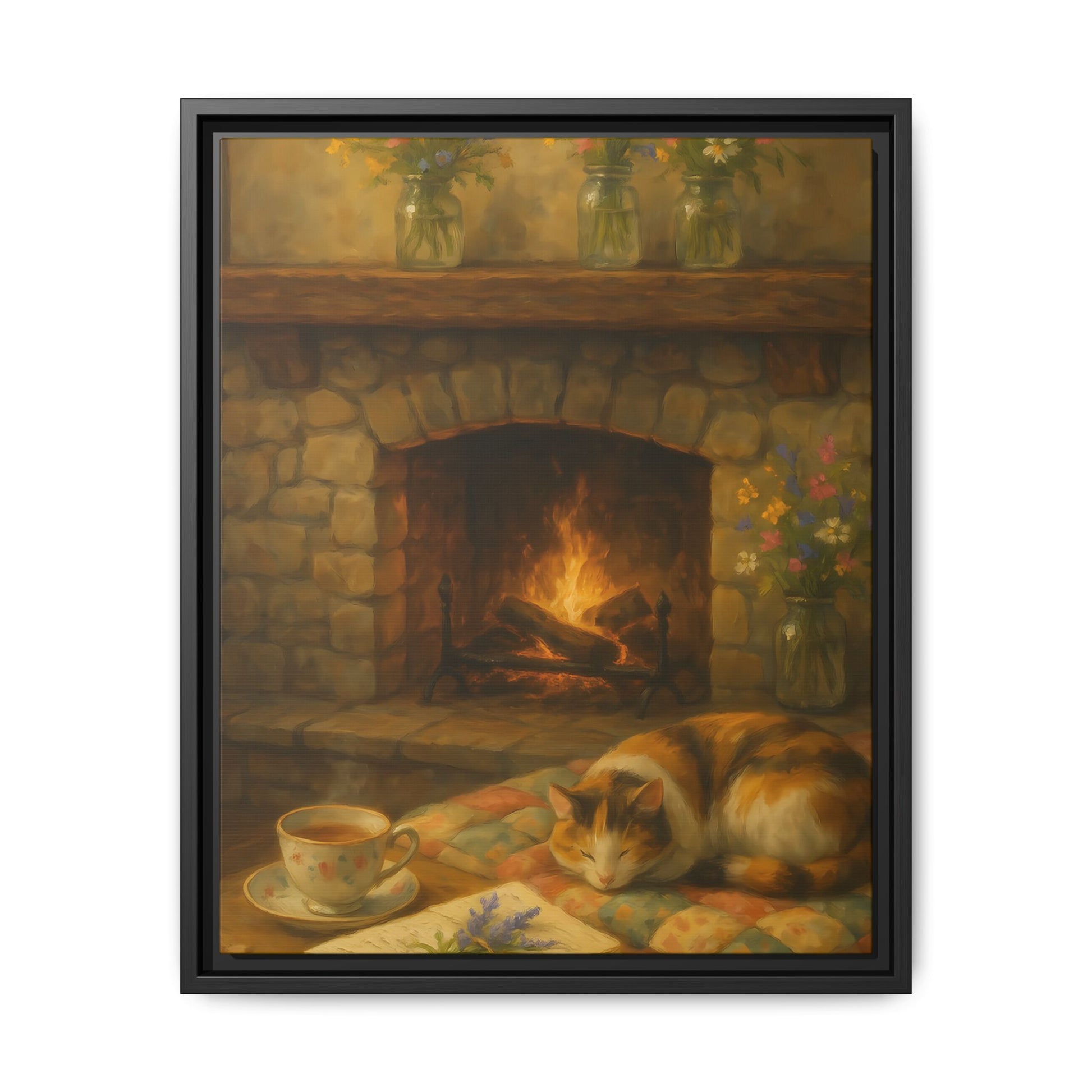 Hearthside Comfort – Framed Matte Canvas with Cat, Fireplace & Tea