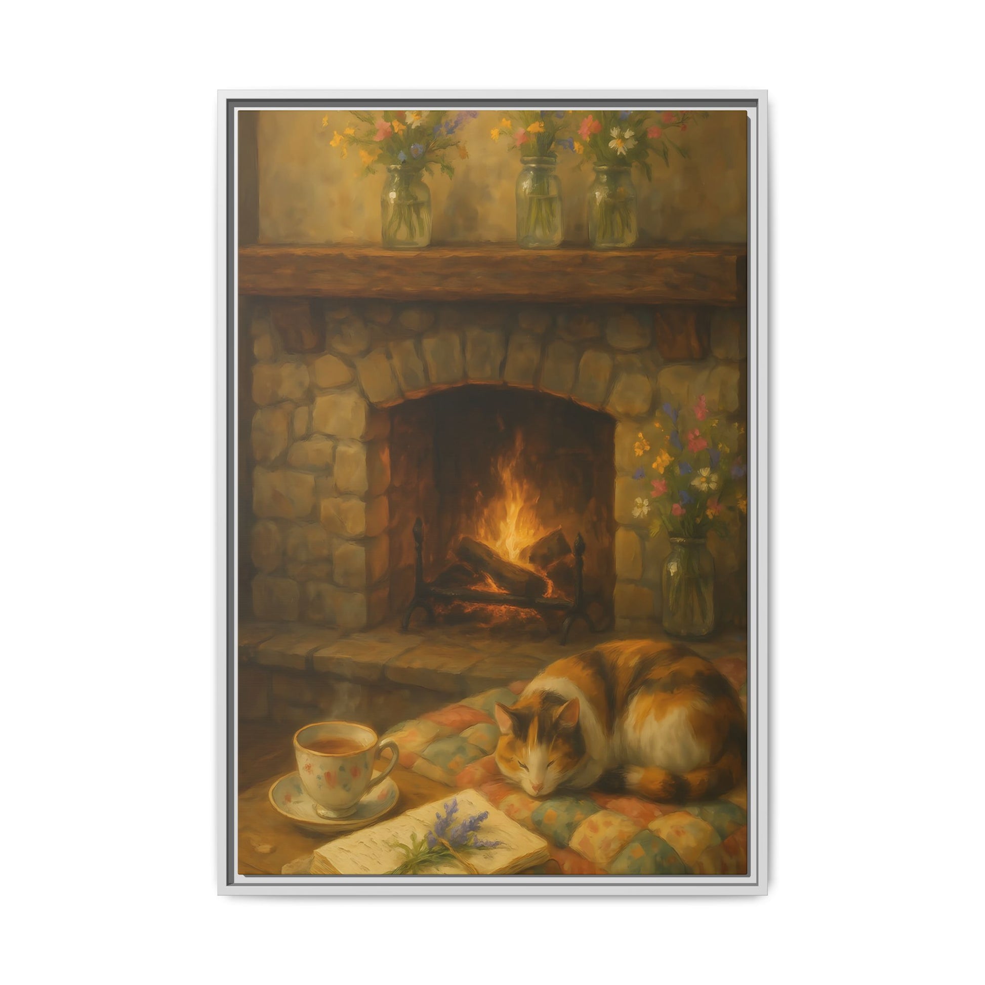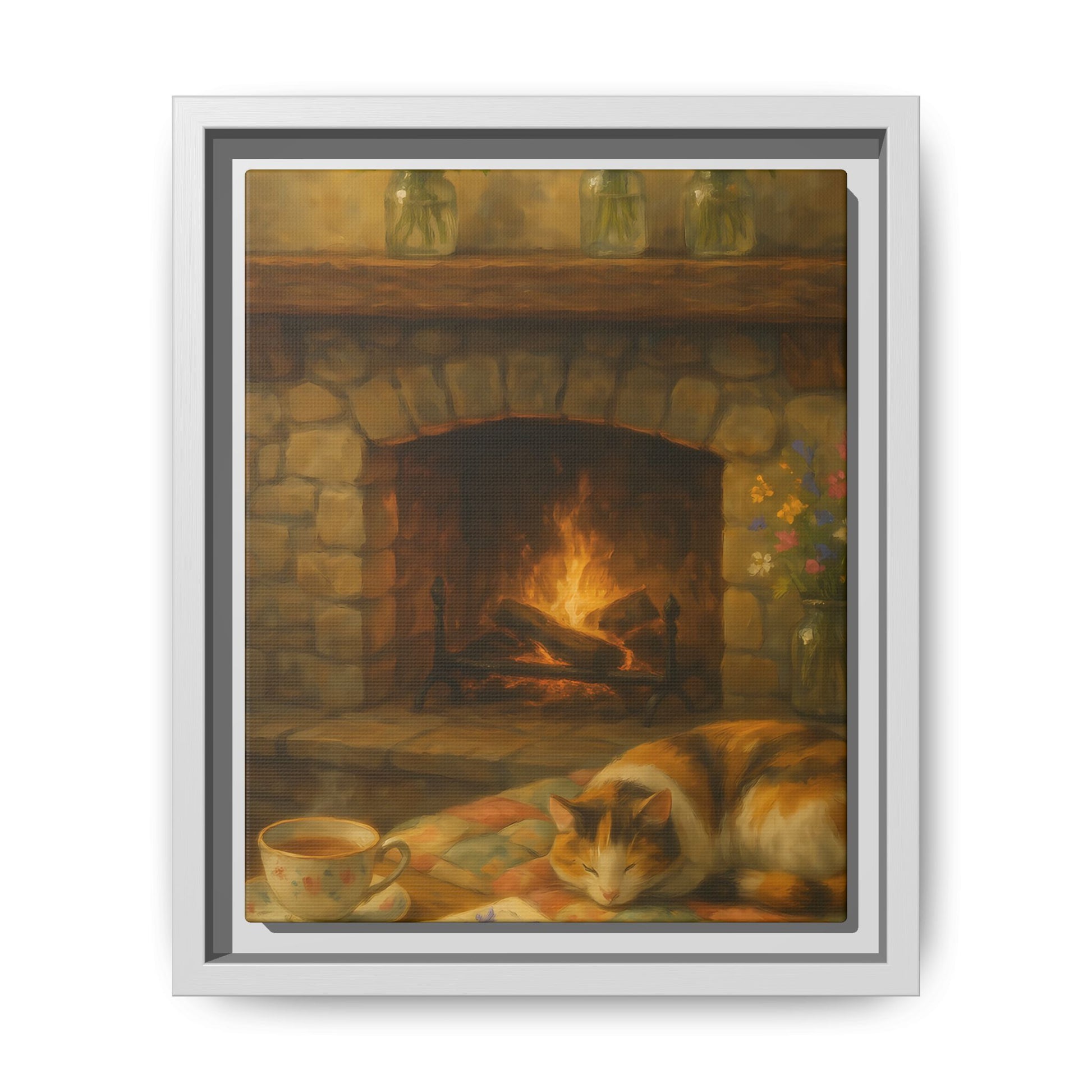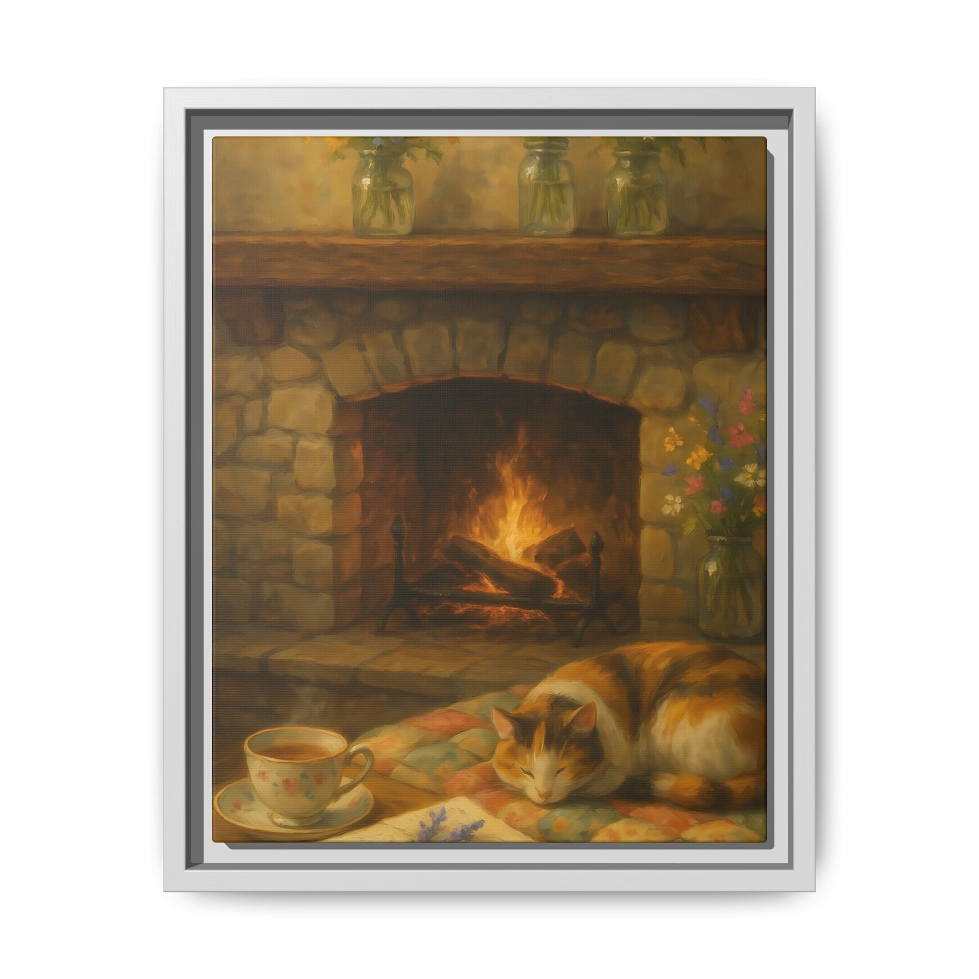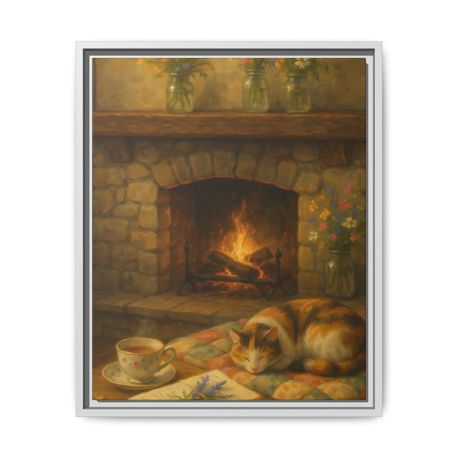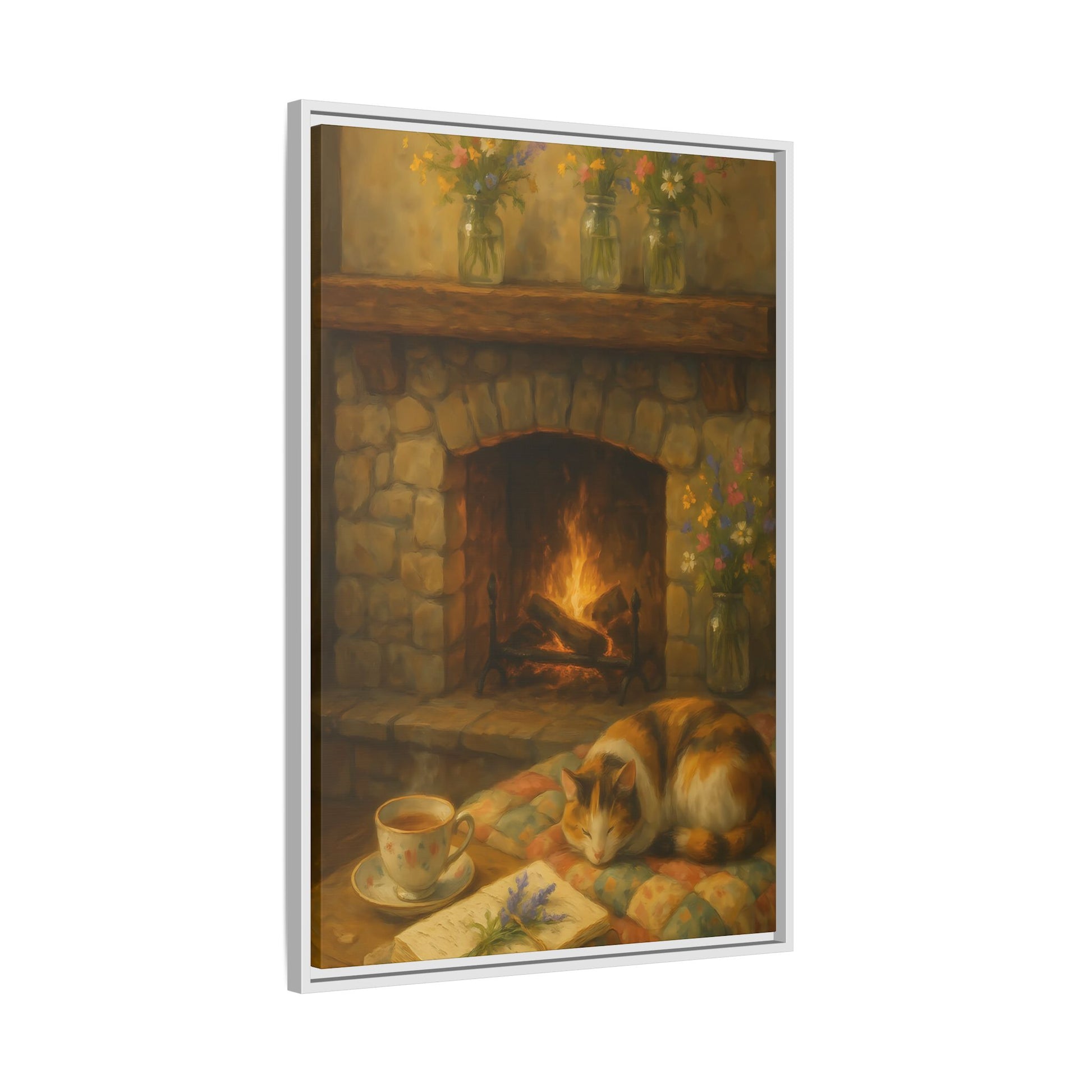 Hearthside Comfort – Framed Matte Canvas with Cat, Fireplace & Tea