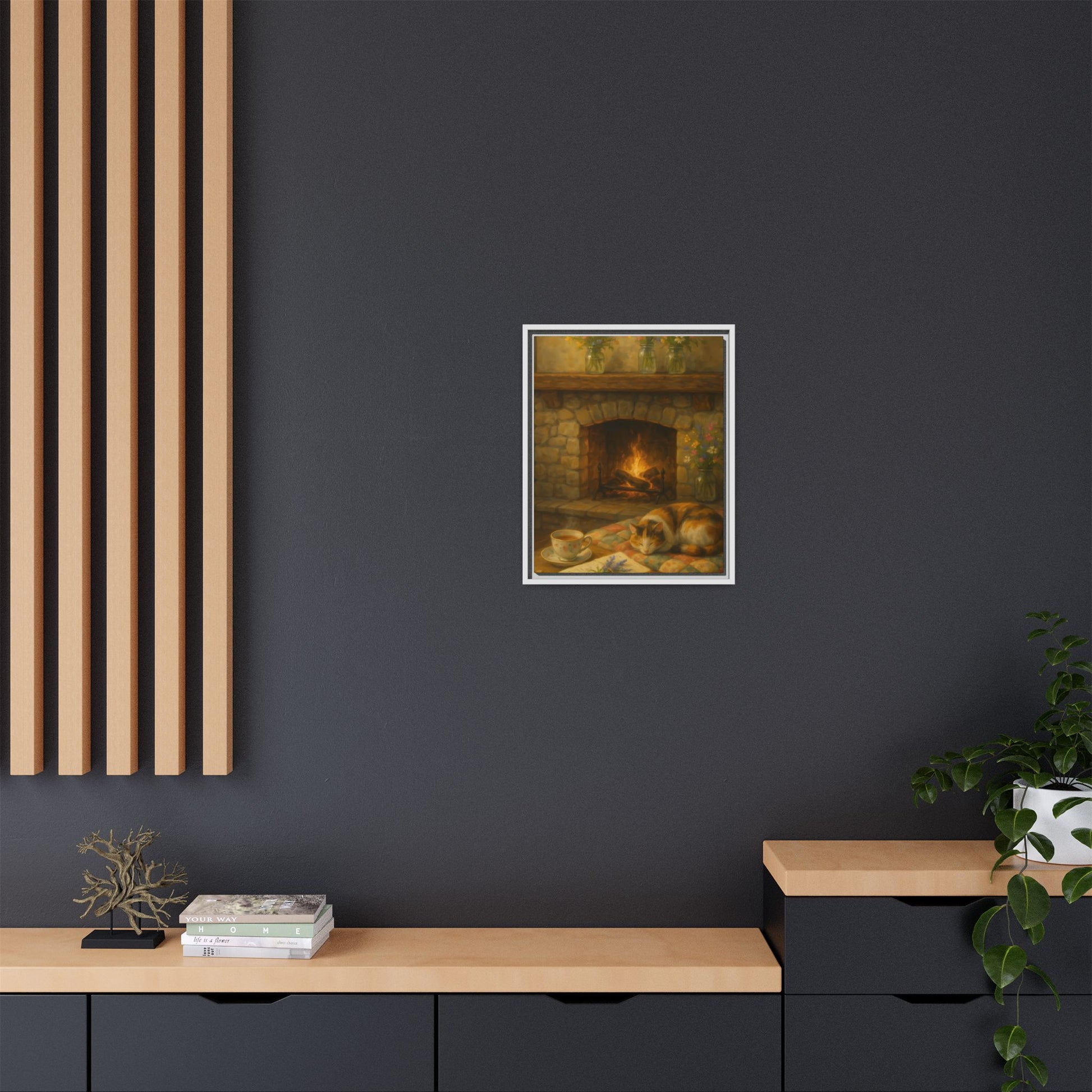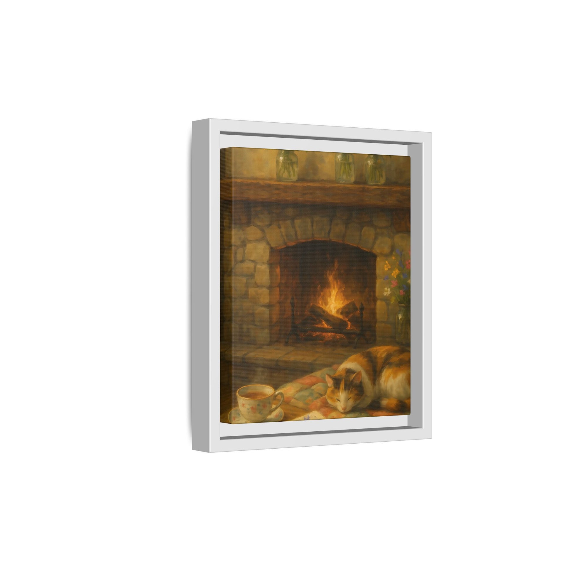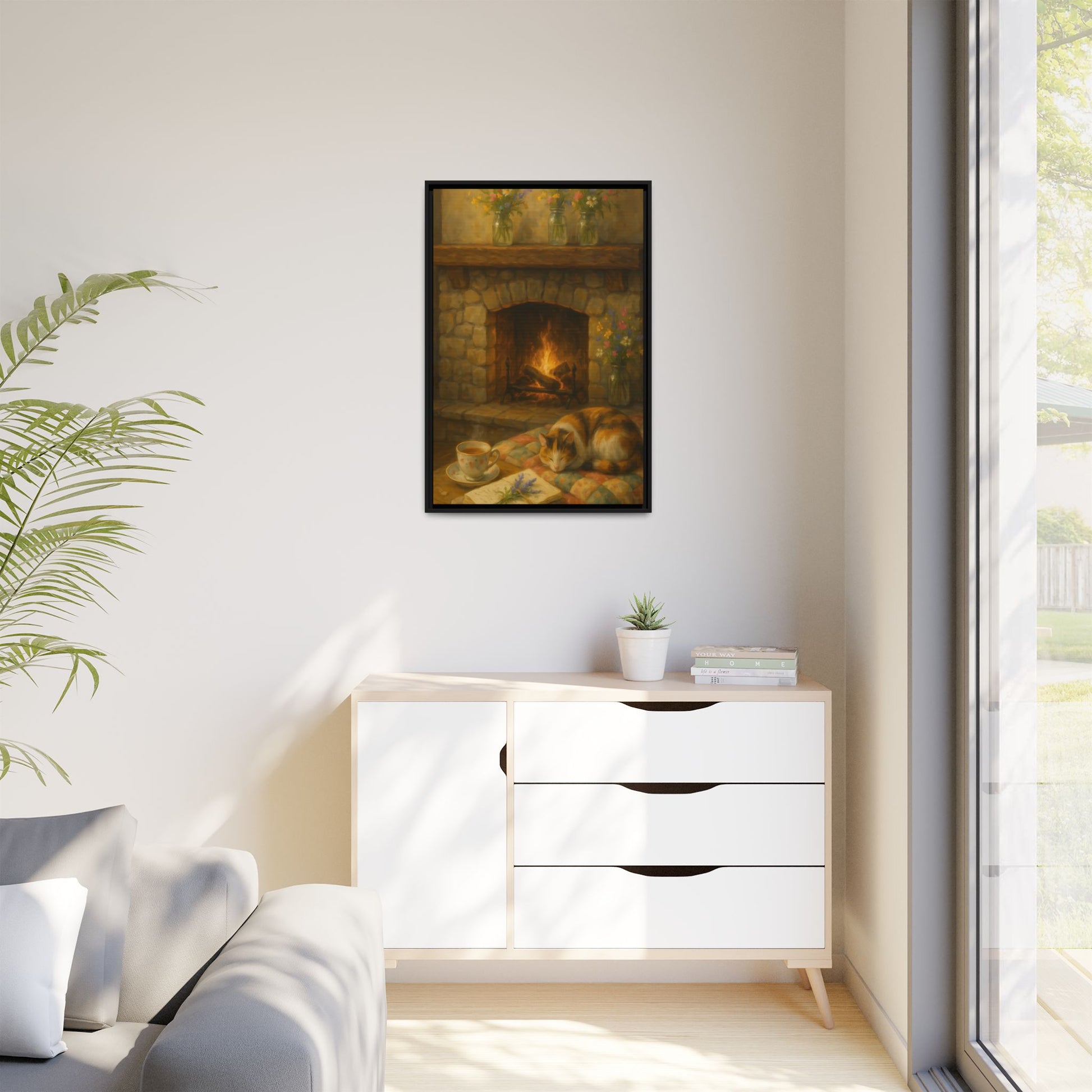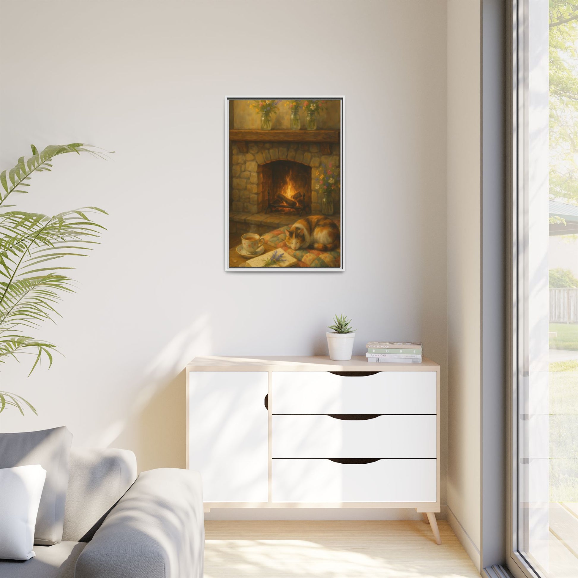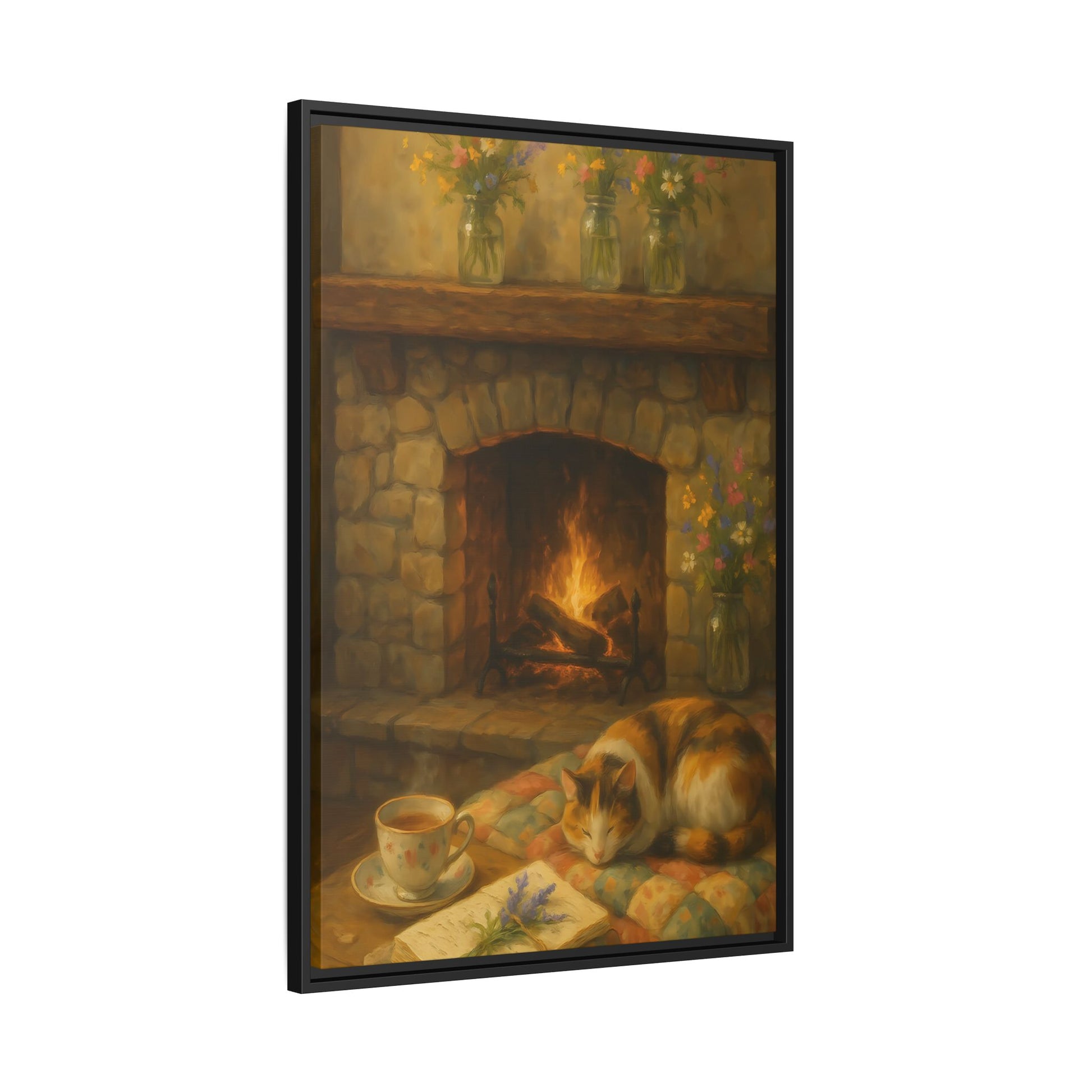 Hearthside Comfort – Framed Matte Canvas with Cat, Fireplace & Tea