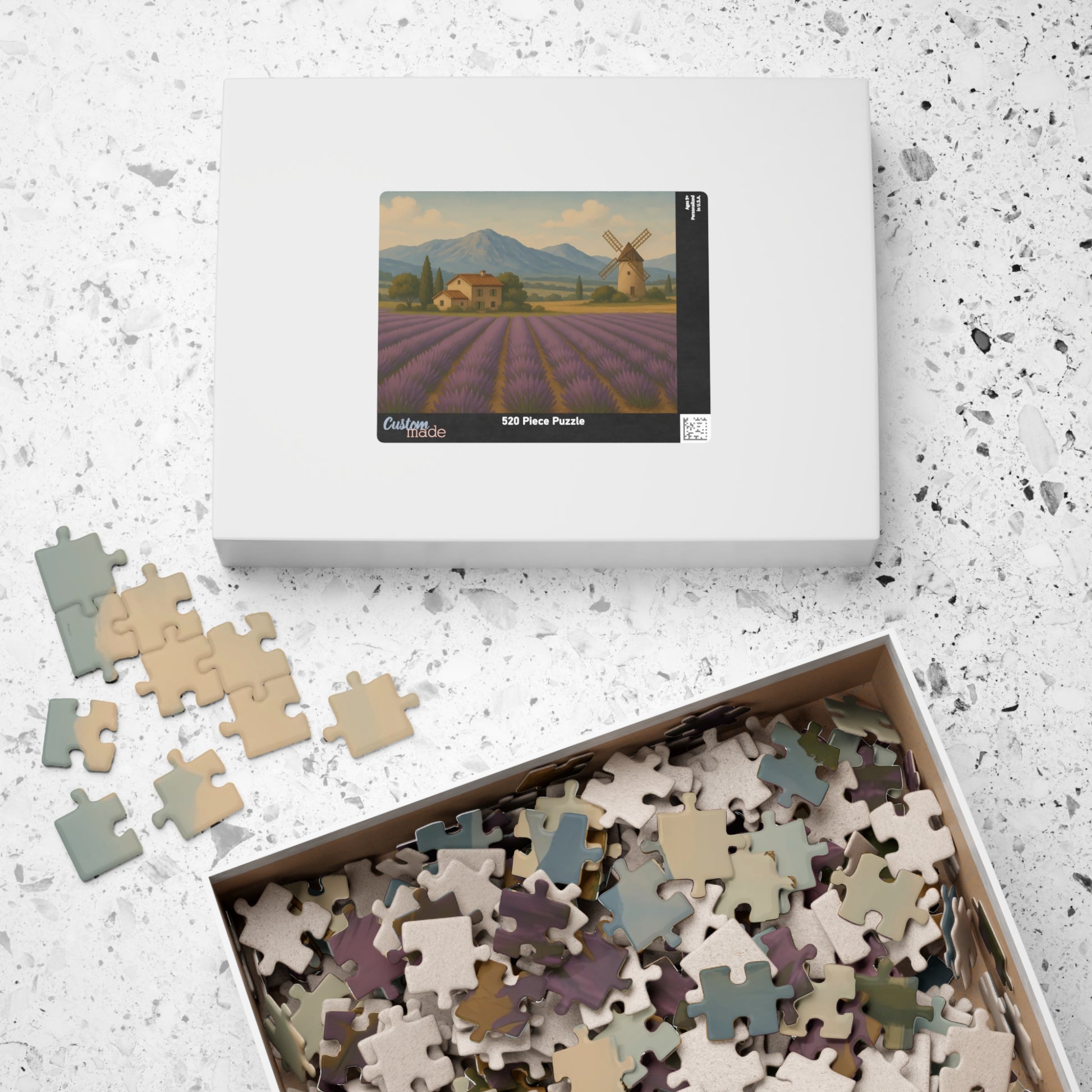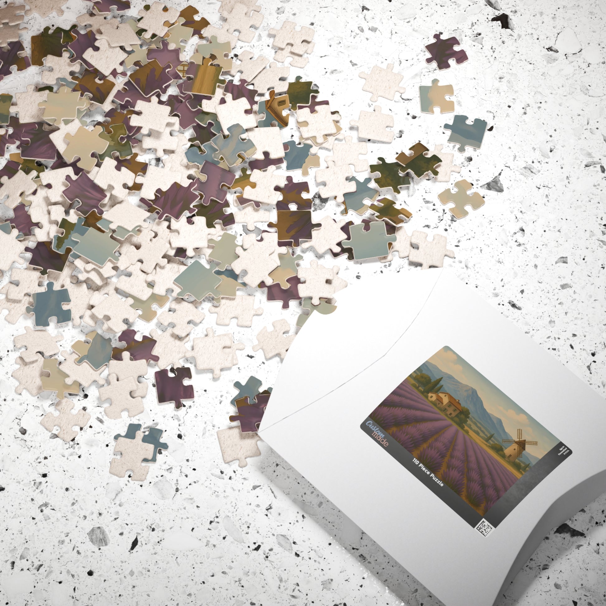 Featuring a charming farmhouse, a rustic windmill, and endless rows of vibrant lavender set against a mountain backdrop, this puzzle captures the essence of rural tranquility.
