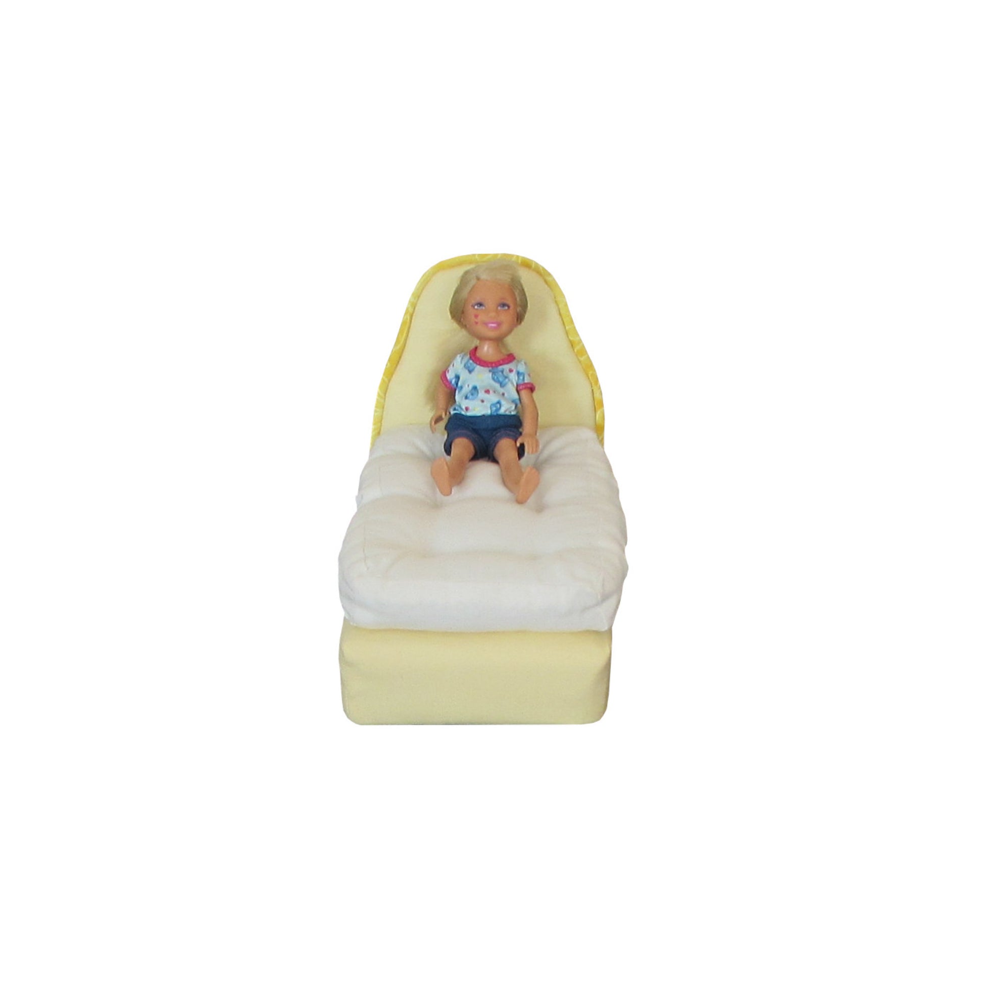 - Doll Bed: 8 1/8 inches long and 3 7/8 inches wide. Made of foam board, padded with polyester batting, and covered in cotton fabric.