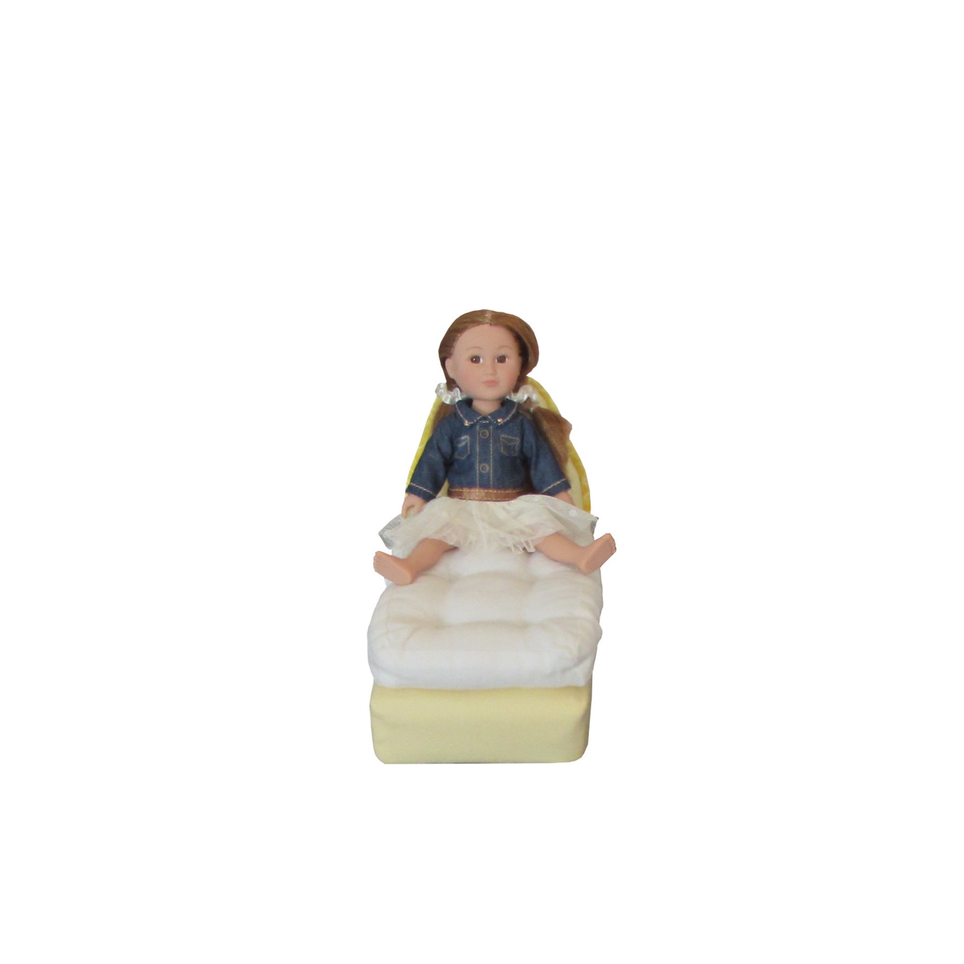 - Tufted Doll Mattress: One inch thick, 7 inches long, and 4 1/4 inches wide. Filled with 100% Premium Polyester Fiber Fill, which is non-allergenic and covered in cotton fabric.