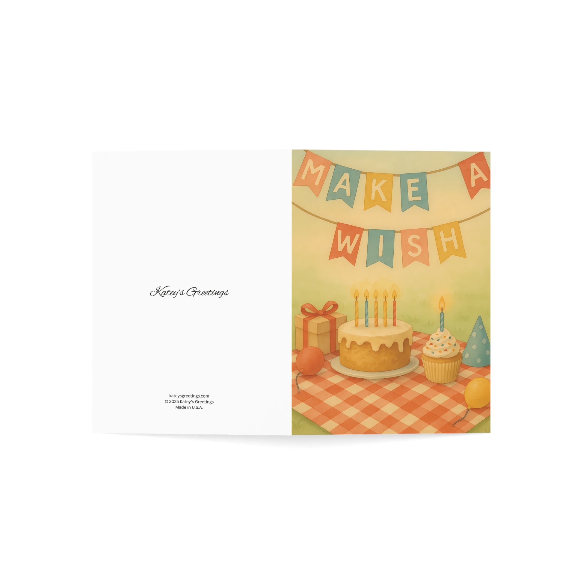 Bring cheerful charm to any celebration with this Make a Wish Birthday Greeting Card, featuring a delightful picnic scene complete with a cake topped with glowing candles, a frosted cupcake, colorful balloons, and a gift box.