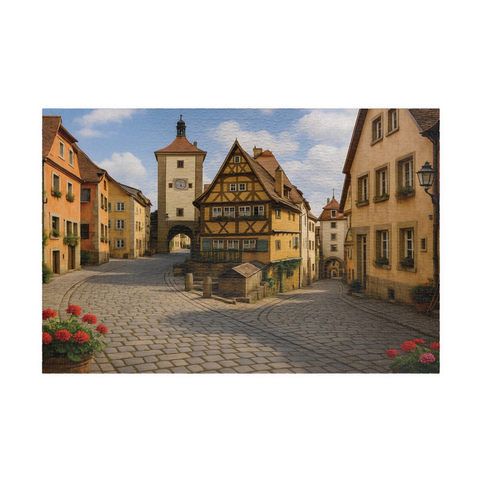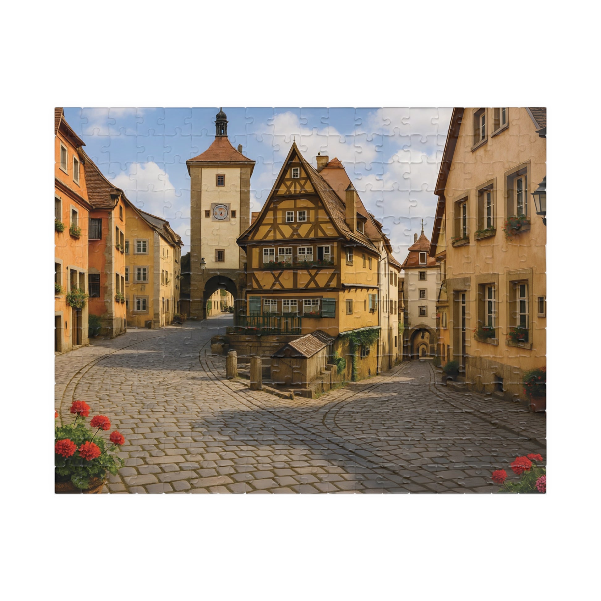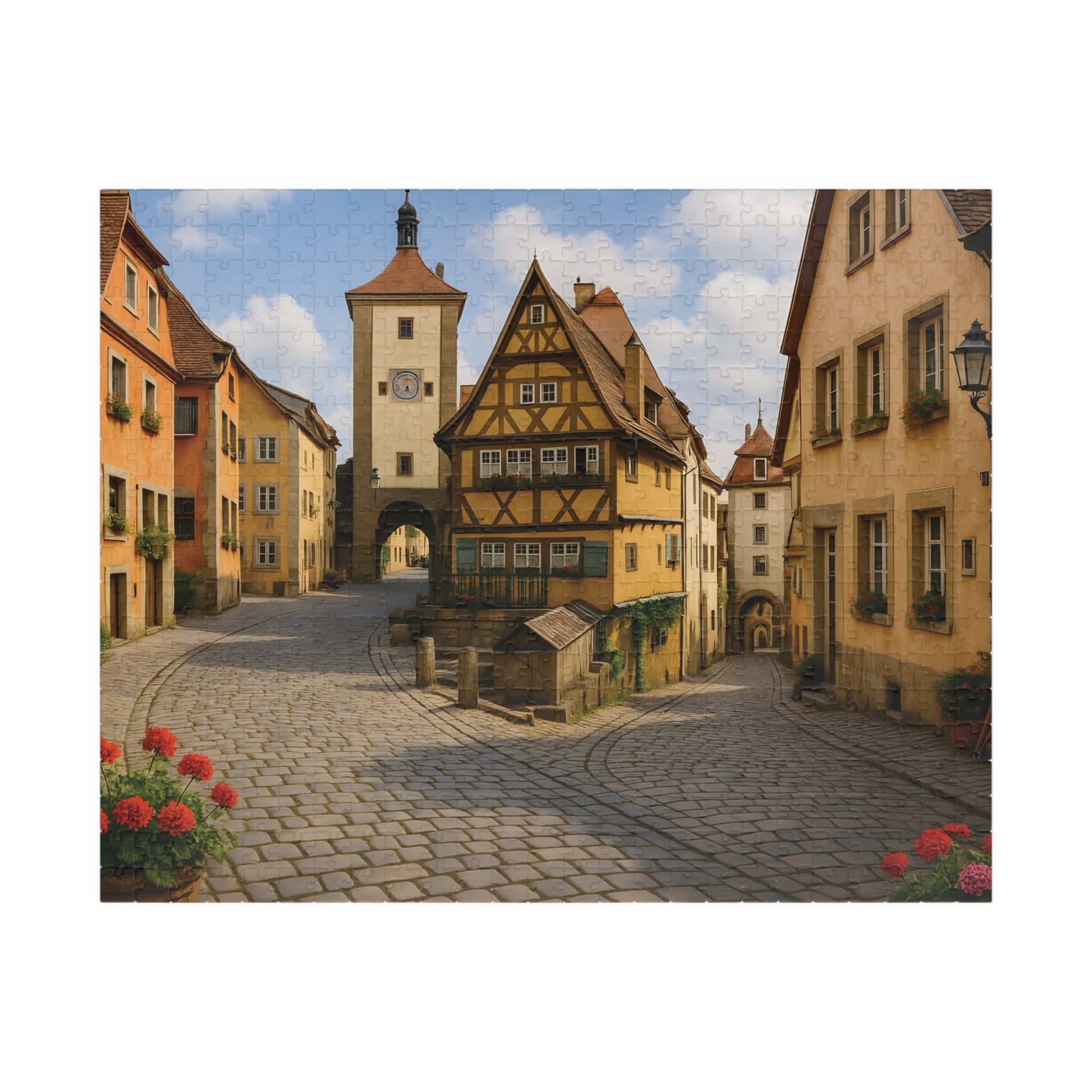 Step back in time with the Medieval German Village Puzzle, featuring a breathtaking cobblestone street lined with half-timbered houses, colorful flower boxes, and a charming clock tower in the background.
