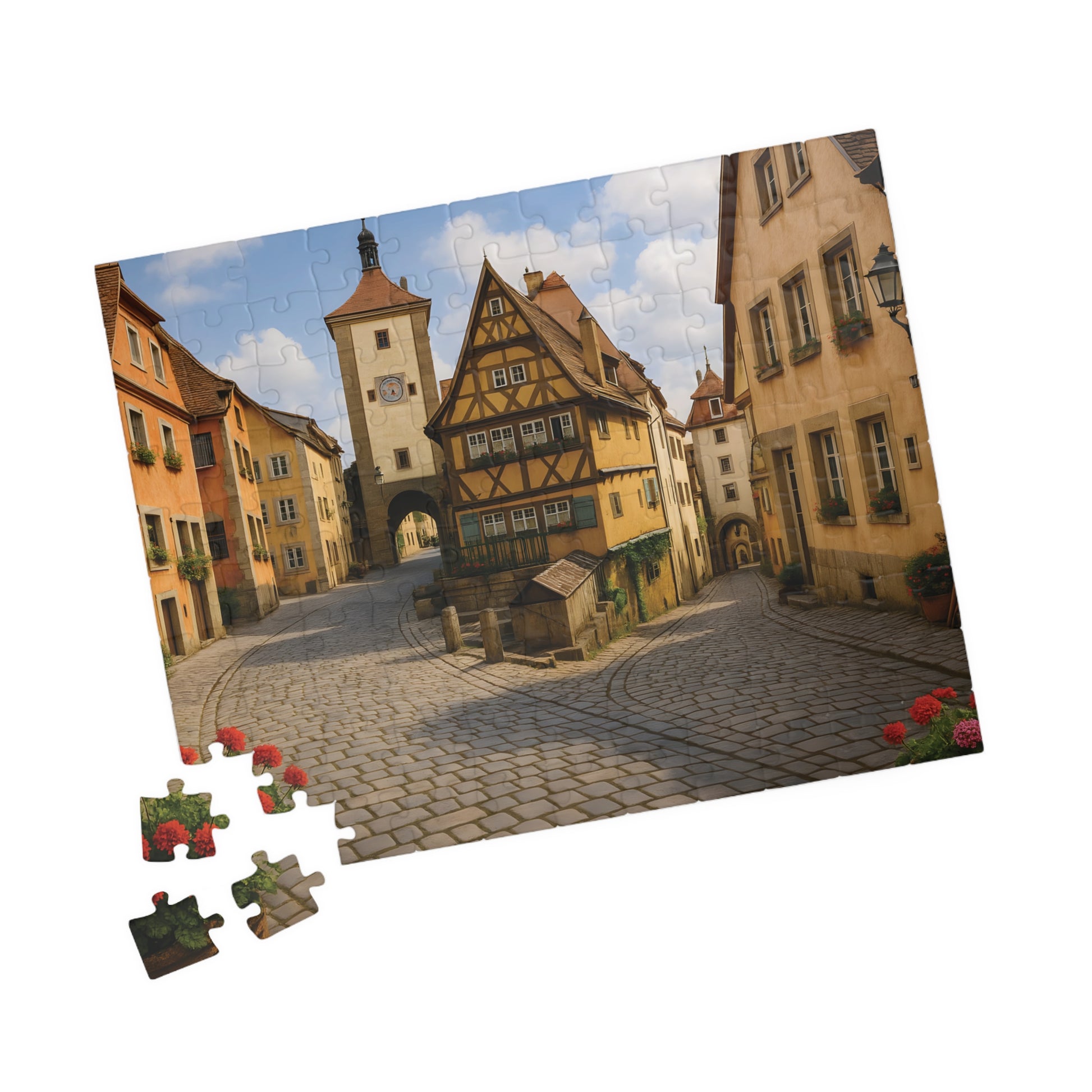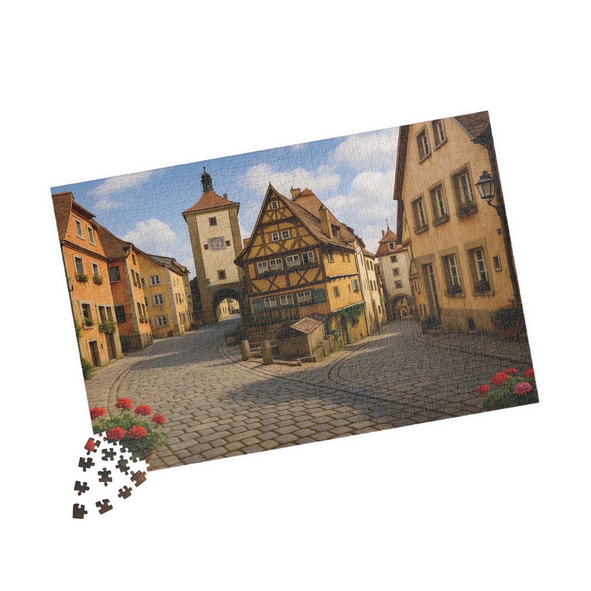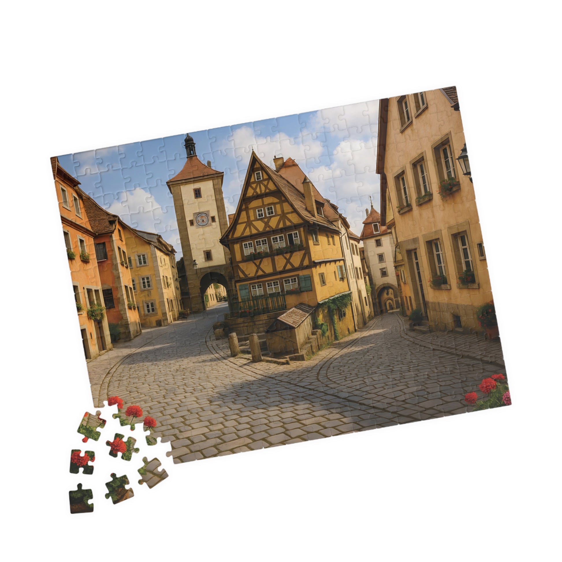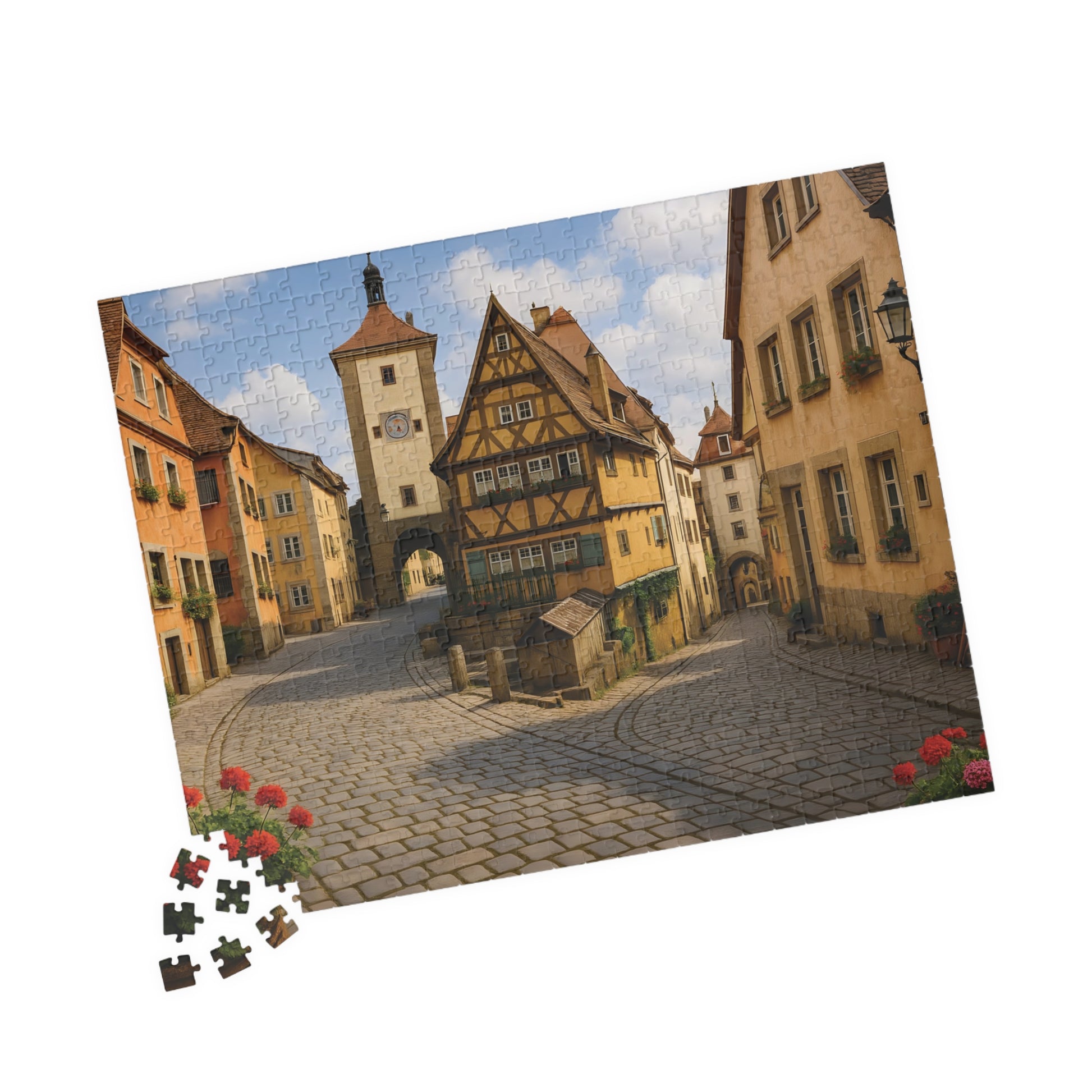Step back in time with the Medieval German Village Puzzle, featuring a breathtaking cobblestone street lined with half-timbered houses, colorful flower boxes, and a charming clock tower in the background.