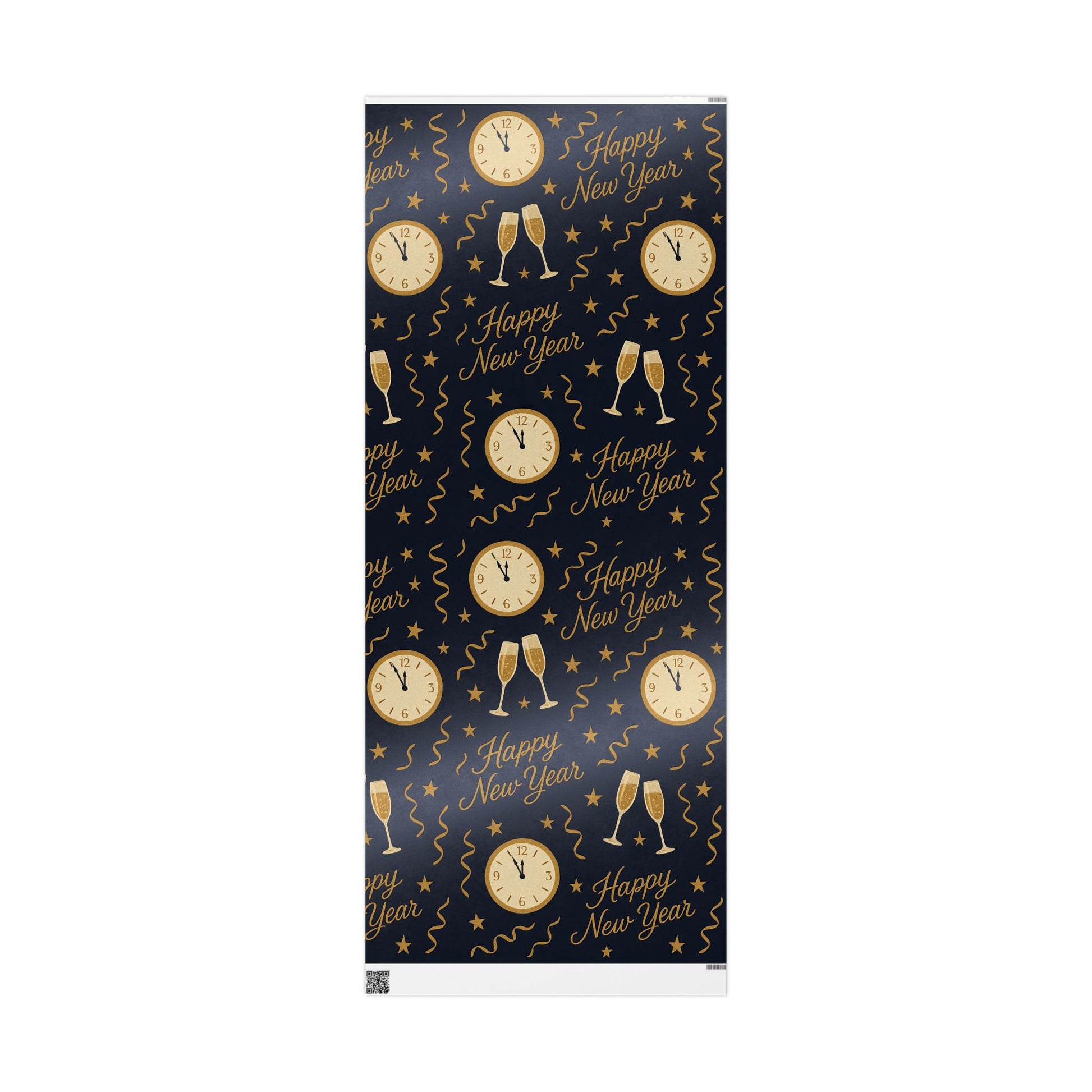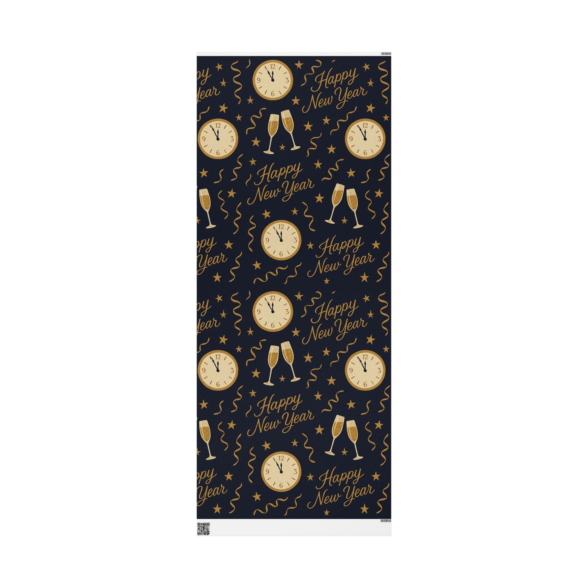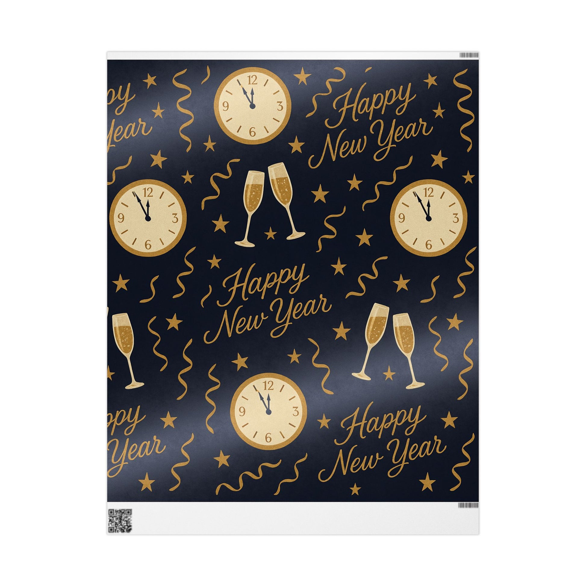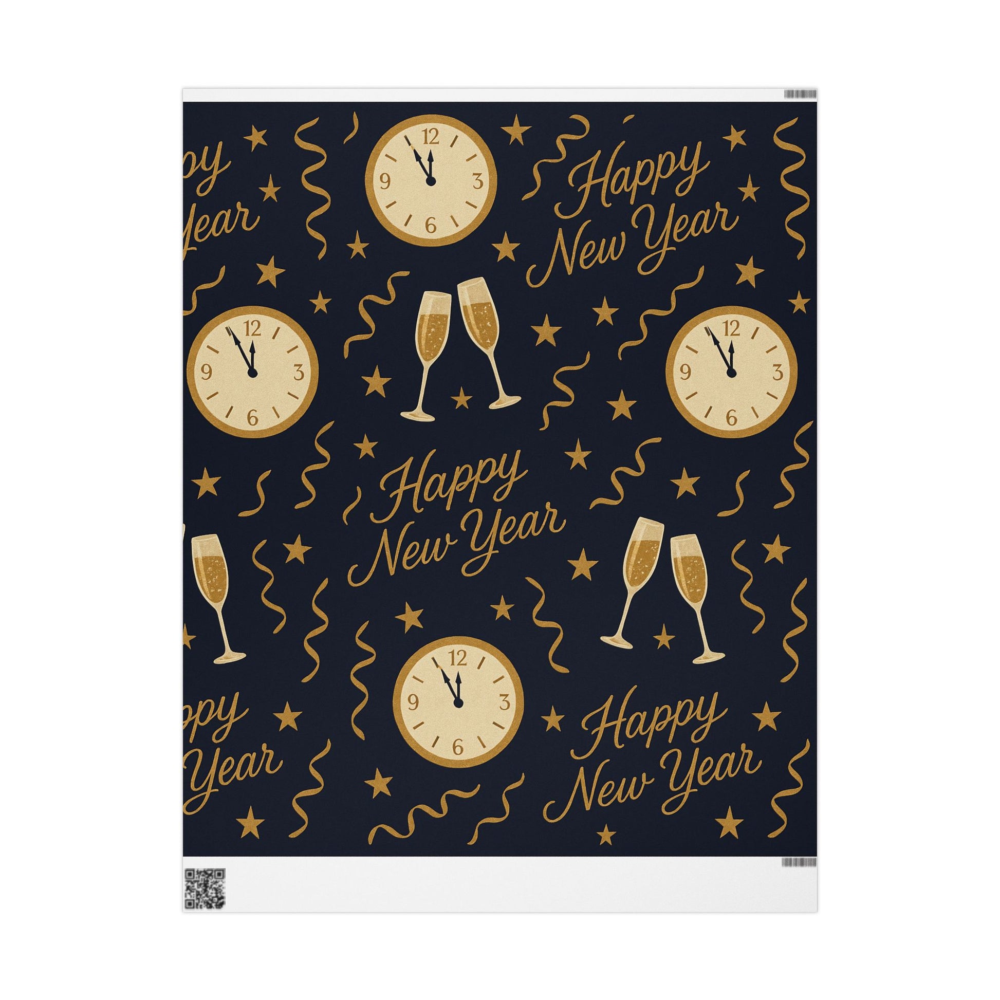 Ring in the new year with style using our Midnight Celebration New Year Wrapping Paper, featuring elegant champagne glasses, countdown clocks, festive streamers, and bold “Happy New Year” typography — all in gold tones against a deep navy backdrop.