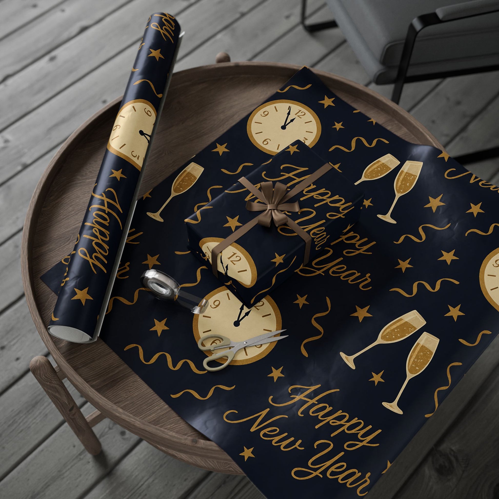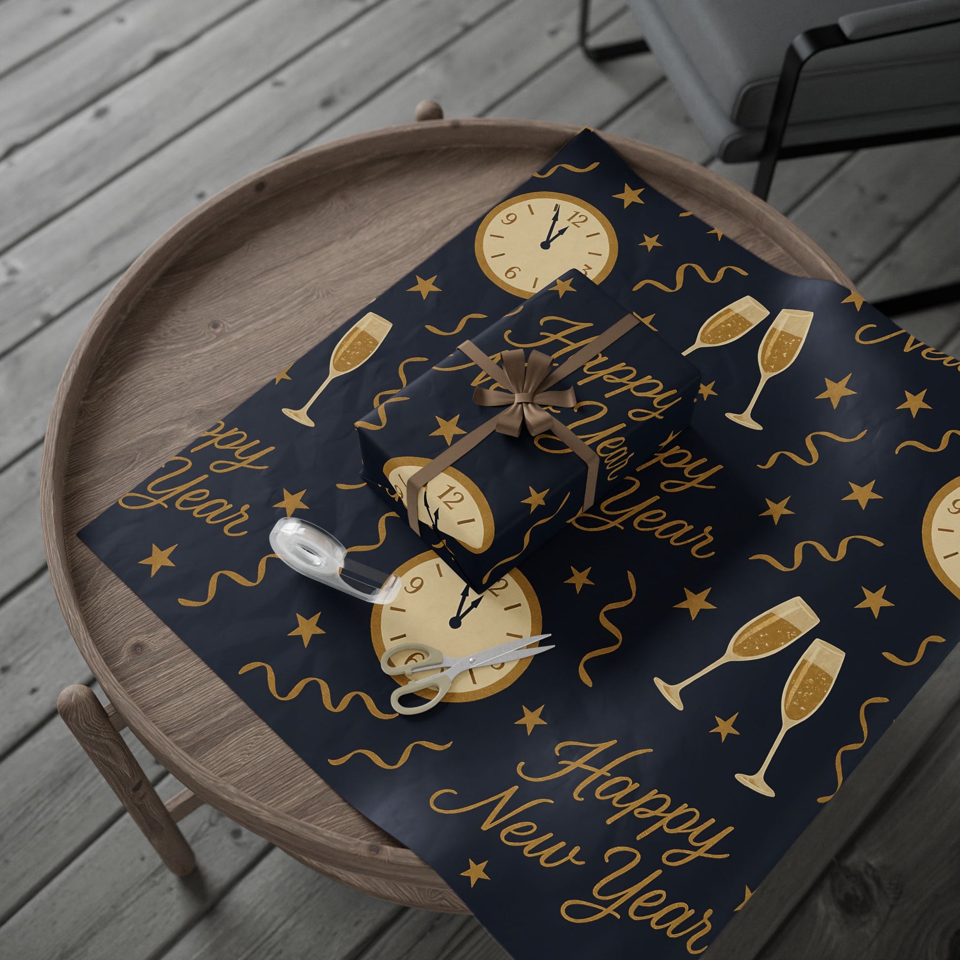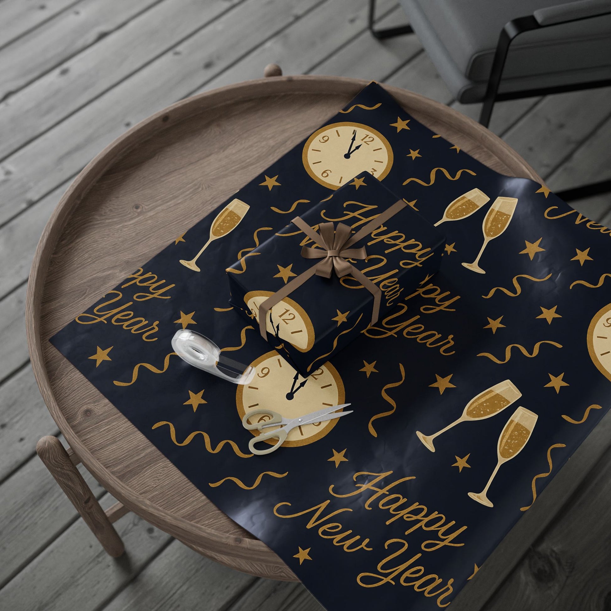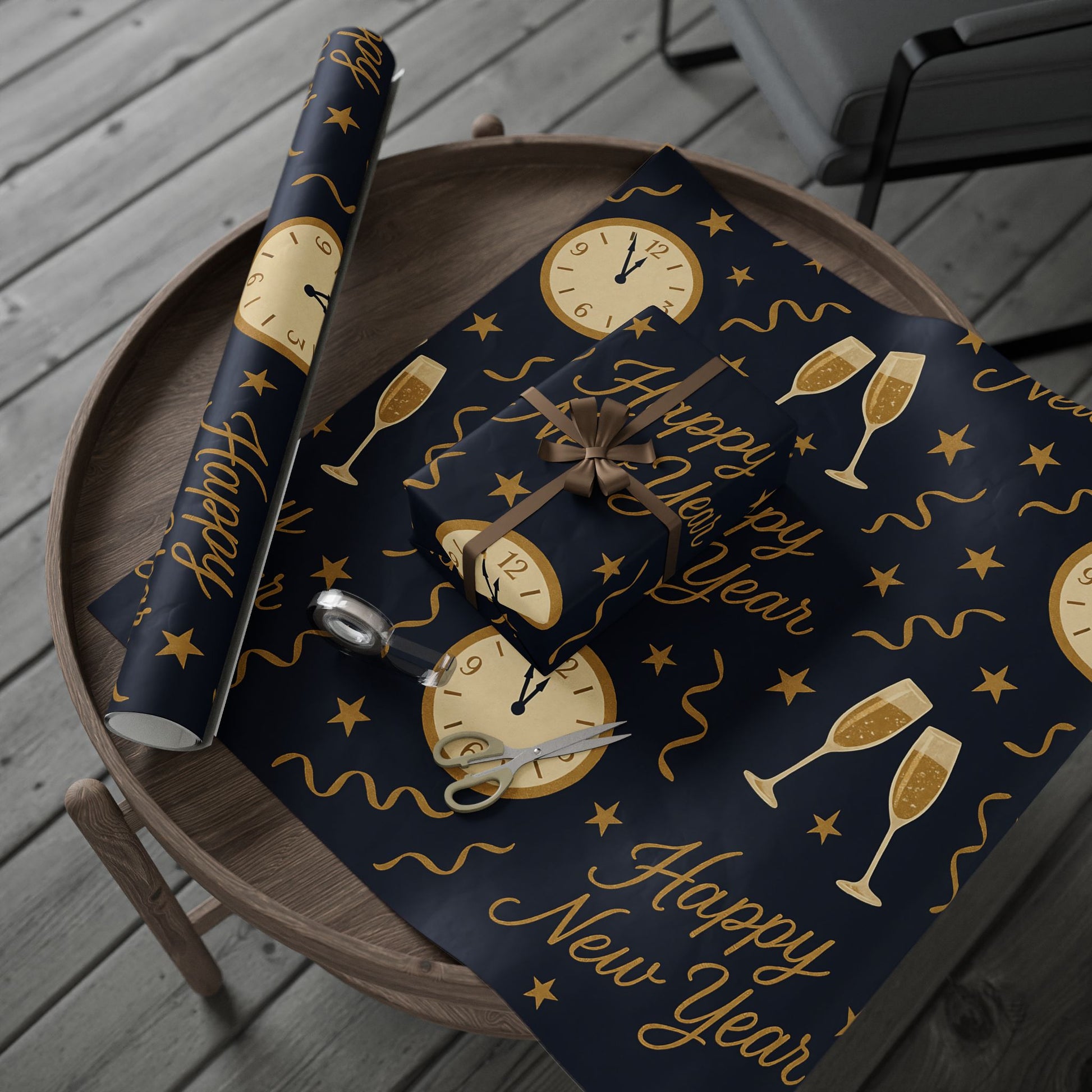 Ring in the new year with style using our Midnight Celebration New Year Wrapping Paper, featuring elegant champagne glasses, countdown clocks, festive streamers, and bold “Happy New Year” typography — all in gold tones against a deep navy backdrop.