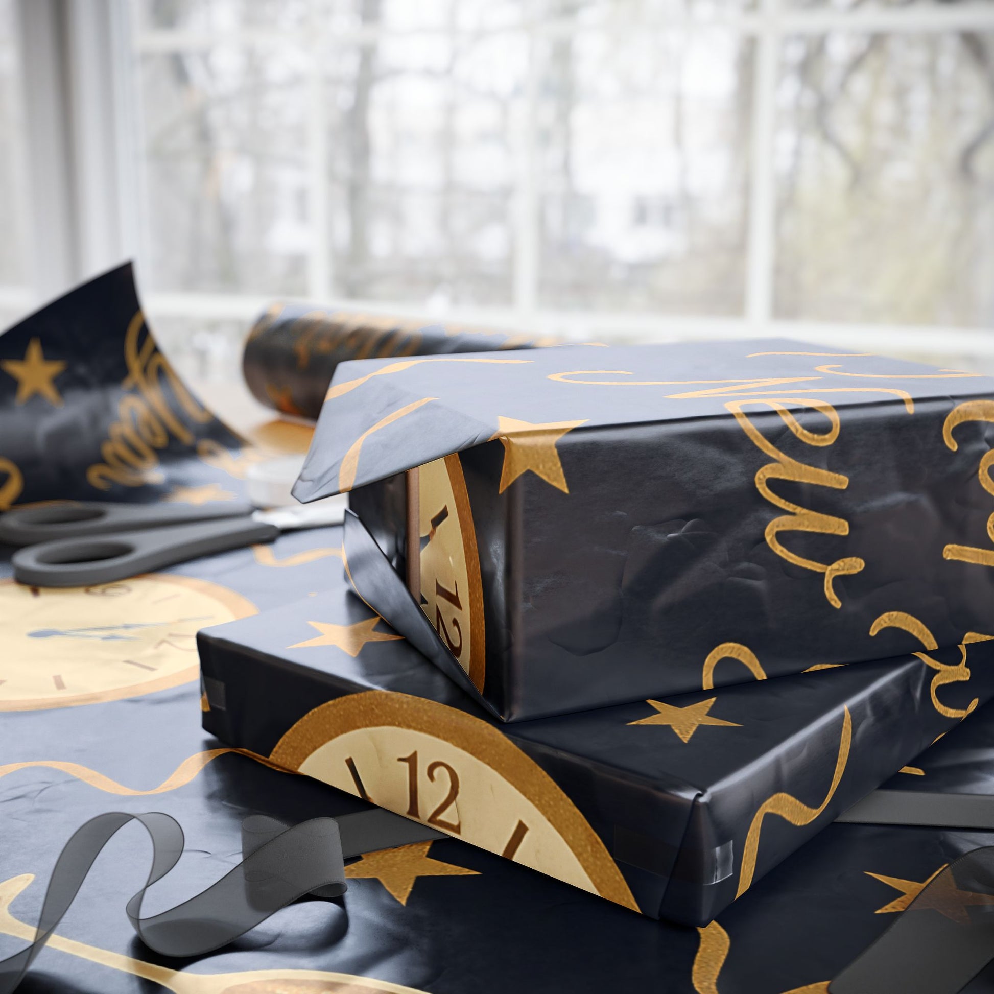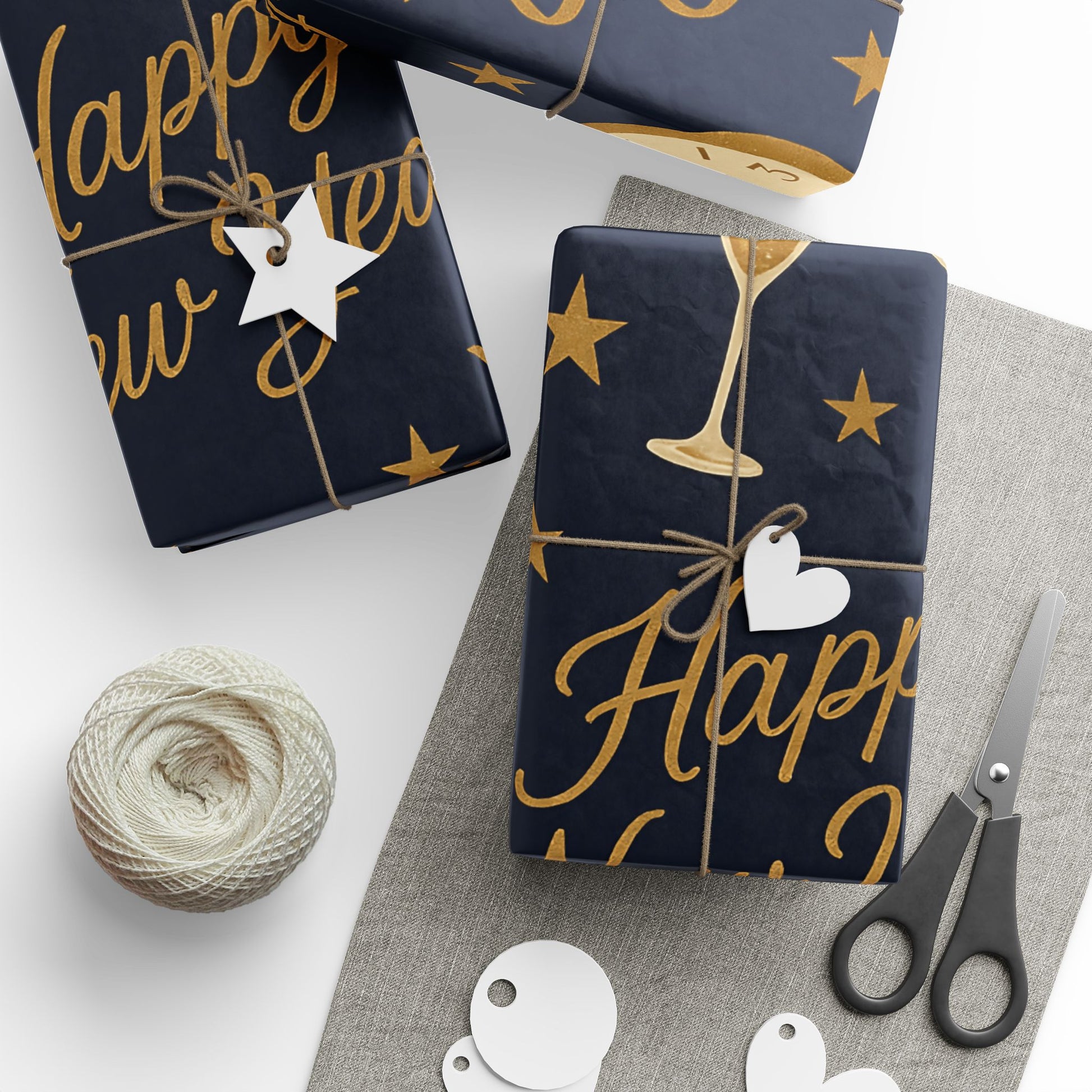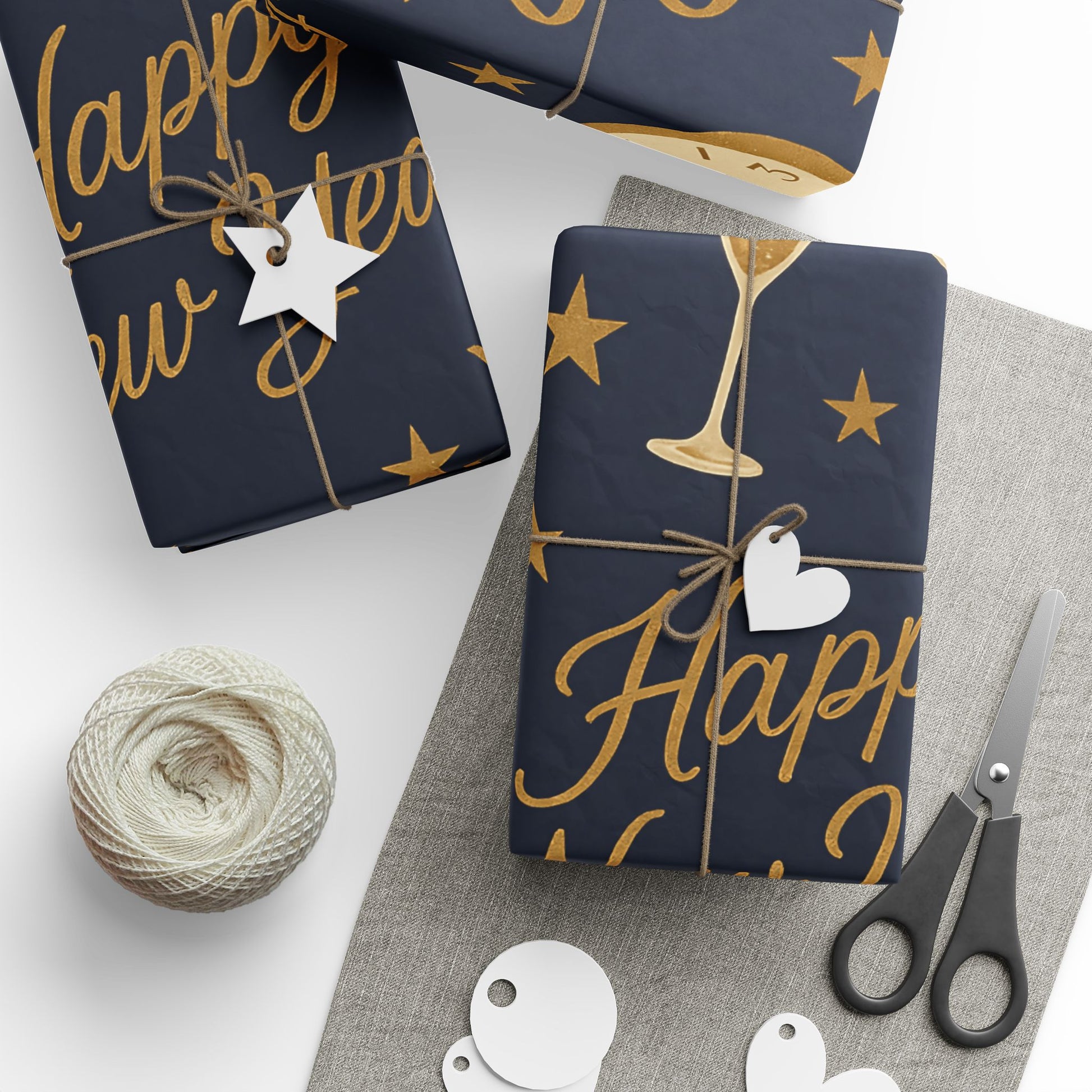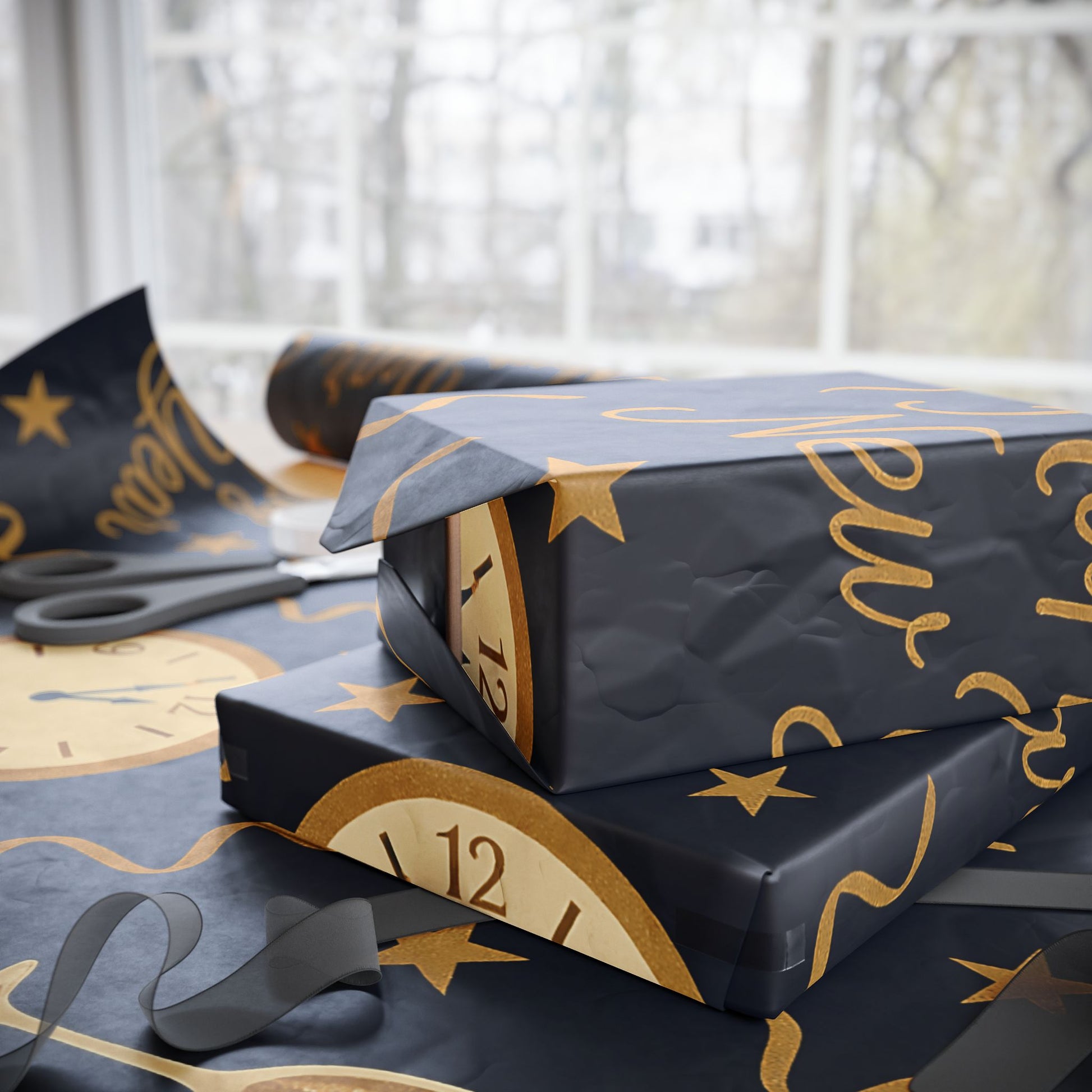Ring in the new year with style using our Midnight Celebration New Year Wrapping Paper, featuring elegant champagne glasses, countdown clocks, festive streamers, and bold “Happy New Year” typography — all in gold tones against a deep navy backdrop.
