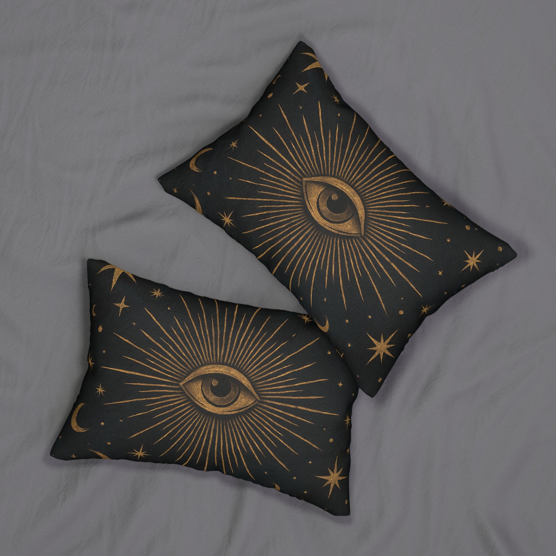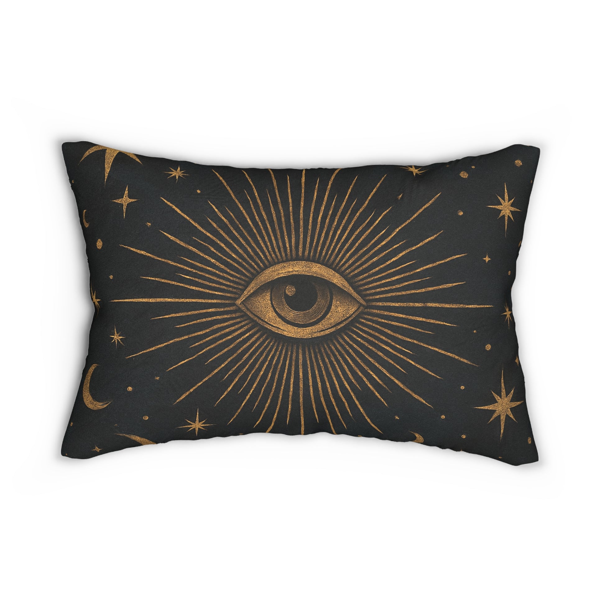 Add a touch of mystic charm to your home with this Mystic Eye & Celestial Lumbar Pillow, featuring a radiant all-seeing eye surrounded by golden starbursts, moons, and constellations on a deep black background.