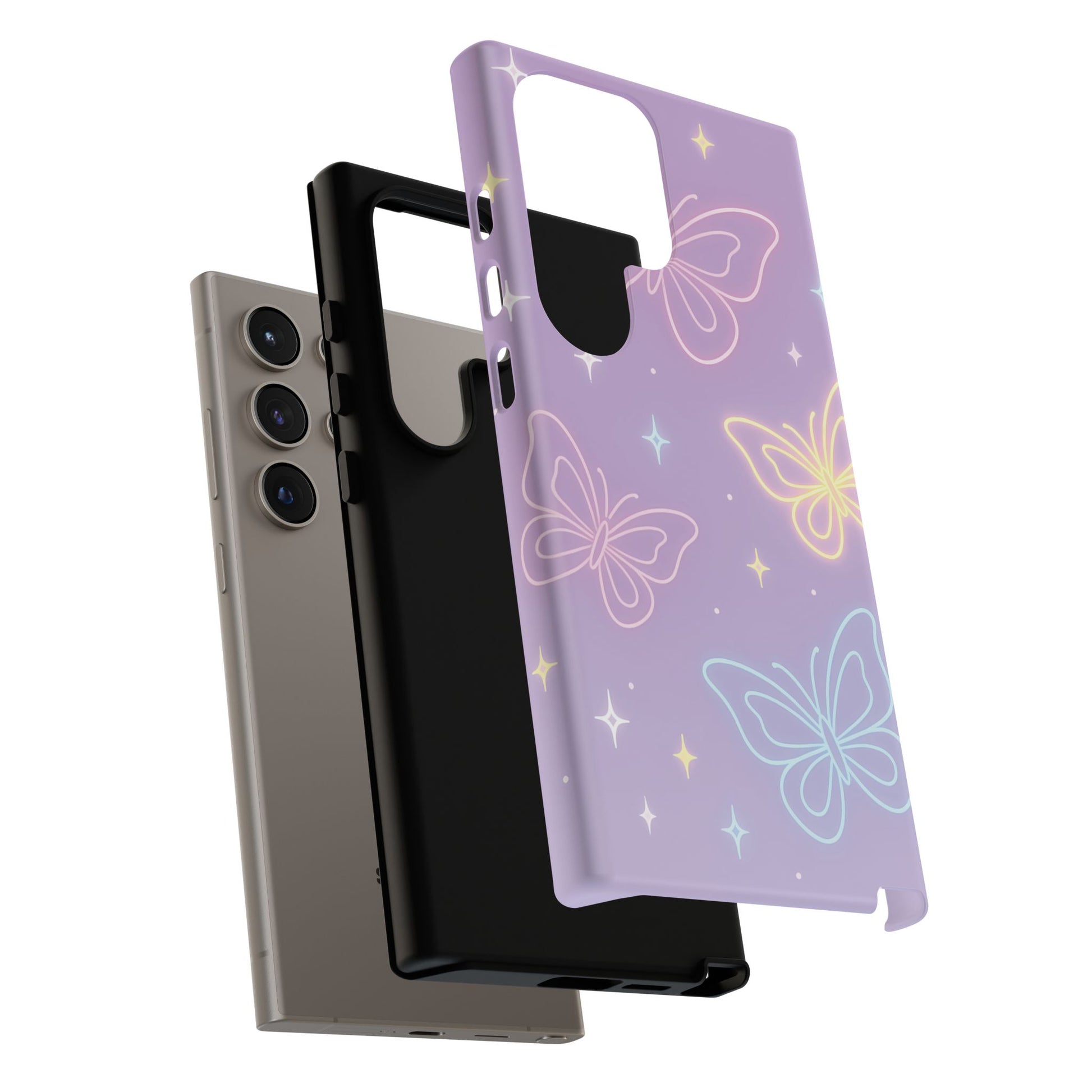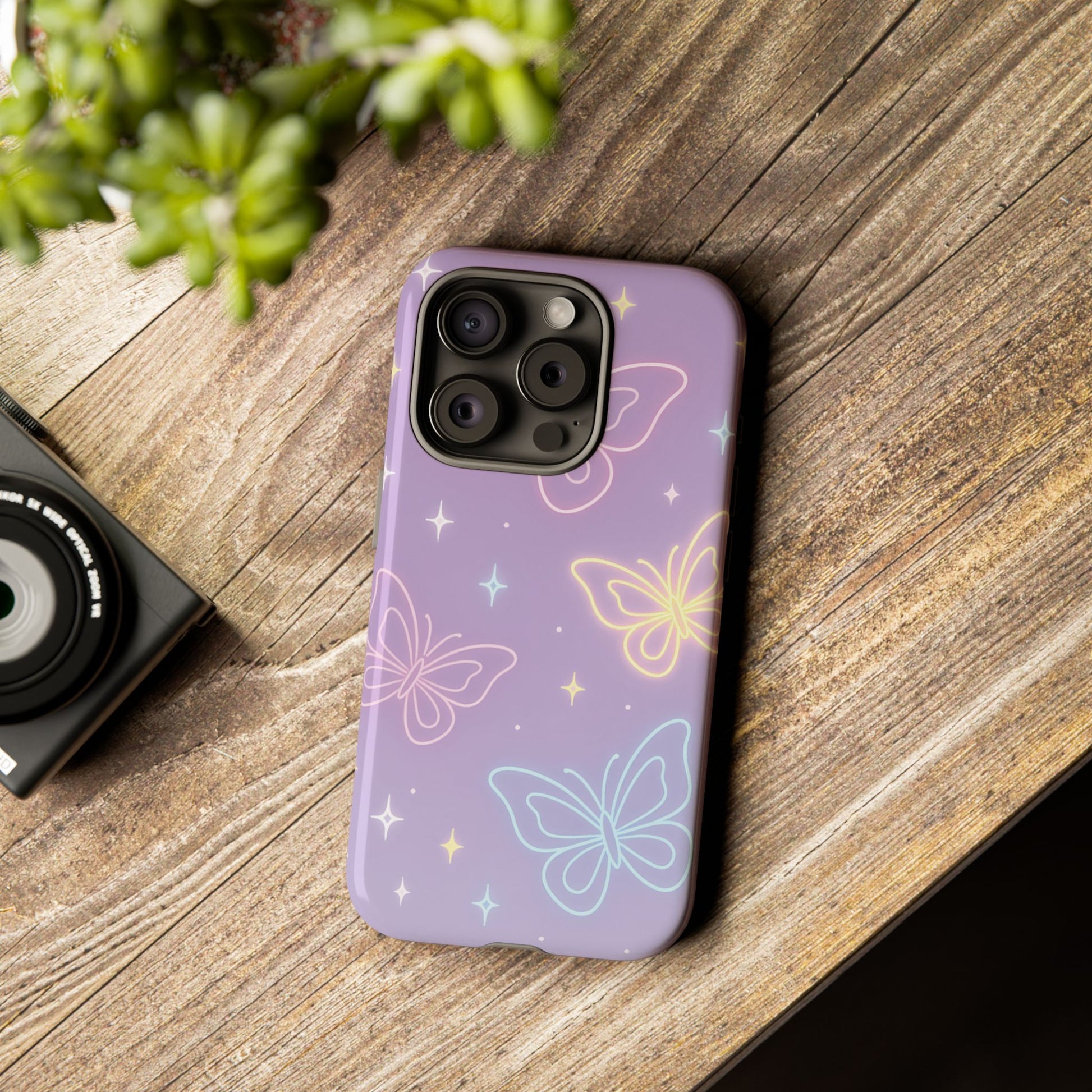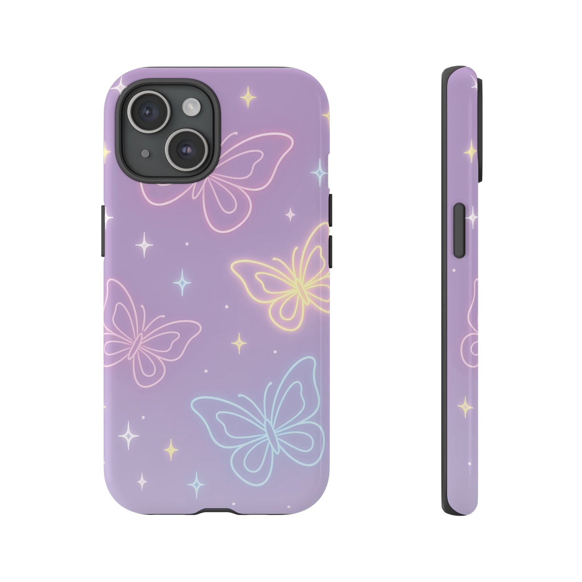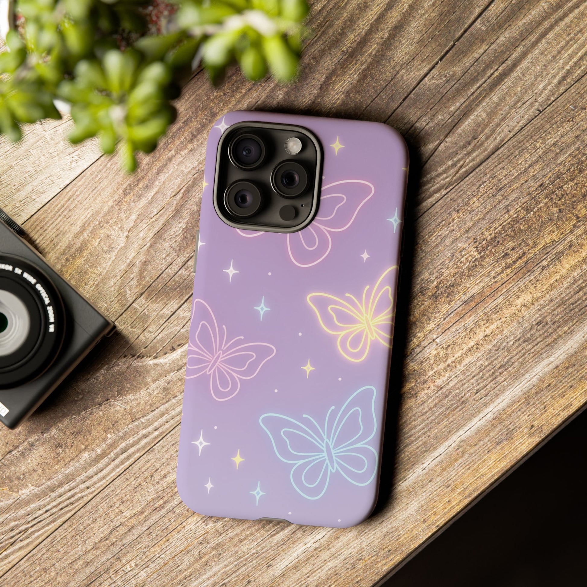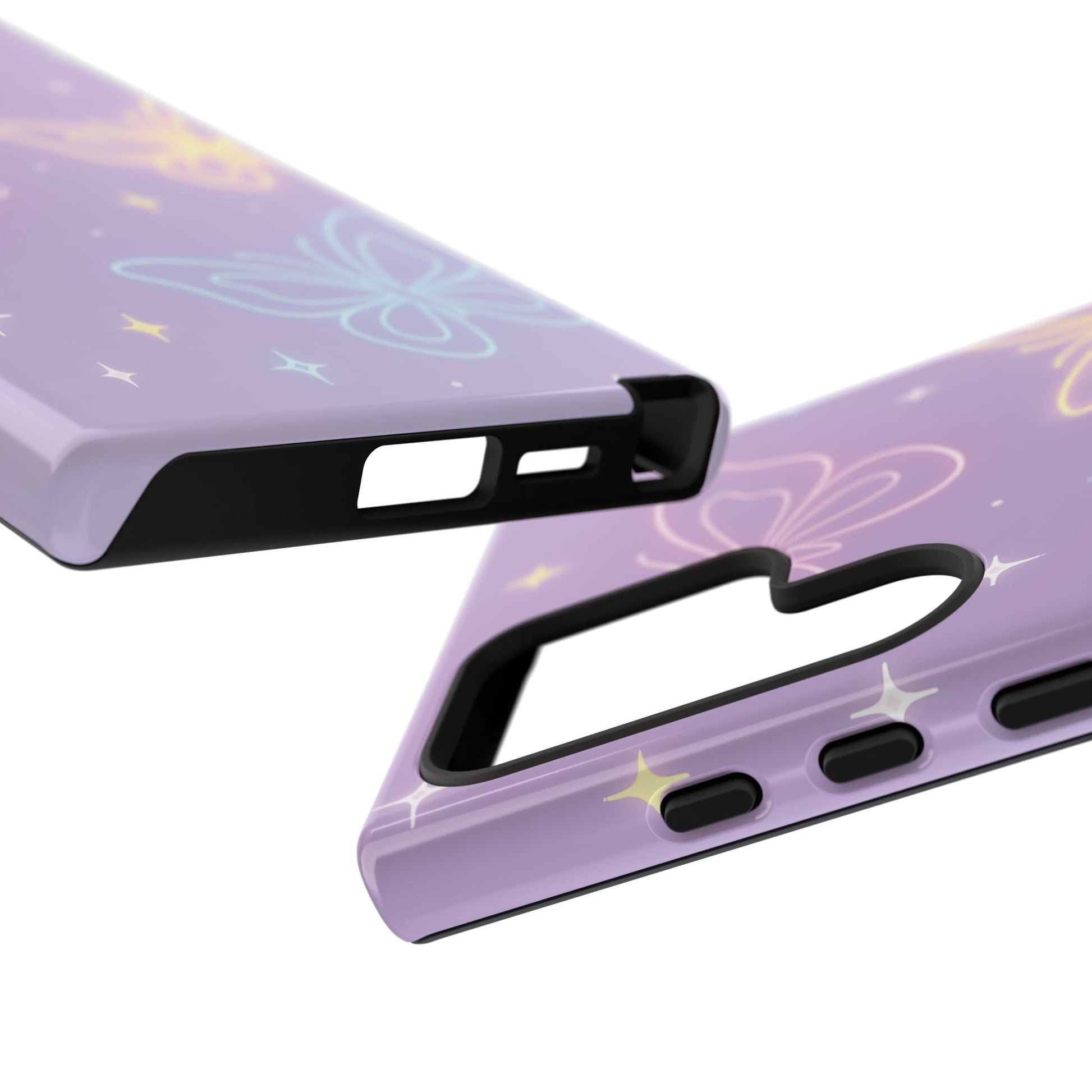 Pastel Butterfly Dream Phone Case – Purple Neon Glow with Stars