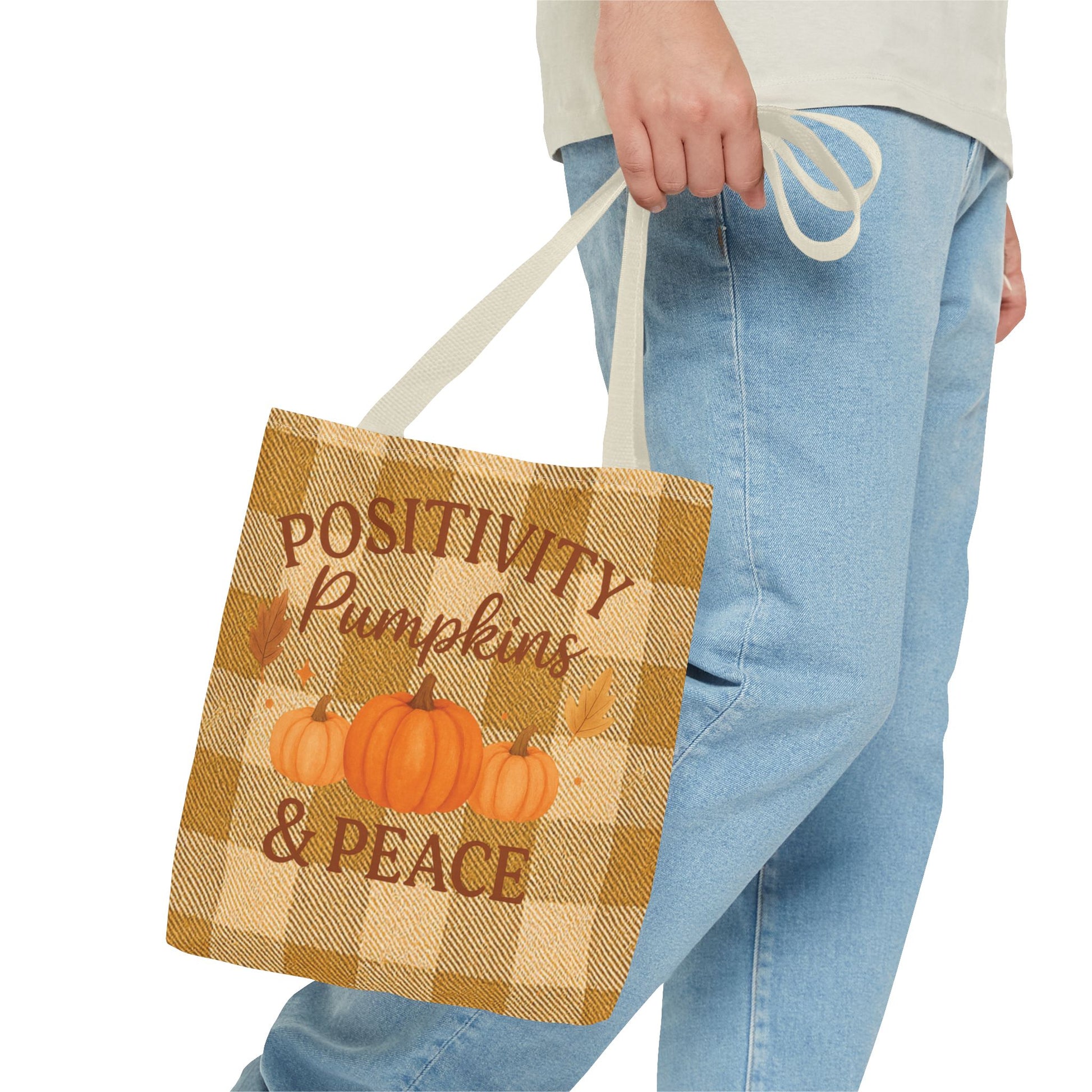 Positivity, Pumpkins & Peace Fall Tote Bag – Autumn Plaid Reusable Shopping & Everyday Carry Bag.