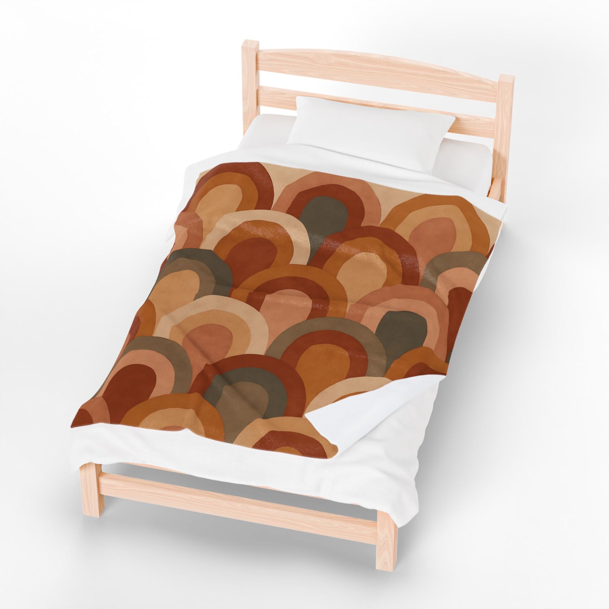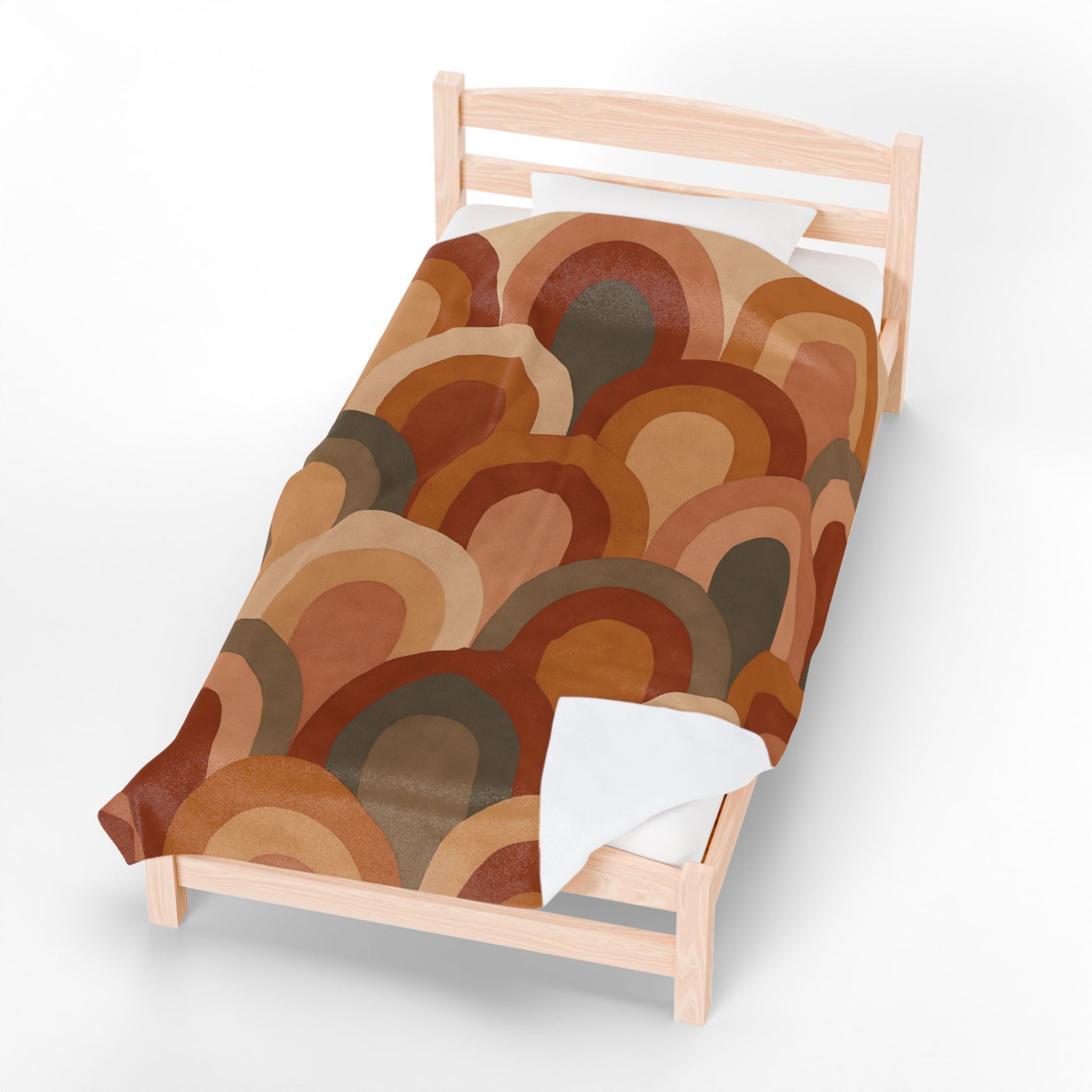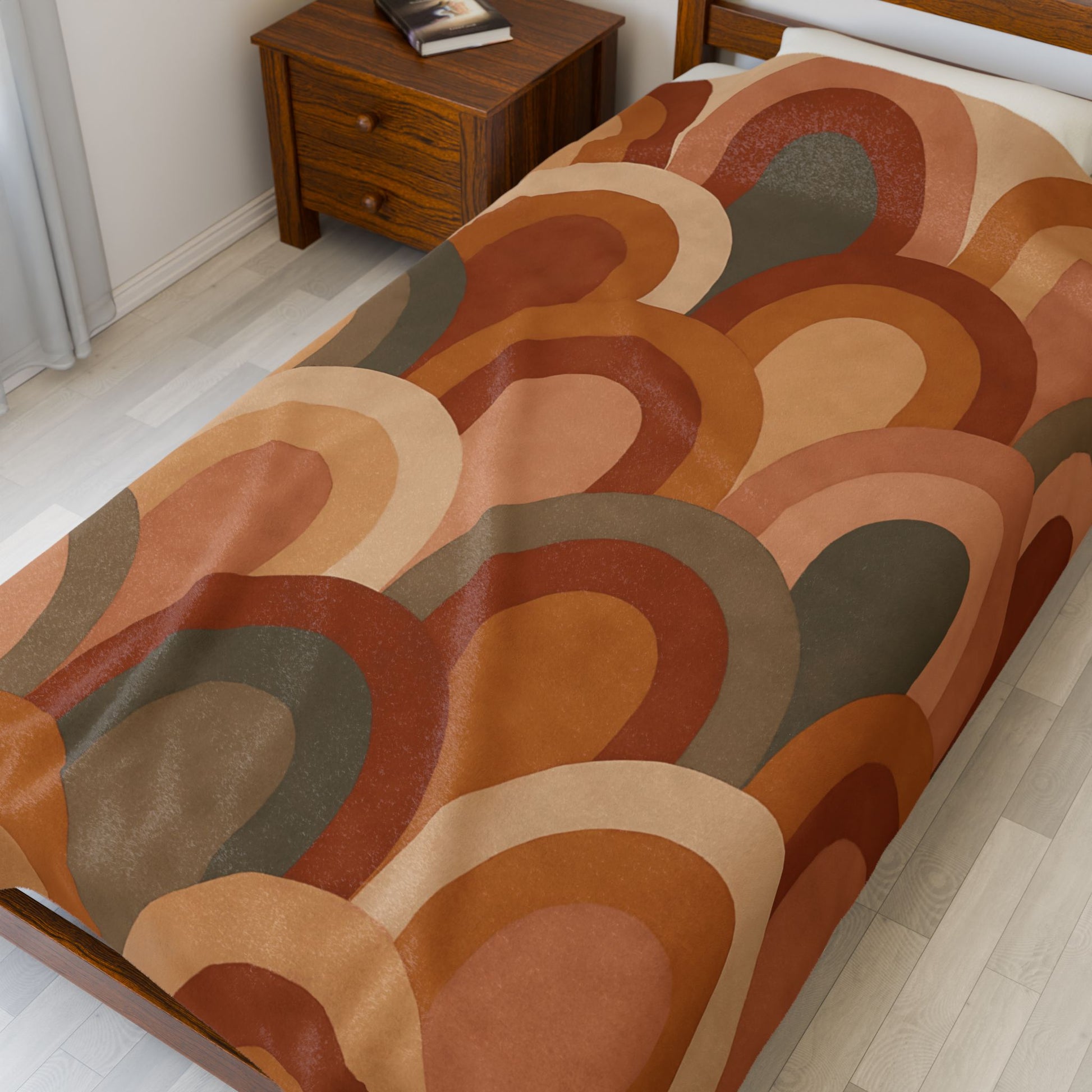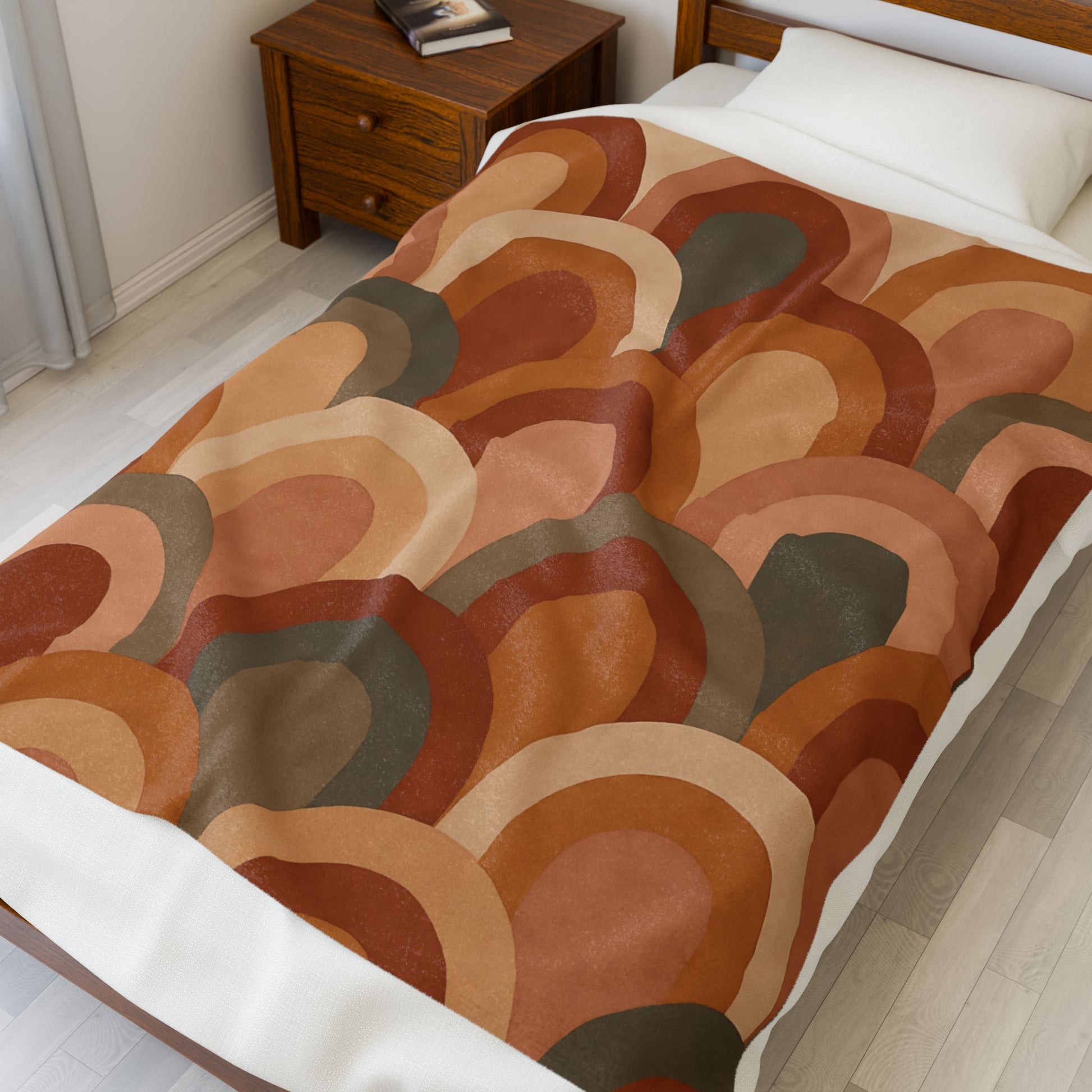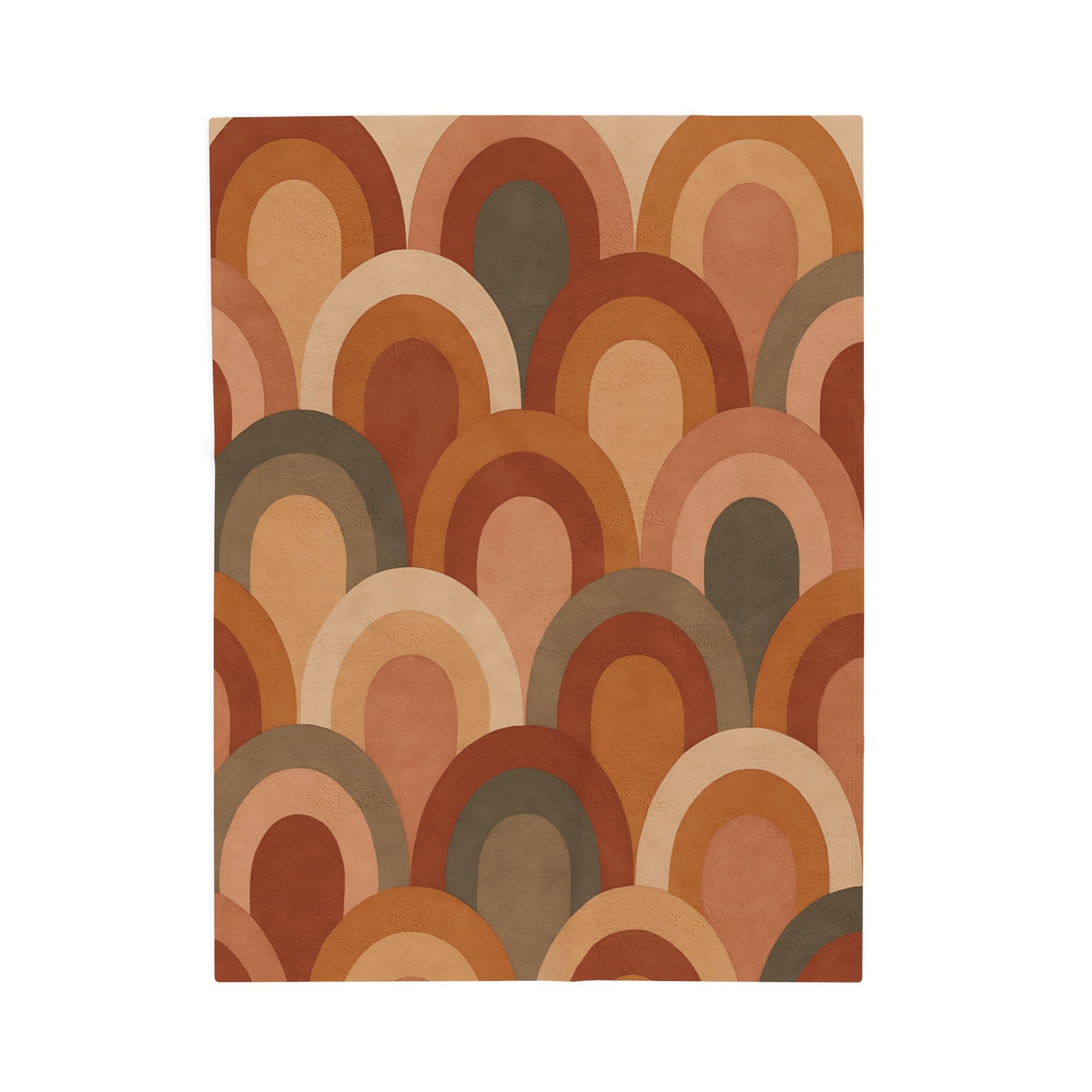 Featuring a bold repeating pattern of overlapping arches in warm rust, terracotta, mustard, olive, and cream tones, this blanket delivers both cozy comfort and mid-century charm.