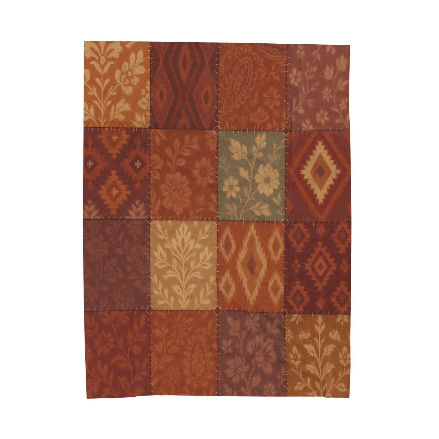The high-resolution print showcases a quilt-like patchwork of floral, paisley, and diamond designs for a bold, eclectic look.