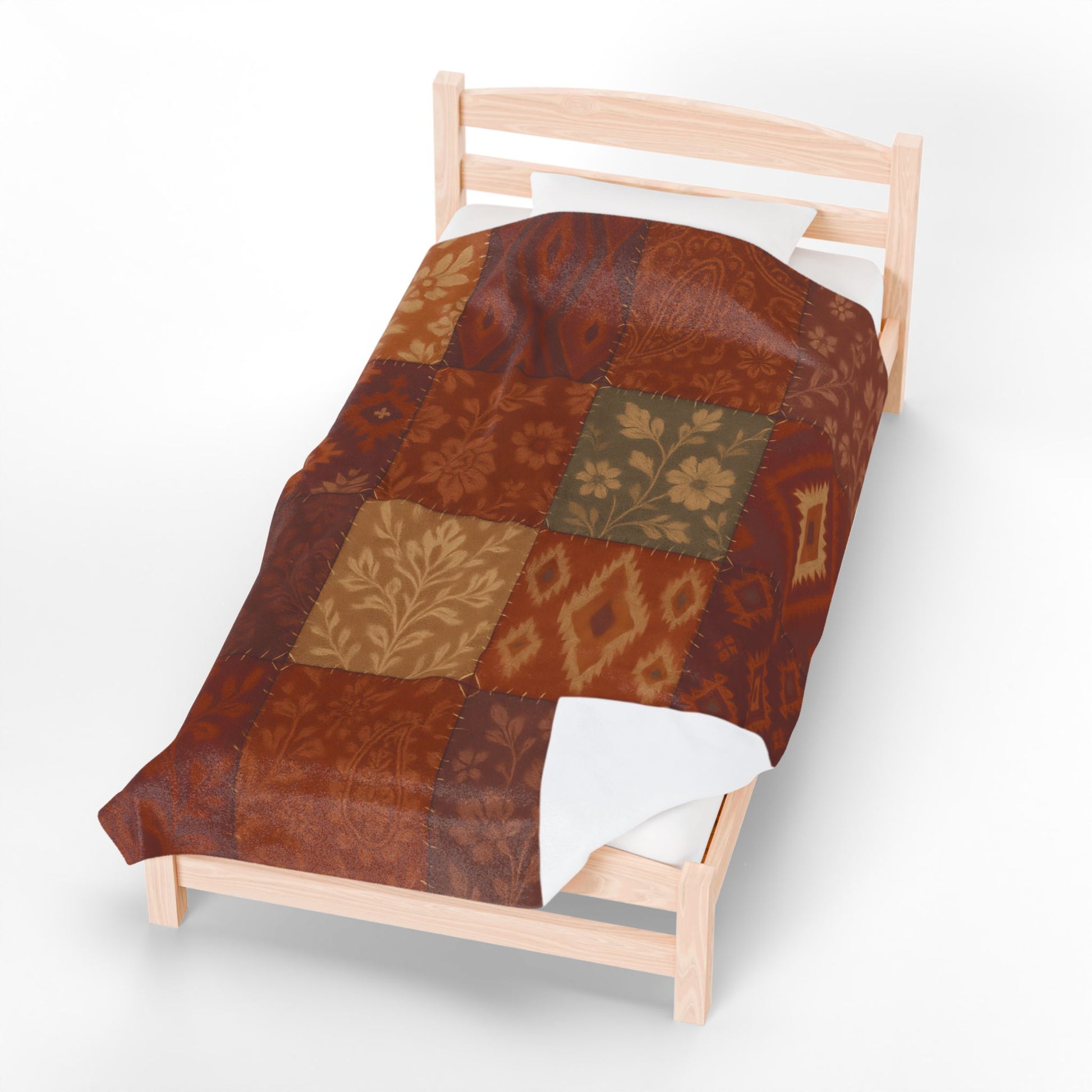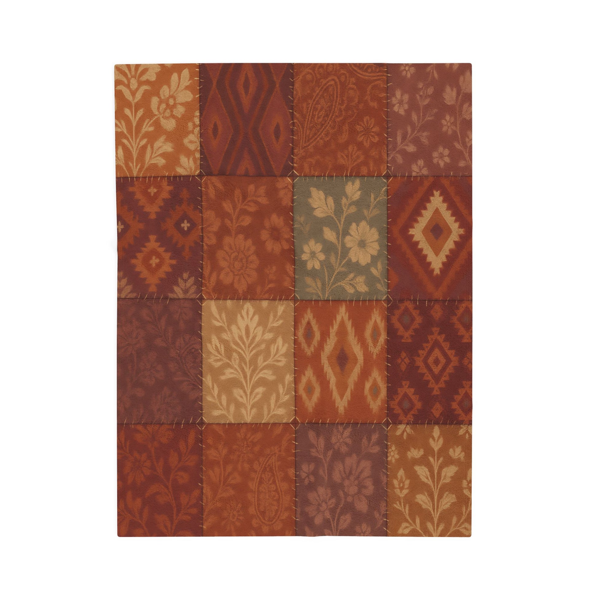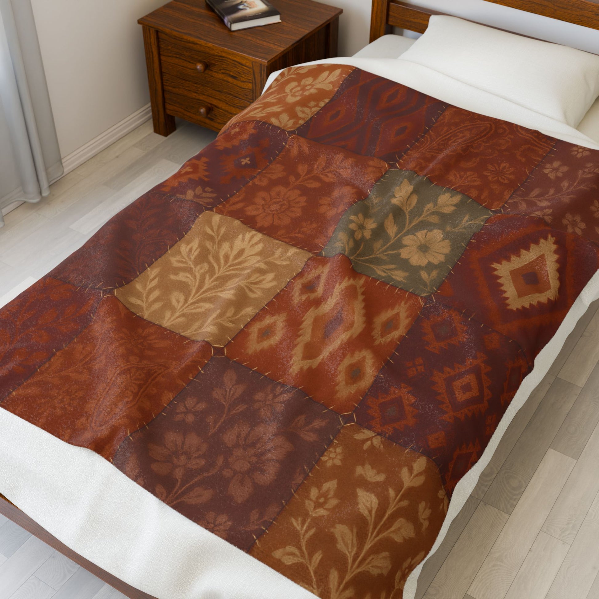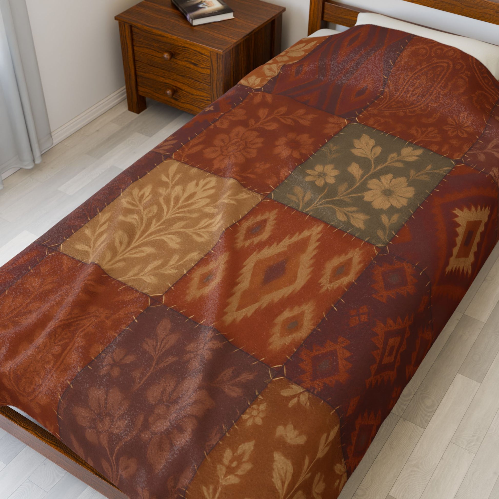 Featuring a rich mix of terracotta, clay, golden ochre, and earthy patterns inspired by vintage textiles and tribal motifs, this adult-sized blanket brings instant warmth and style to any living space.