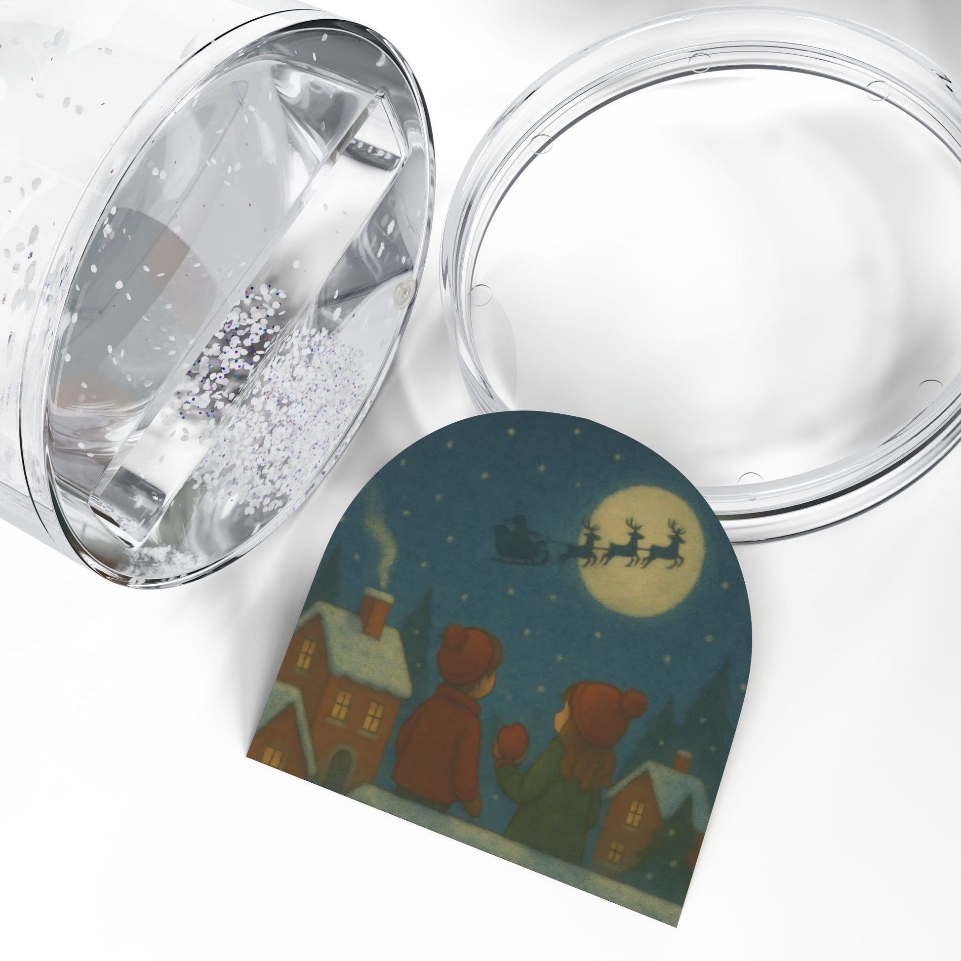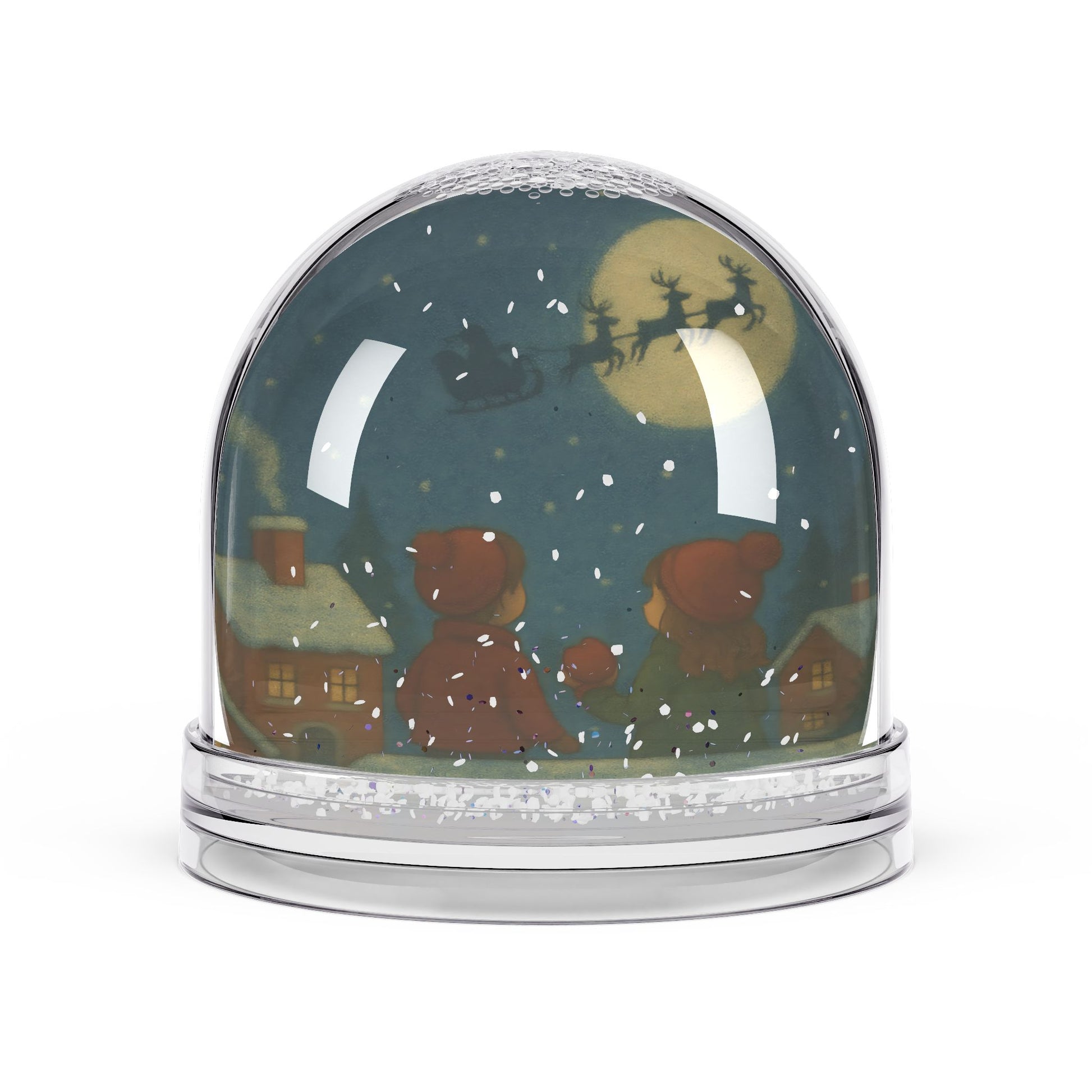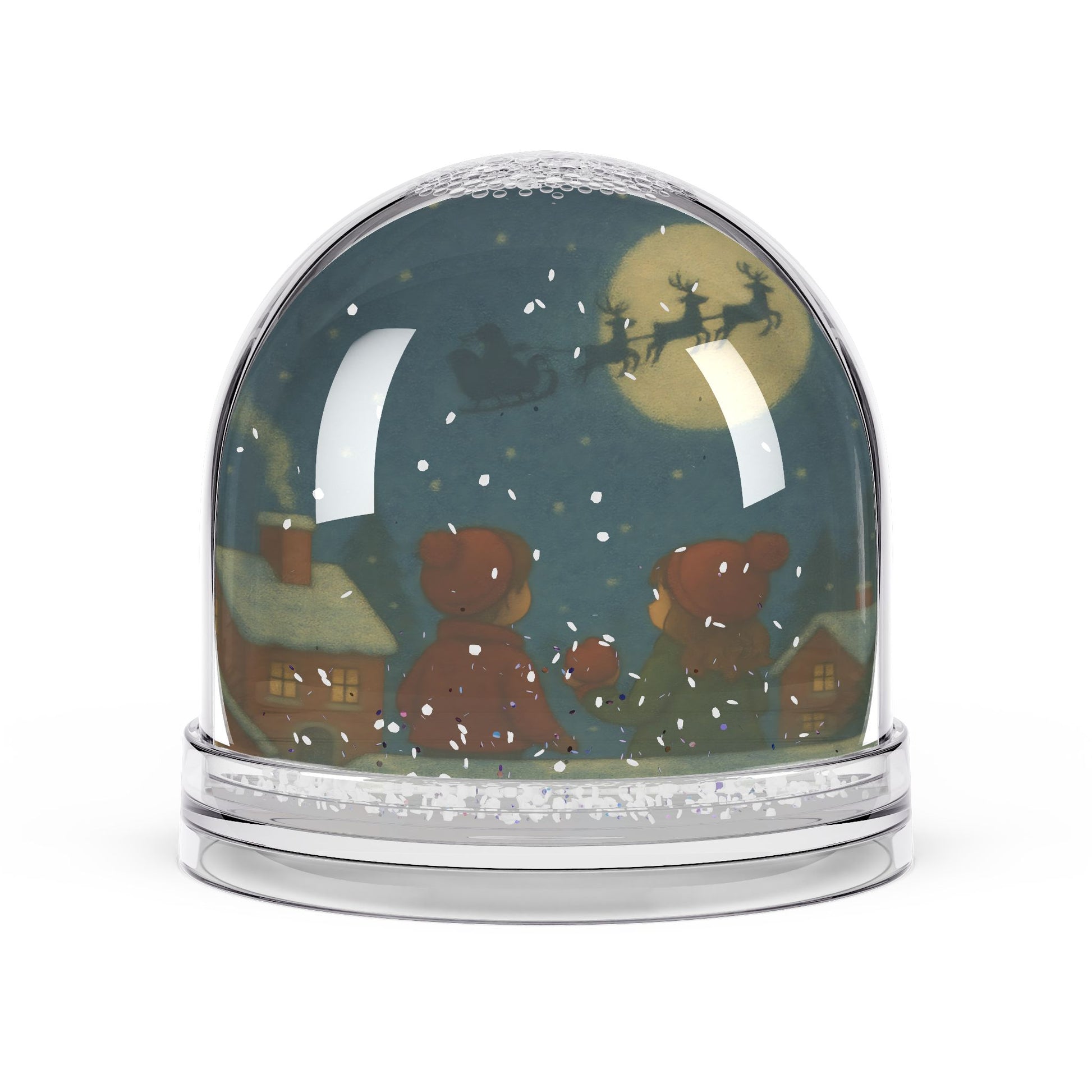 Capture the wonder of Christmas Eve with this enchanting Santa’s Sleigh Christmas Snow Globe, featuring two bundled-up children gazing at Santa and his reindeer flying across a glowing full moon.