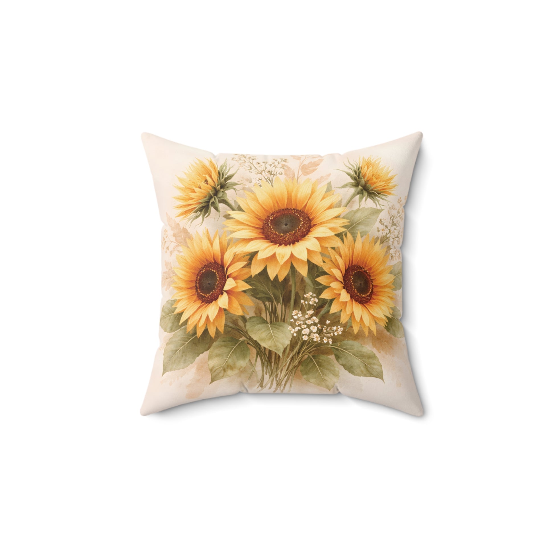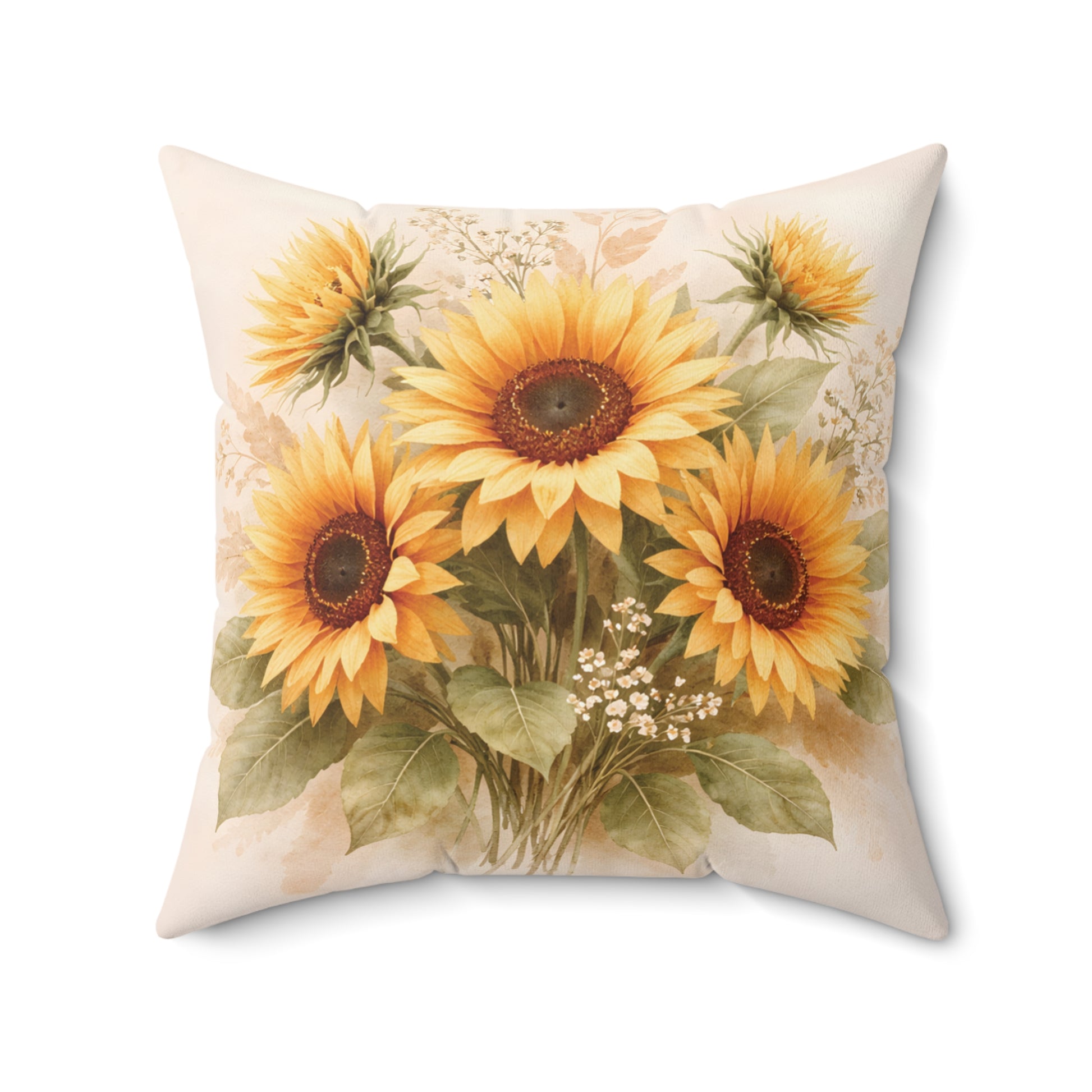 Soft, sunlit sunflowers bloom across both sides of this square pillow, evoking warm afternoons and cozy corners.