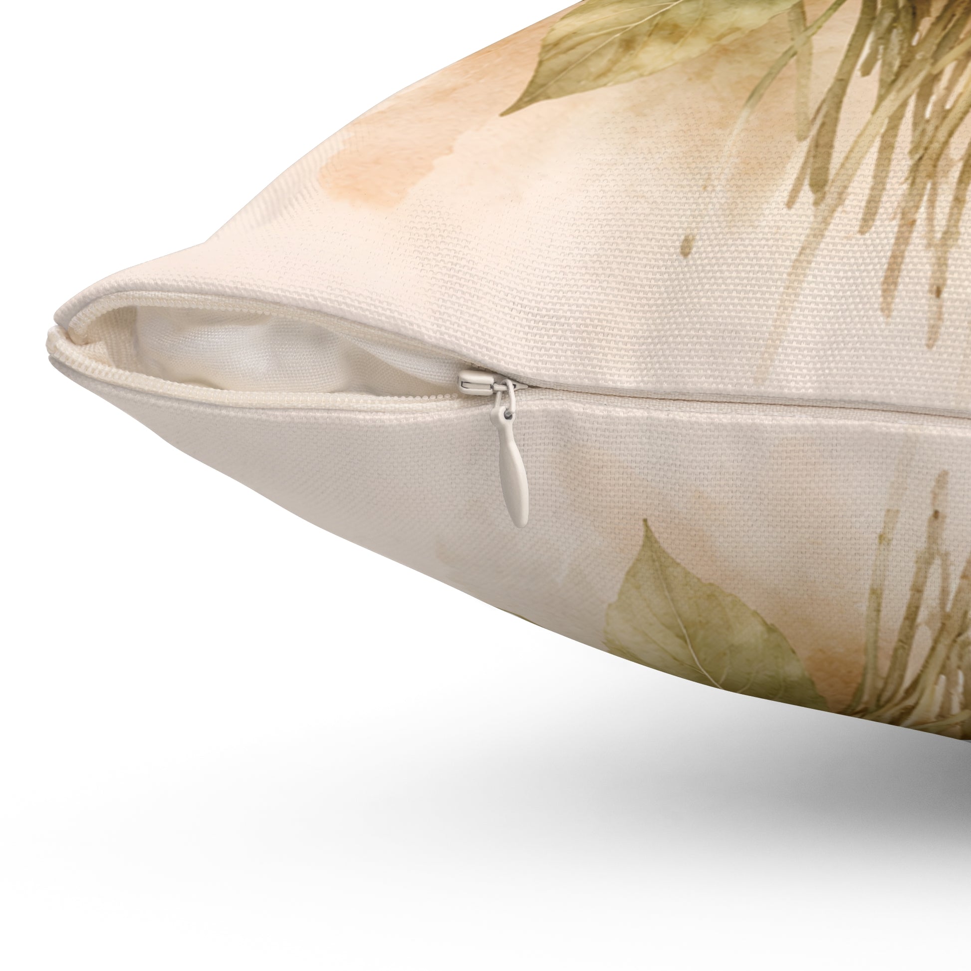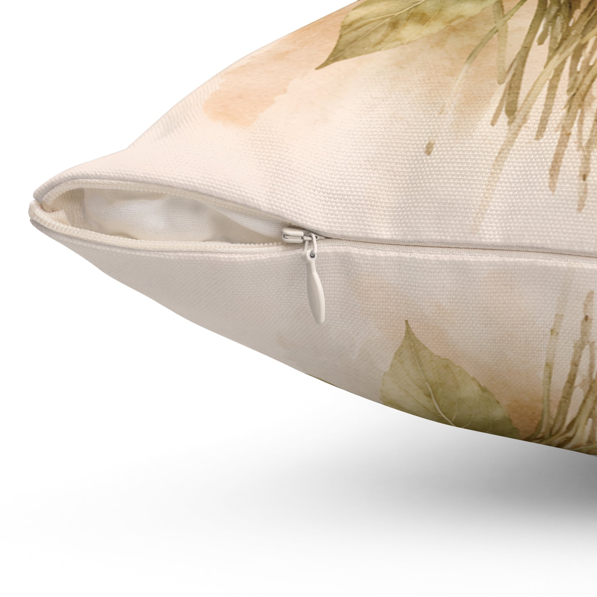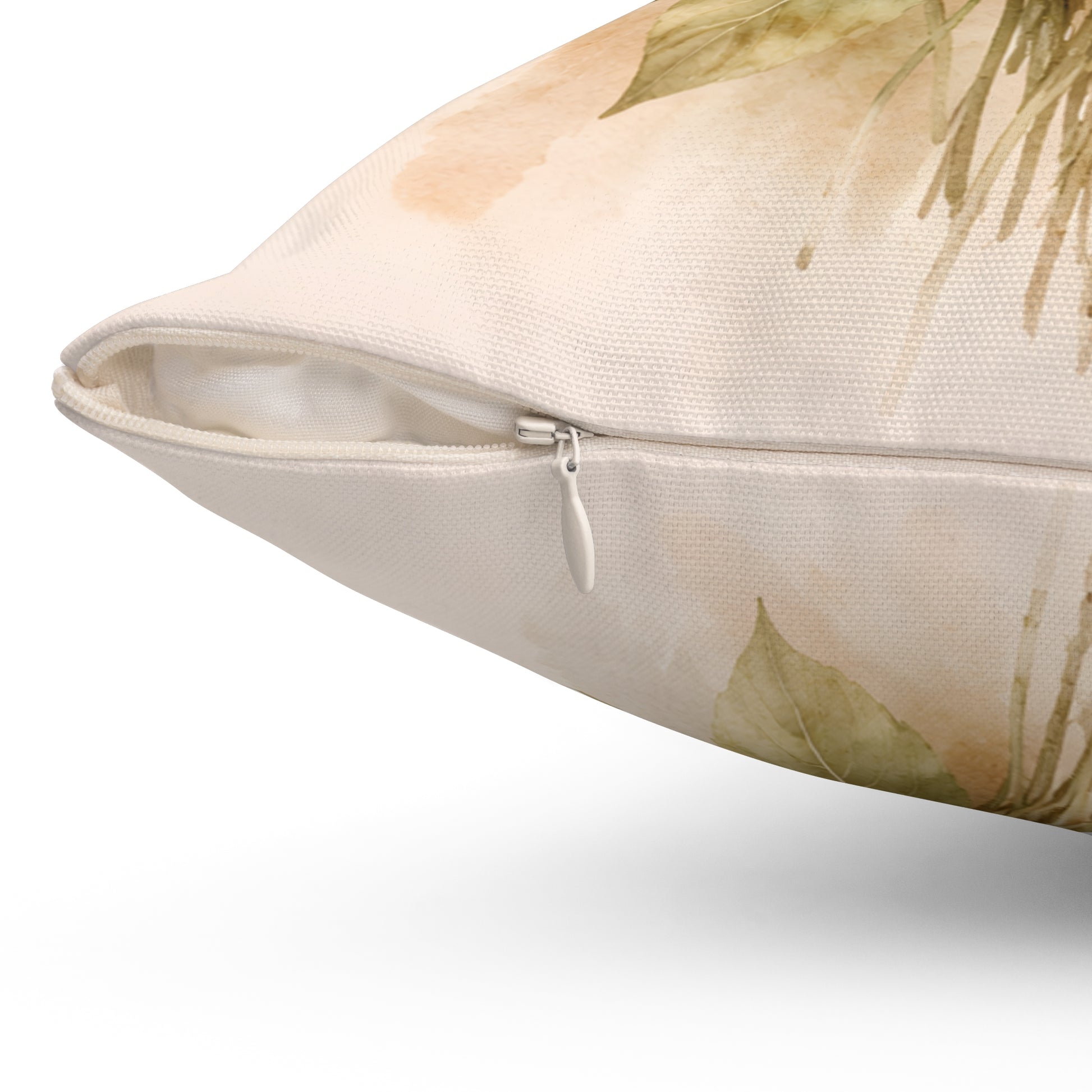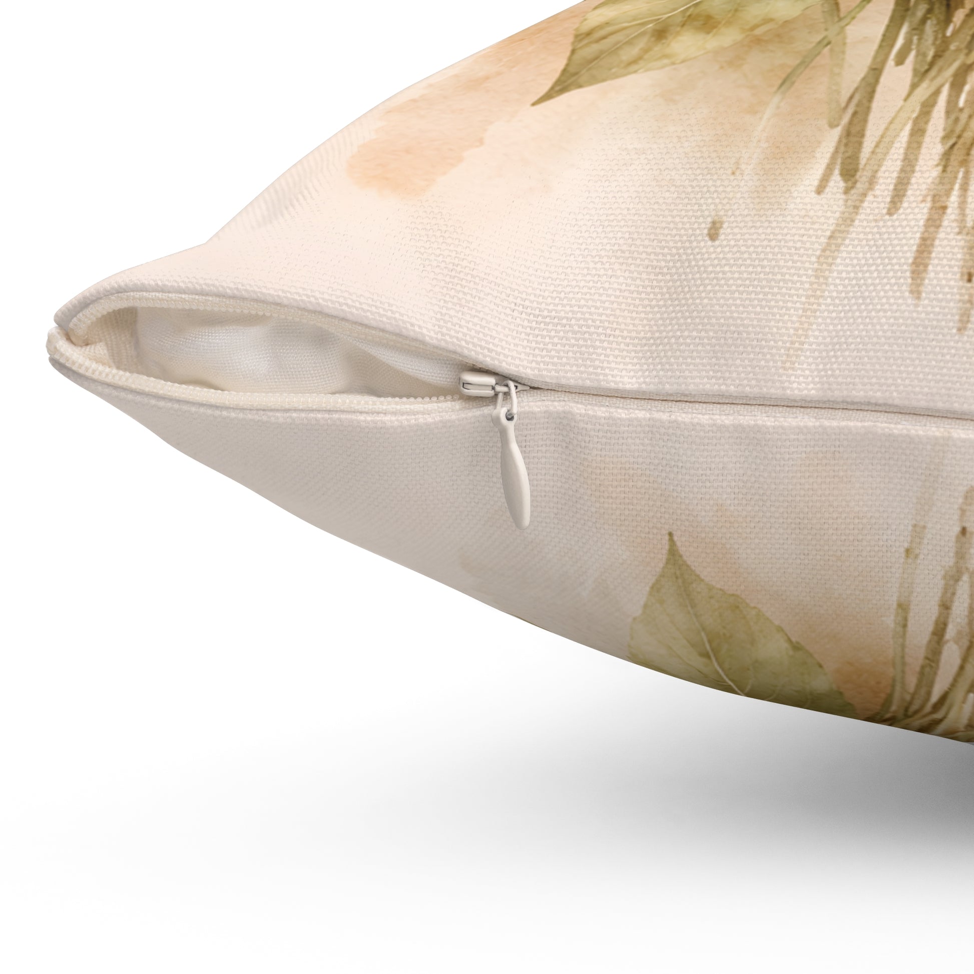 The watercolor-style petals and muted greens sit on a gentle cream background, bringing a calm, cottage-like energy to a sofa, reading nook, or bedroom.