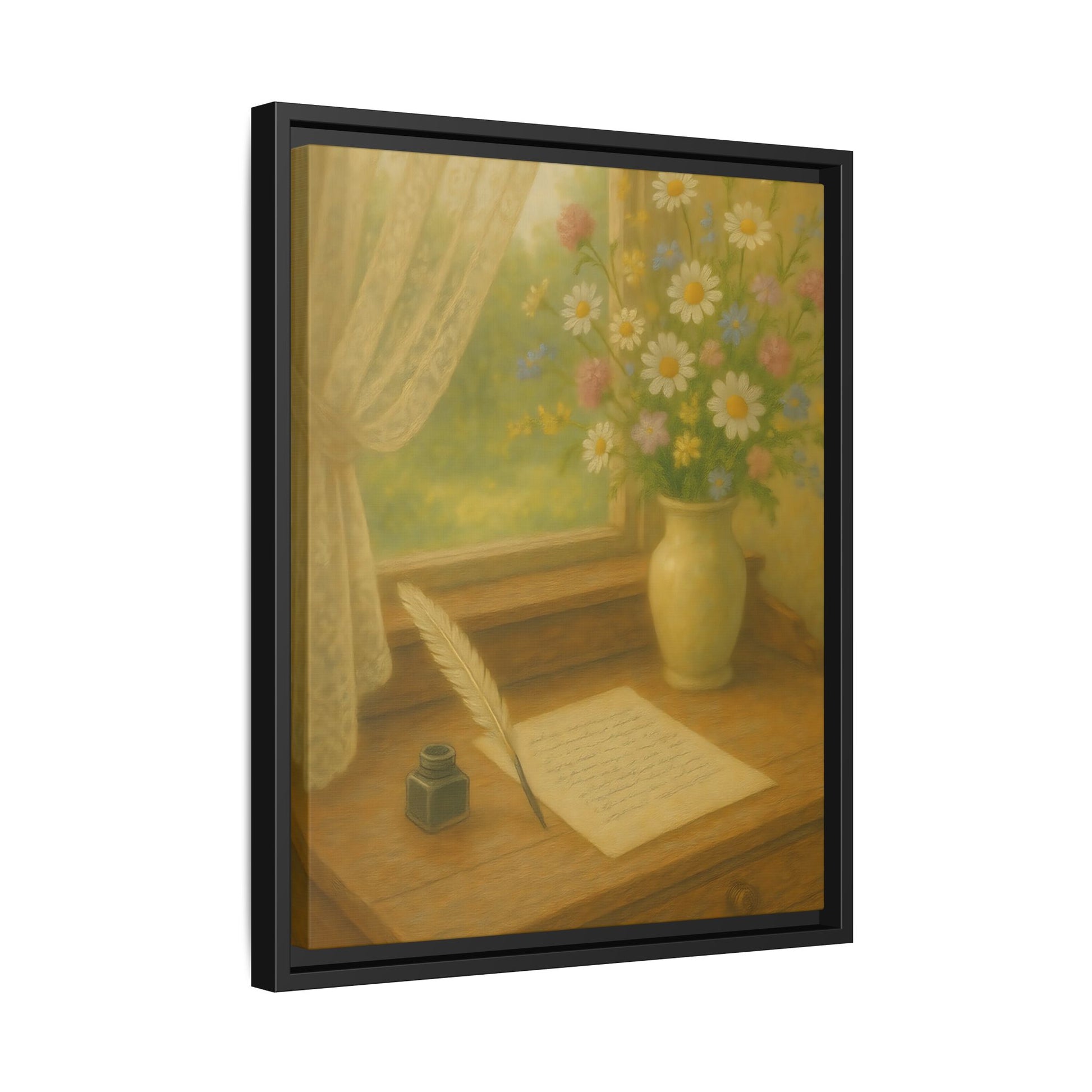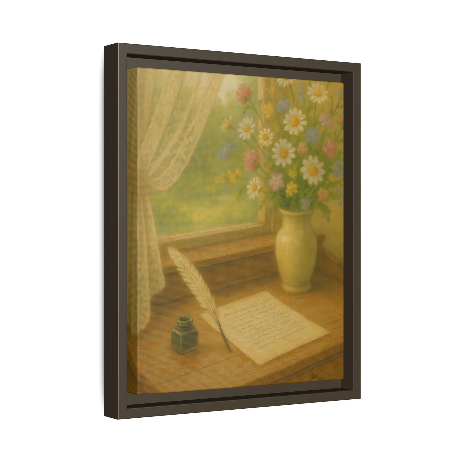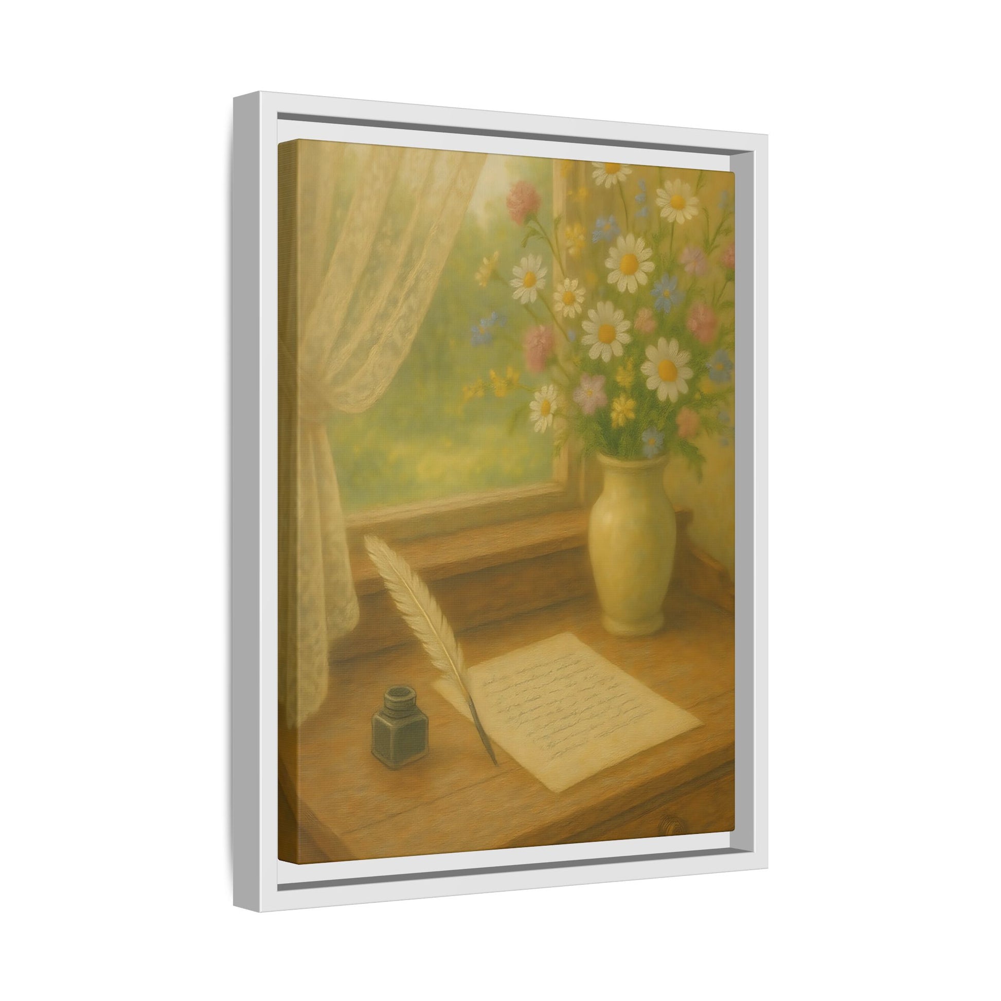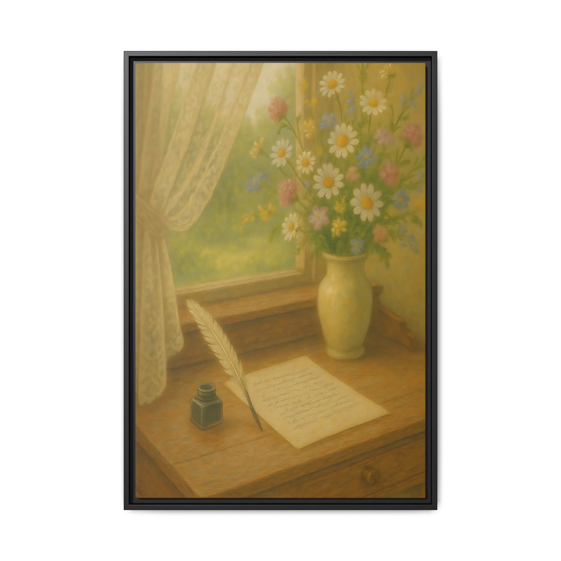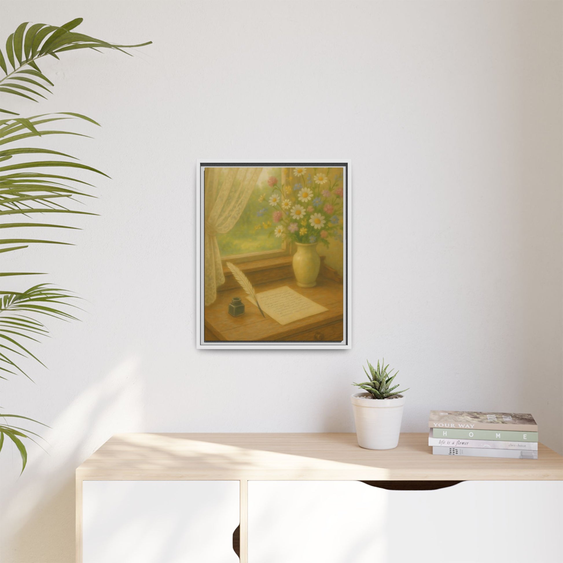 Sunlit Writing Desk – Framed Matte Canvas Art of Quill, Flowers & Lace Window