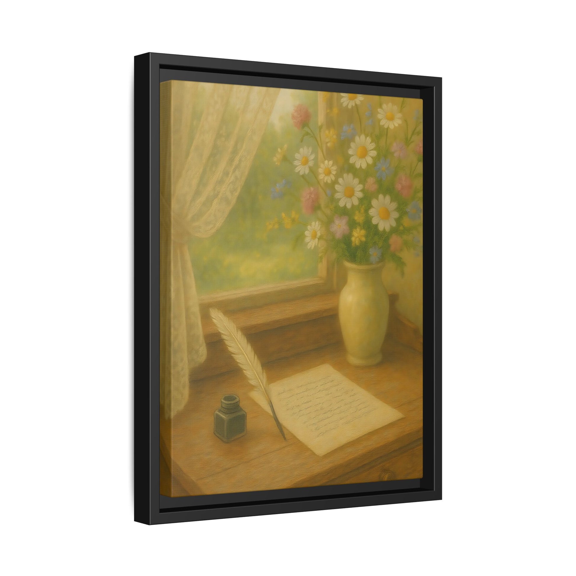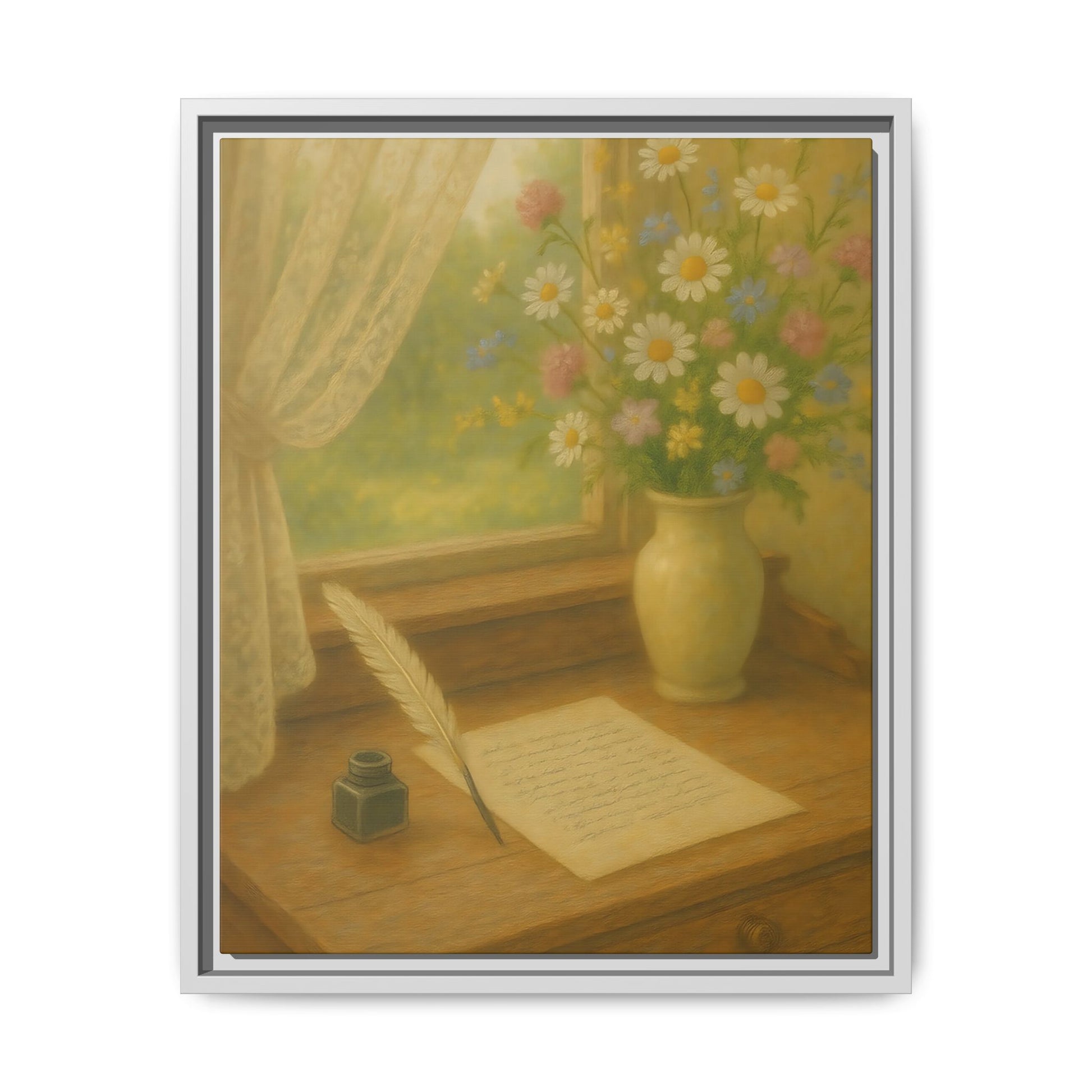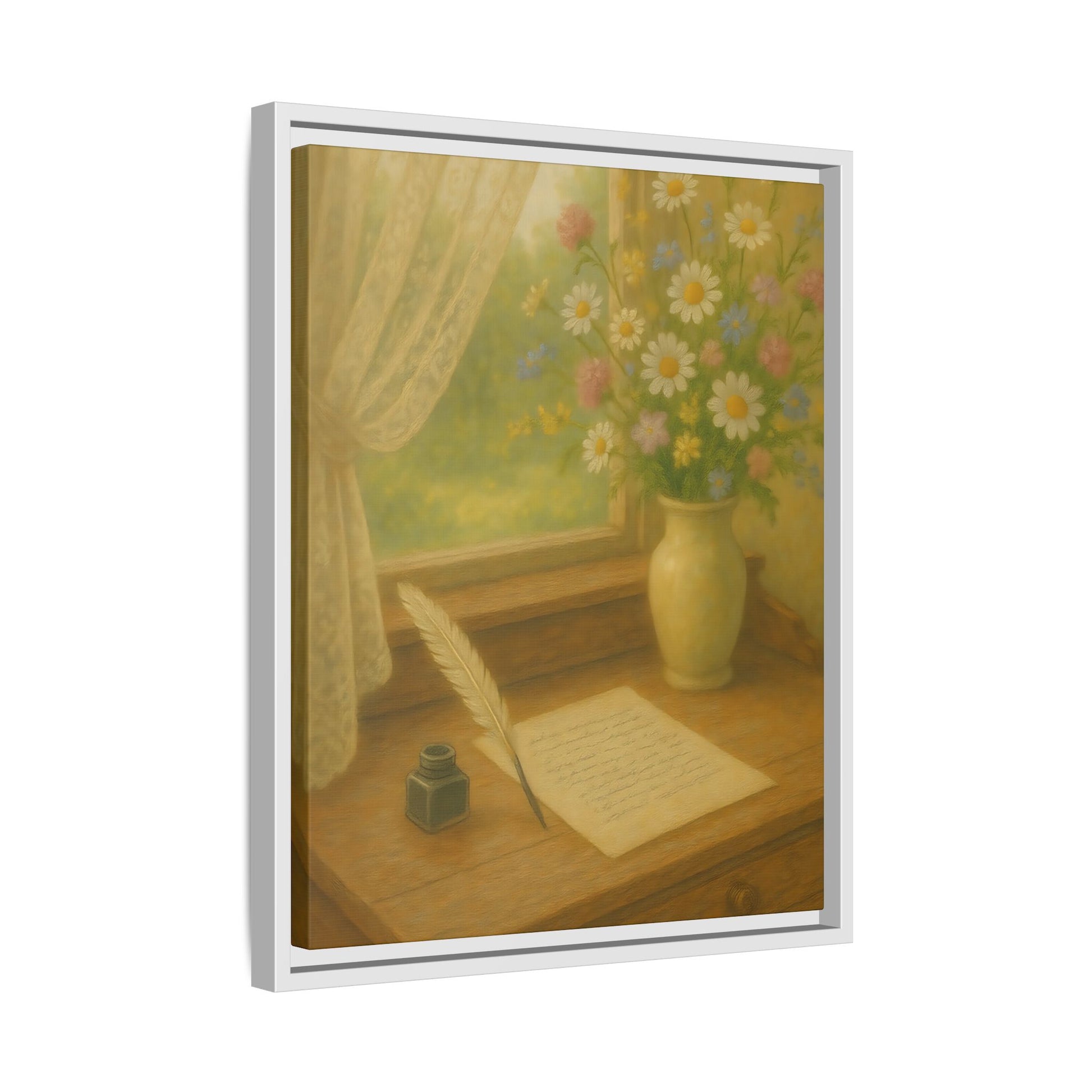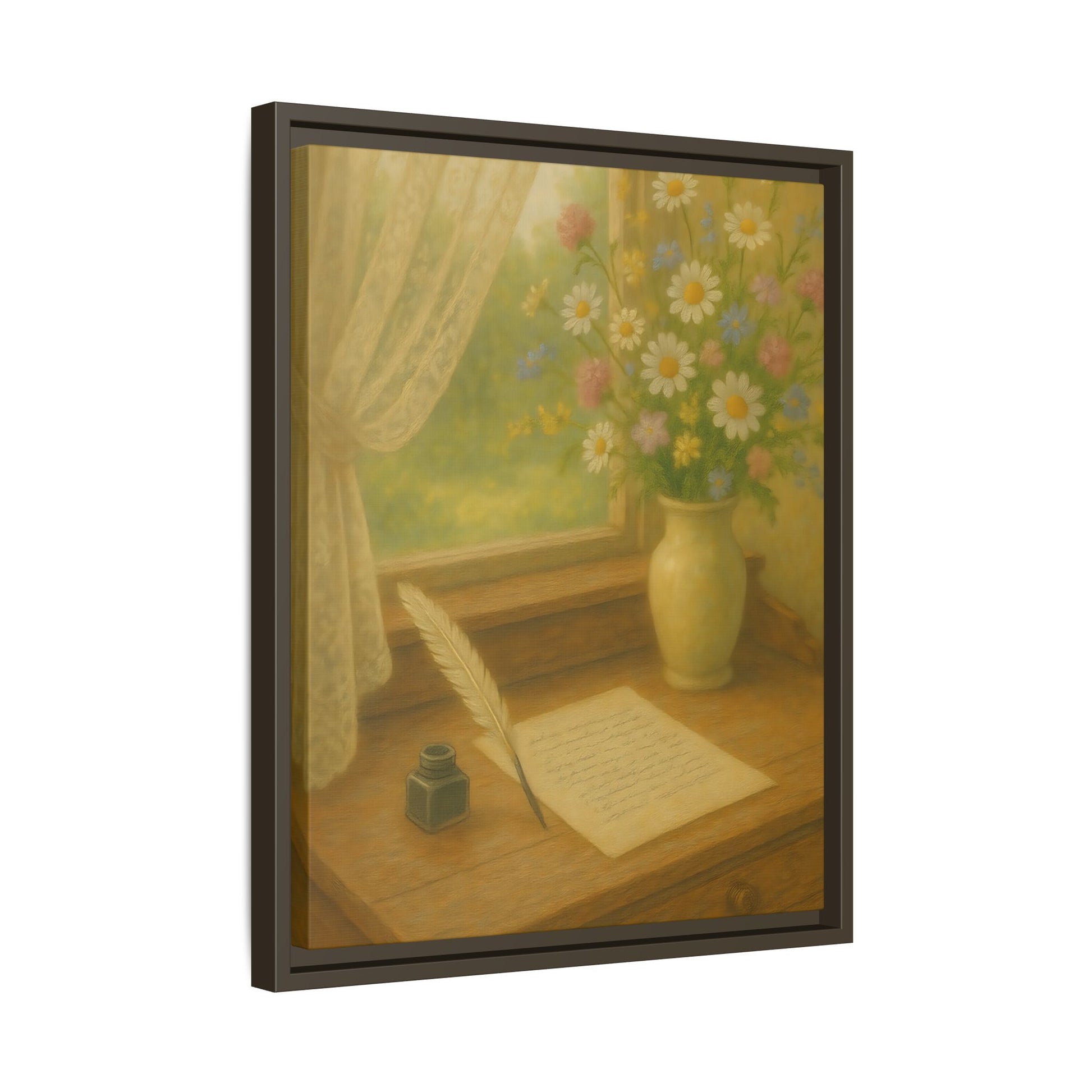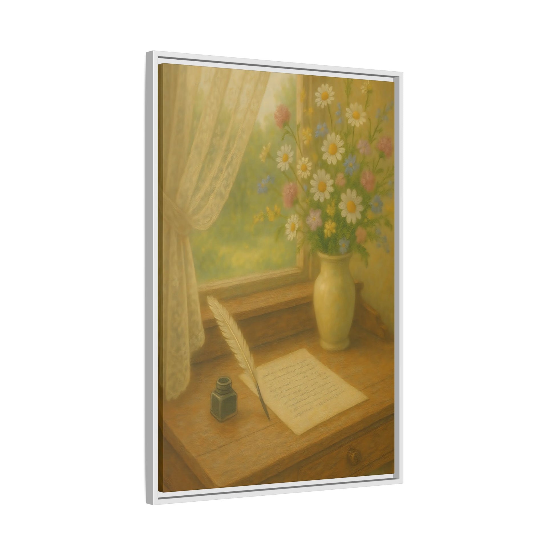 Sunlit Writing Desk – Framed Matte Canvas Art of Quill, Flowers & Lace Window