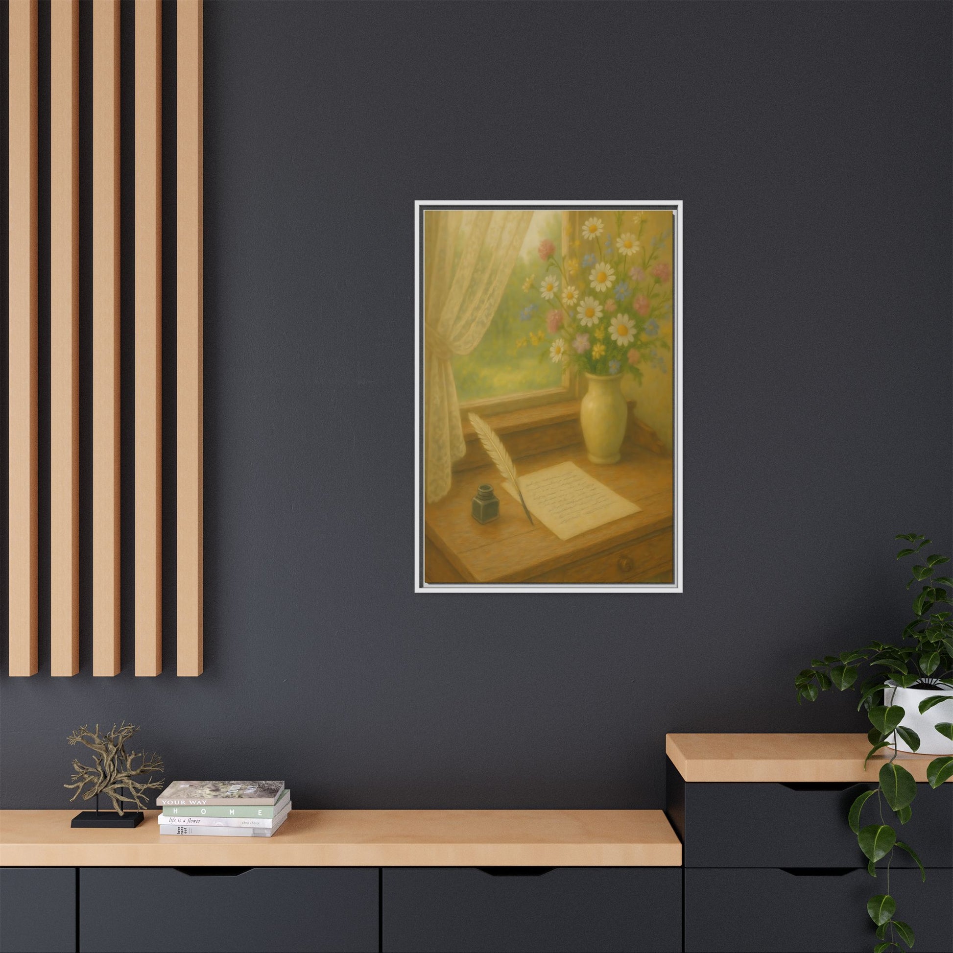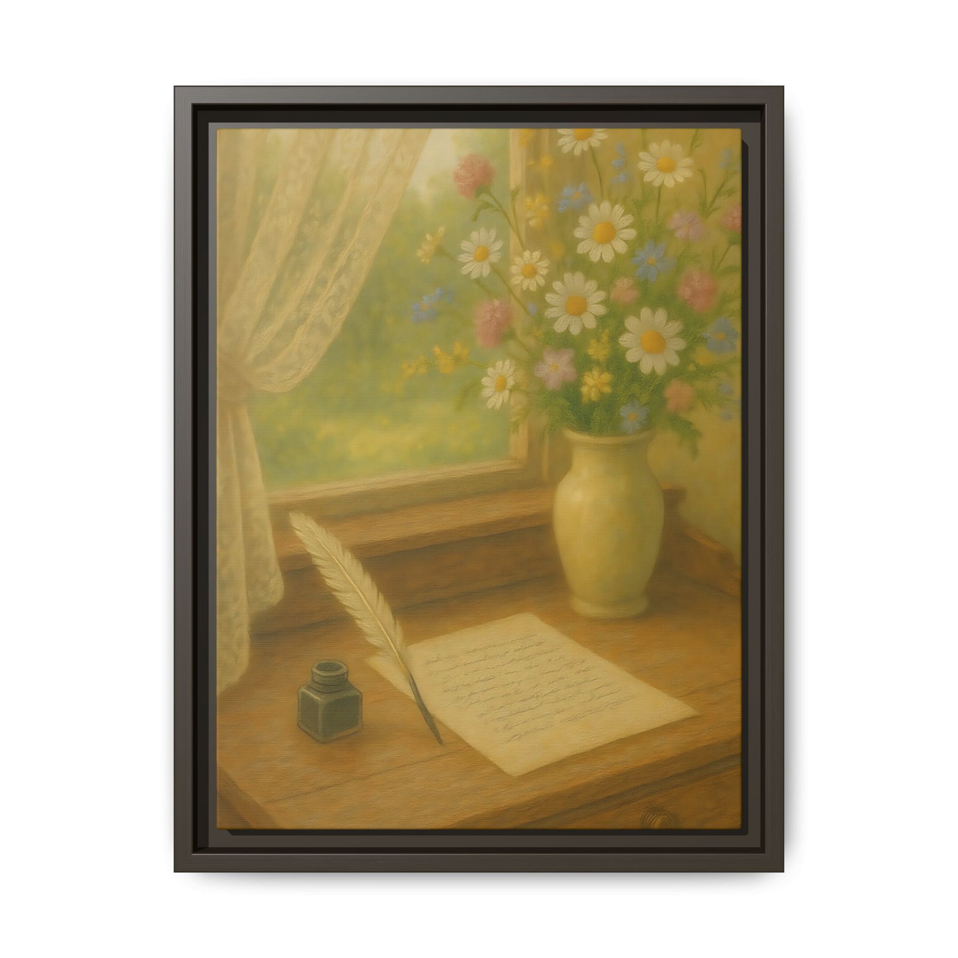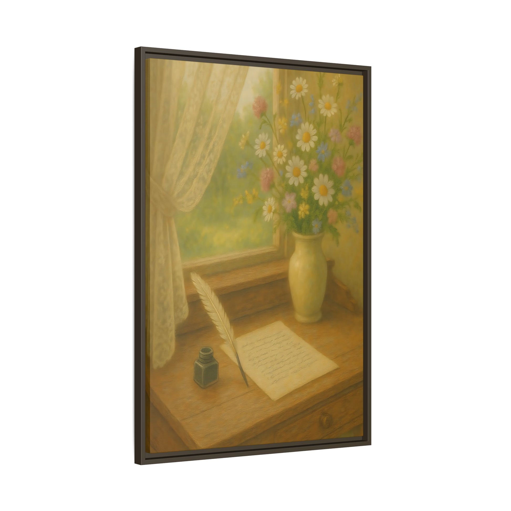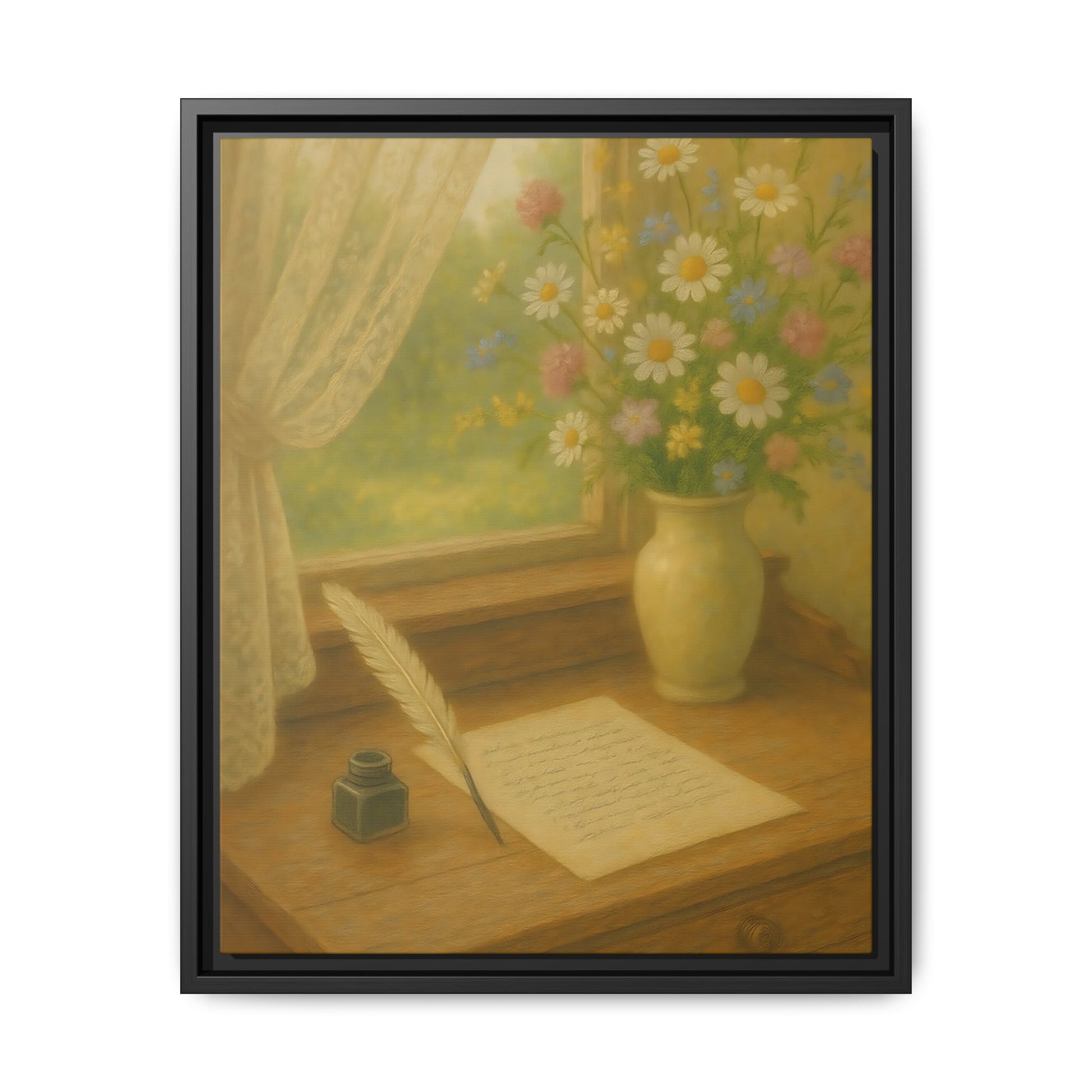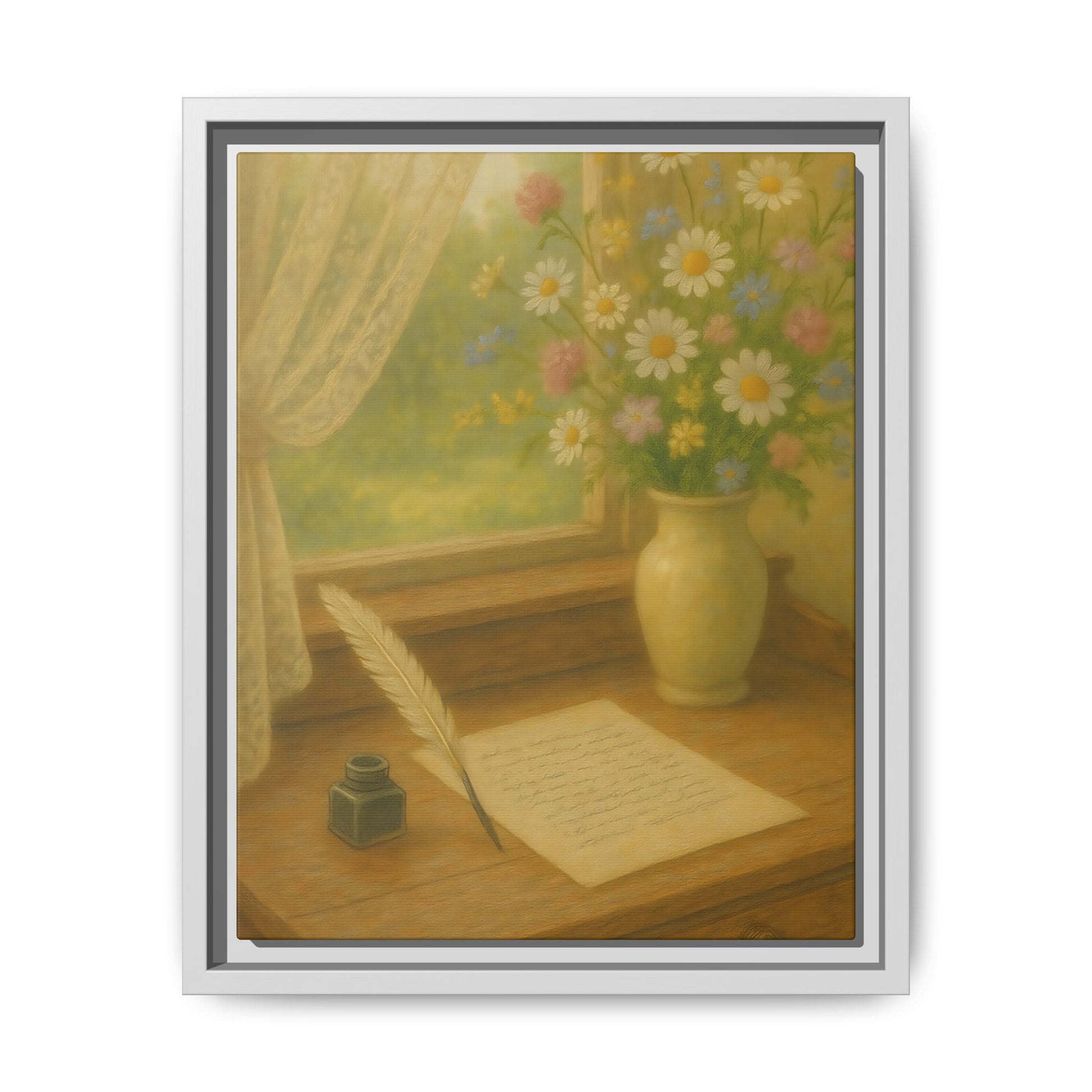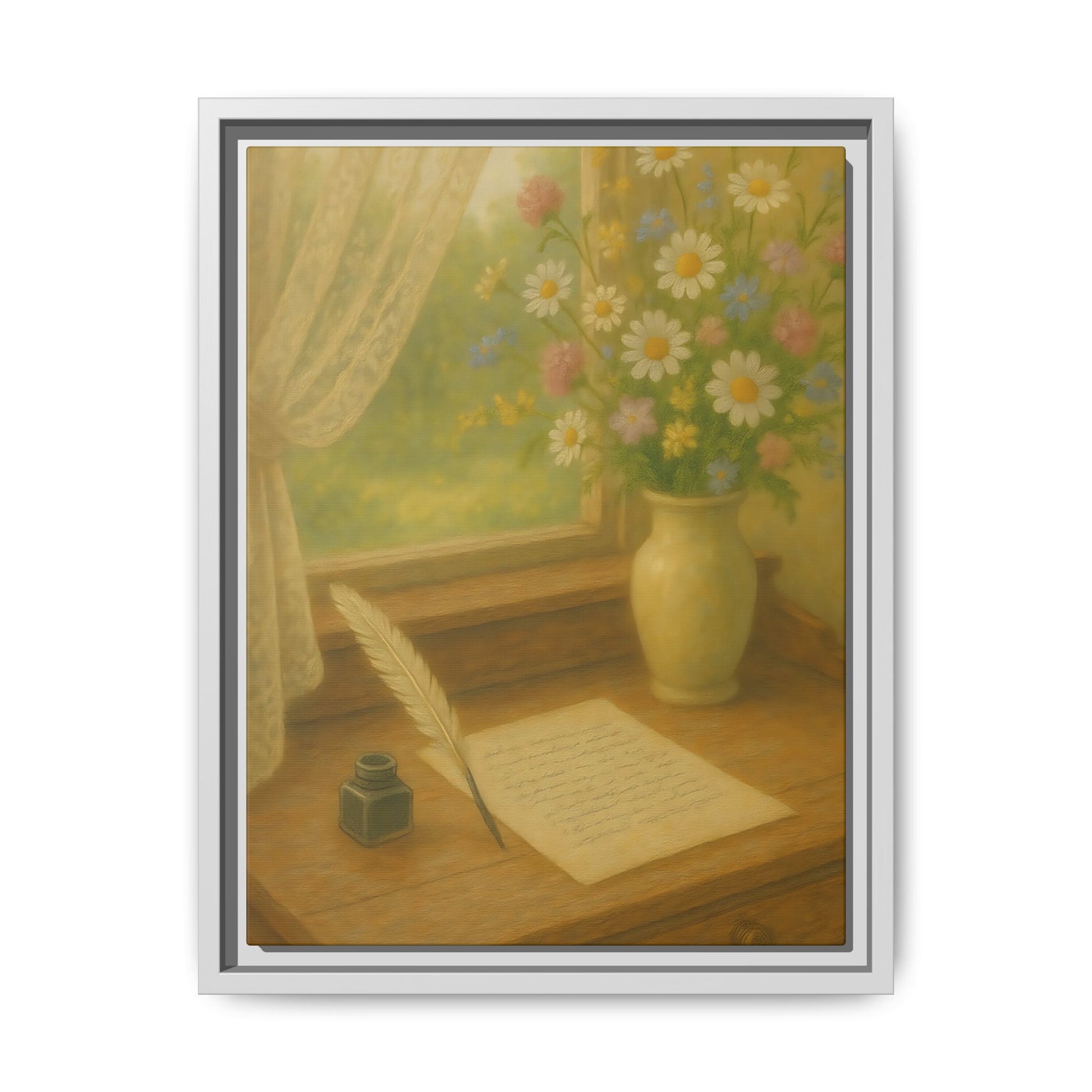 Sunlit Writing Desk – Framed Matte Canvas Art of Quill, Flowers & Lace Window