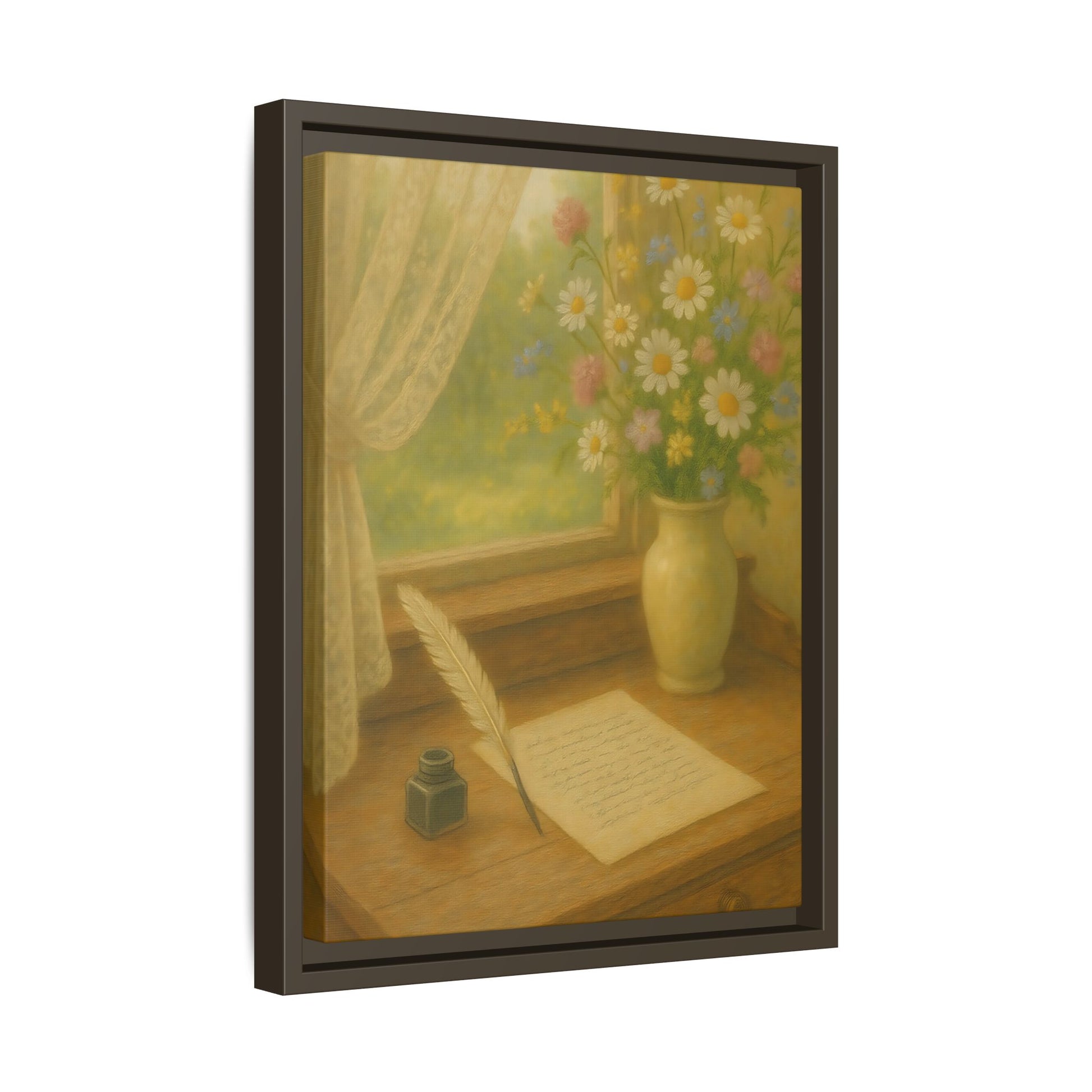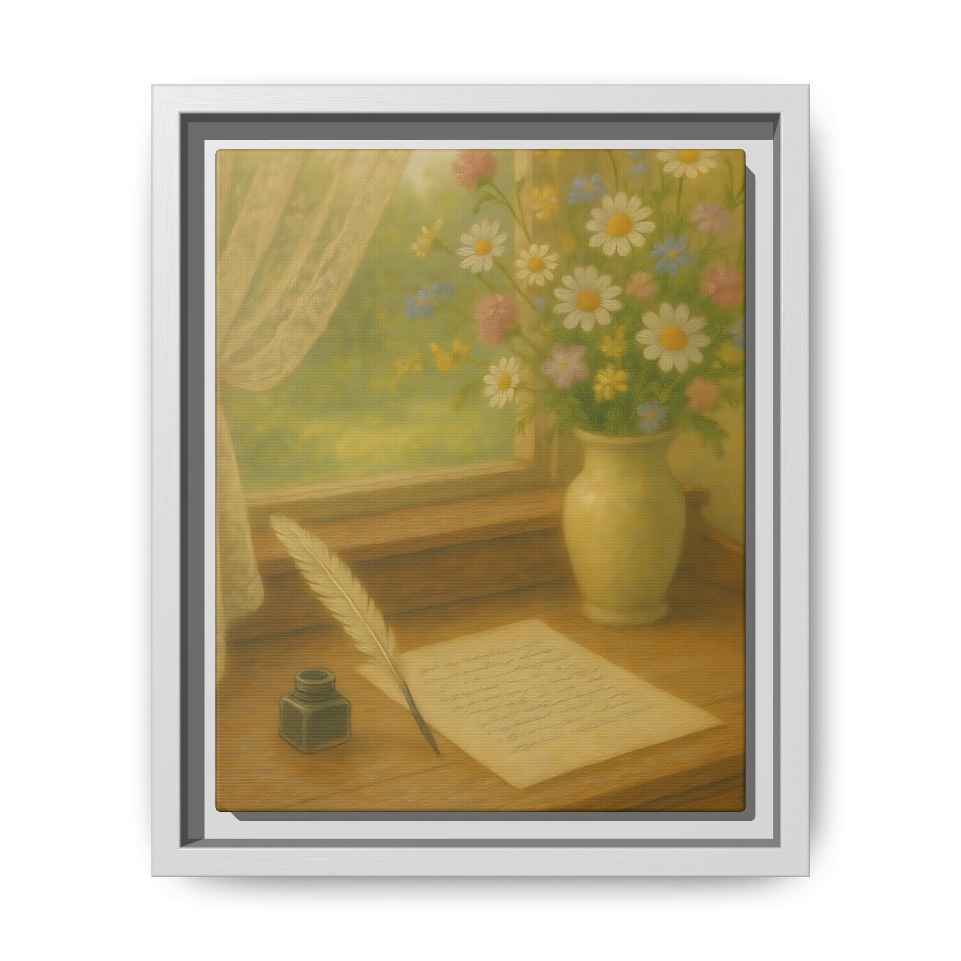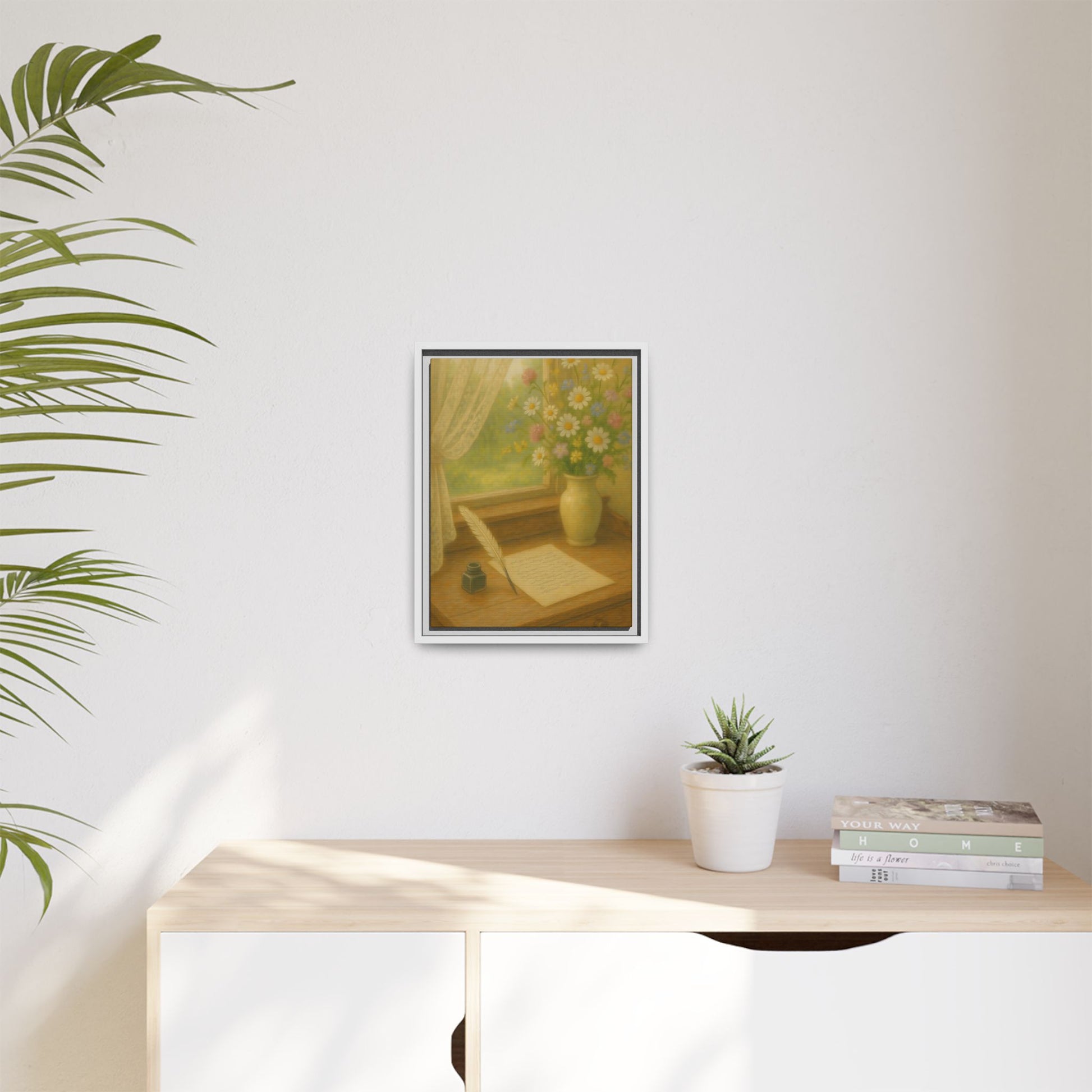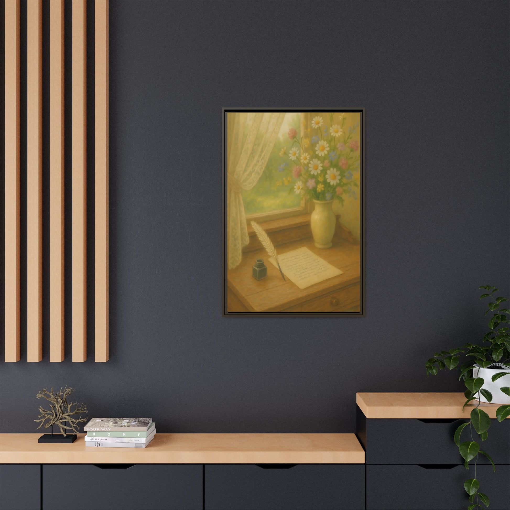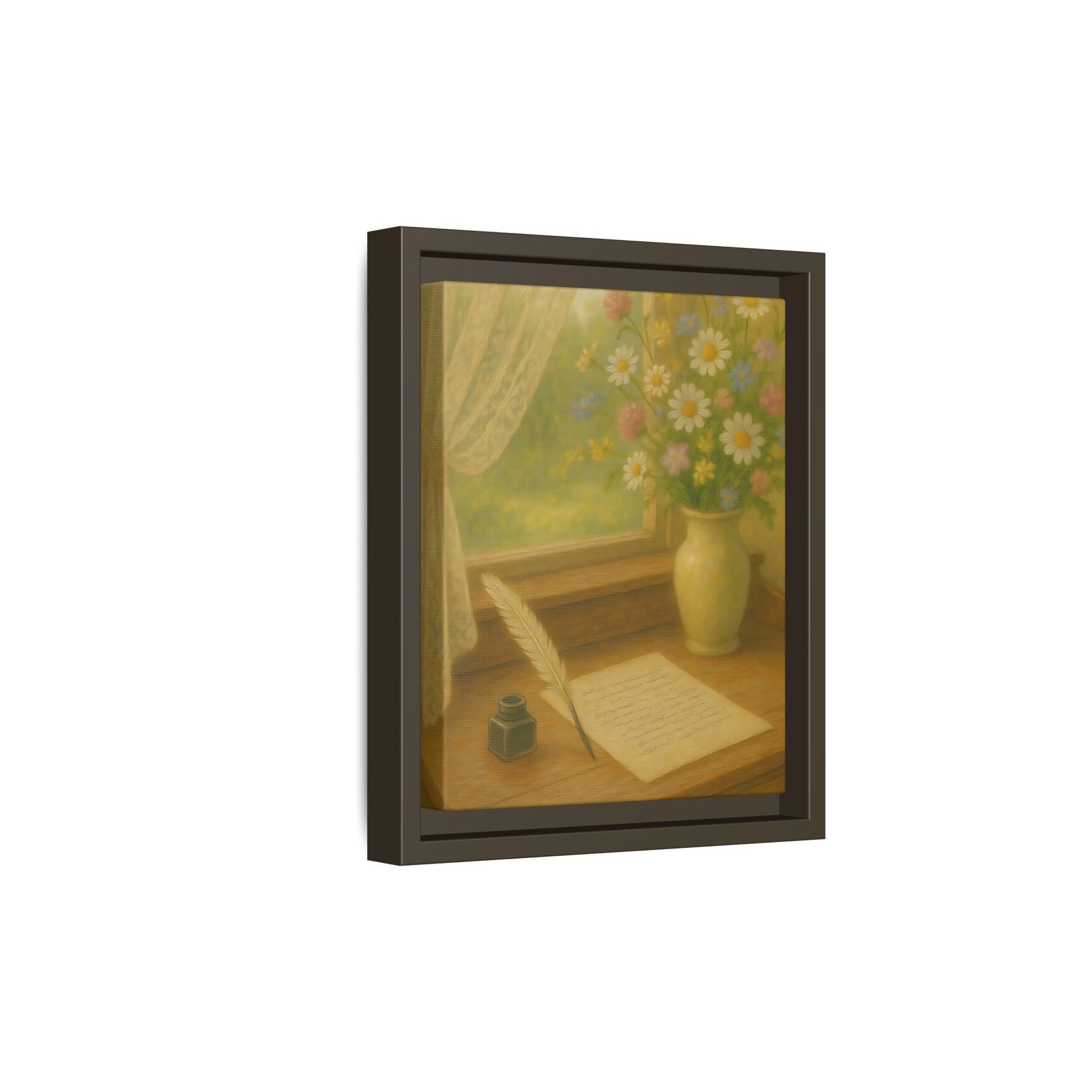 Sunlit Writing Desk – Framed Matte Canvas Art of Quill, Flowers & Lace Window