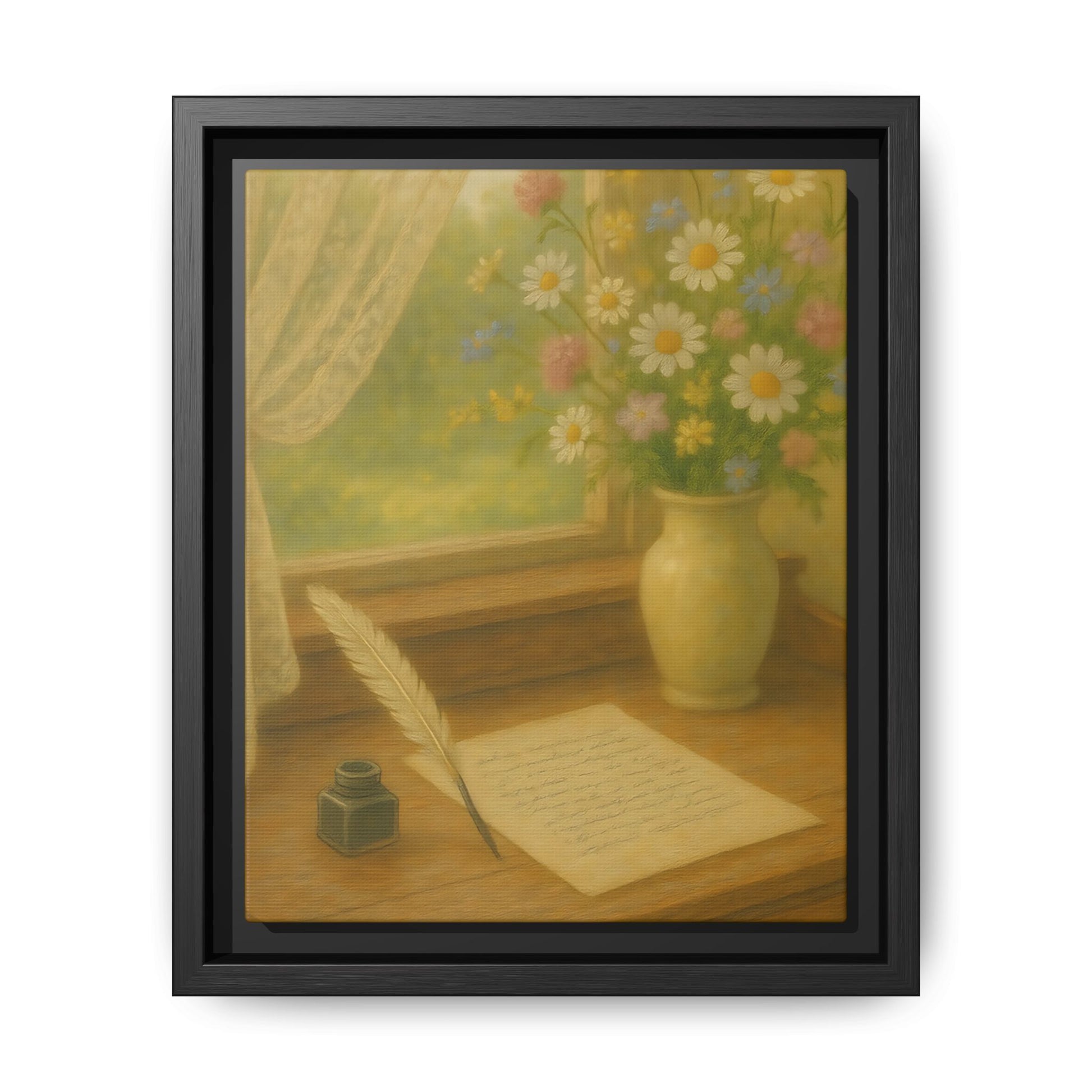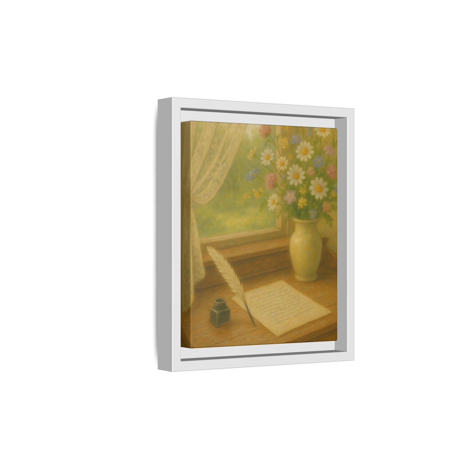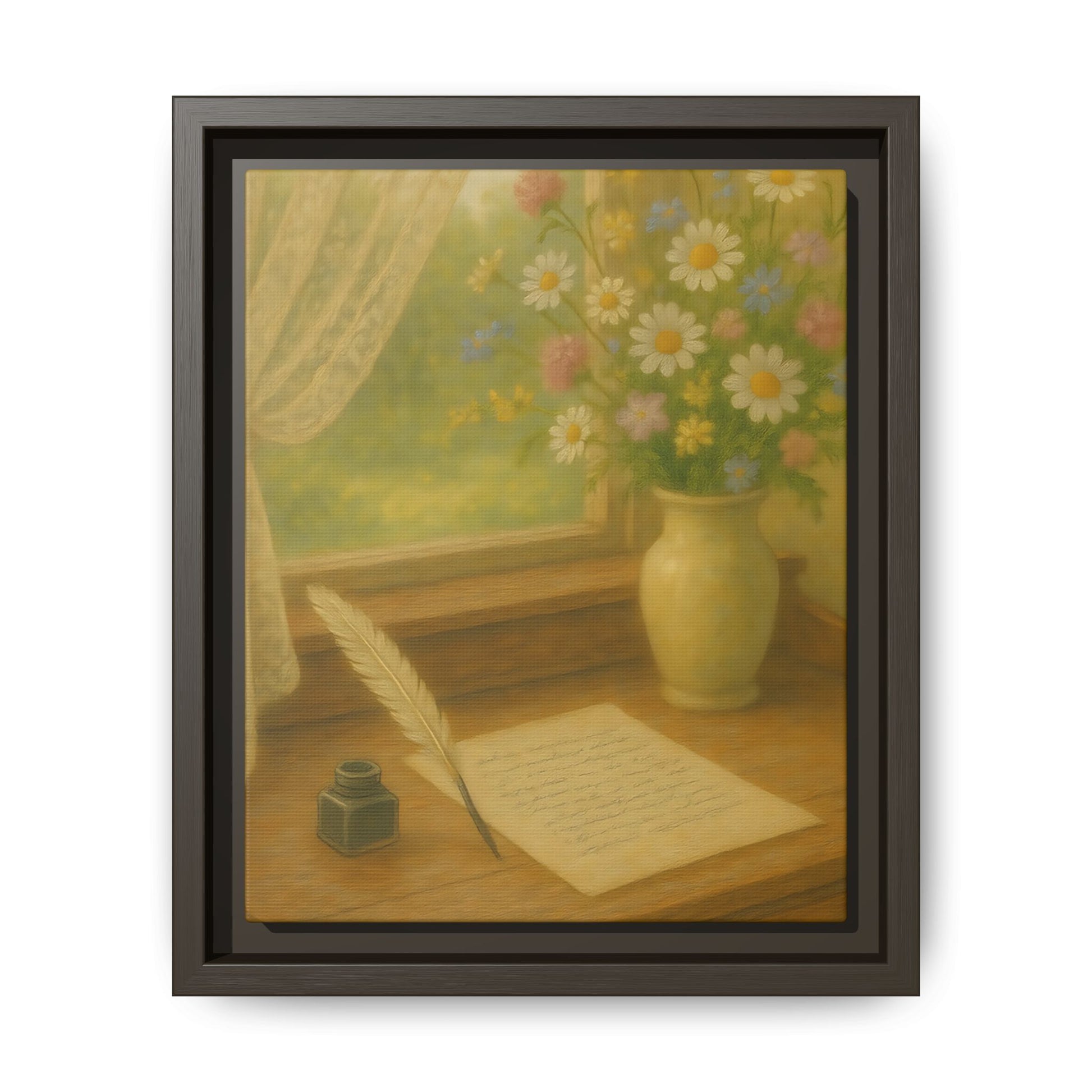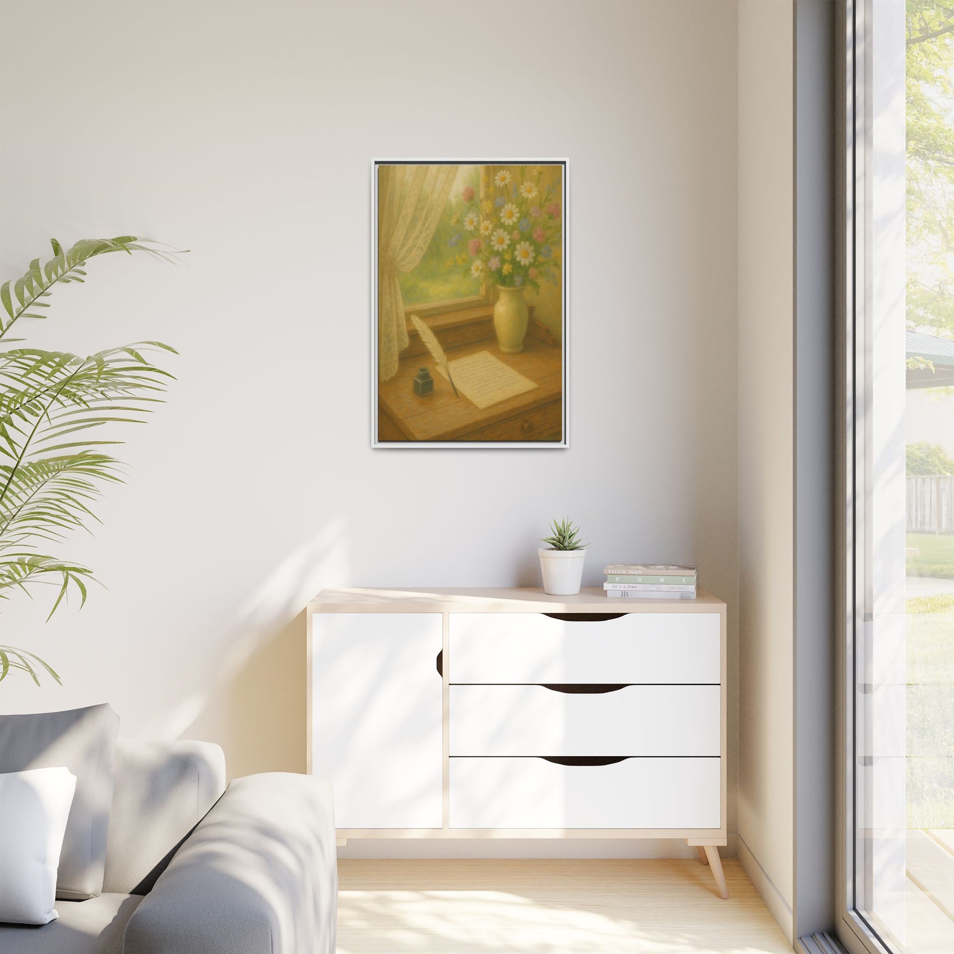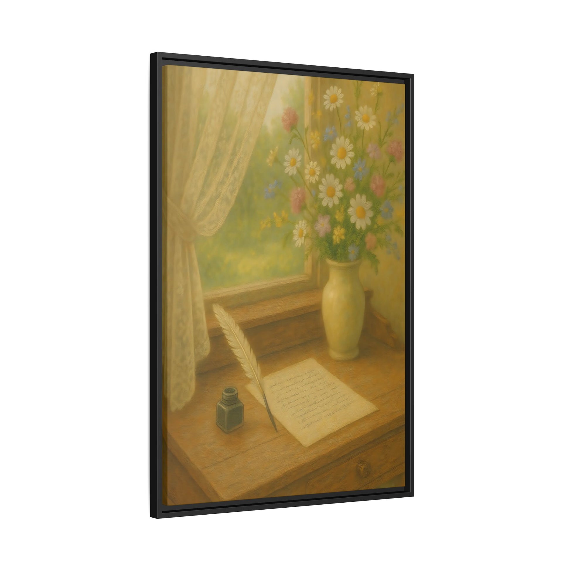 Sunlit Writing Desk – Framed Matte Canvas Art of Quill, Flowers & Lace Window