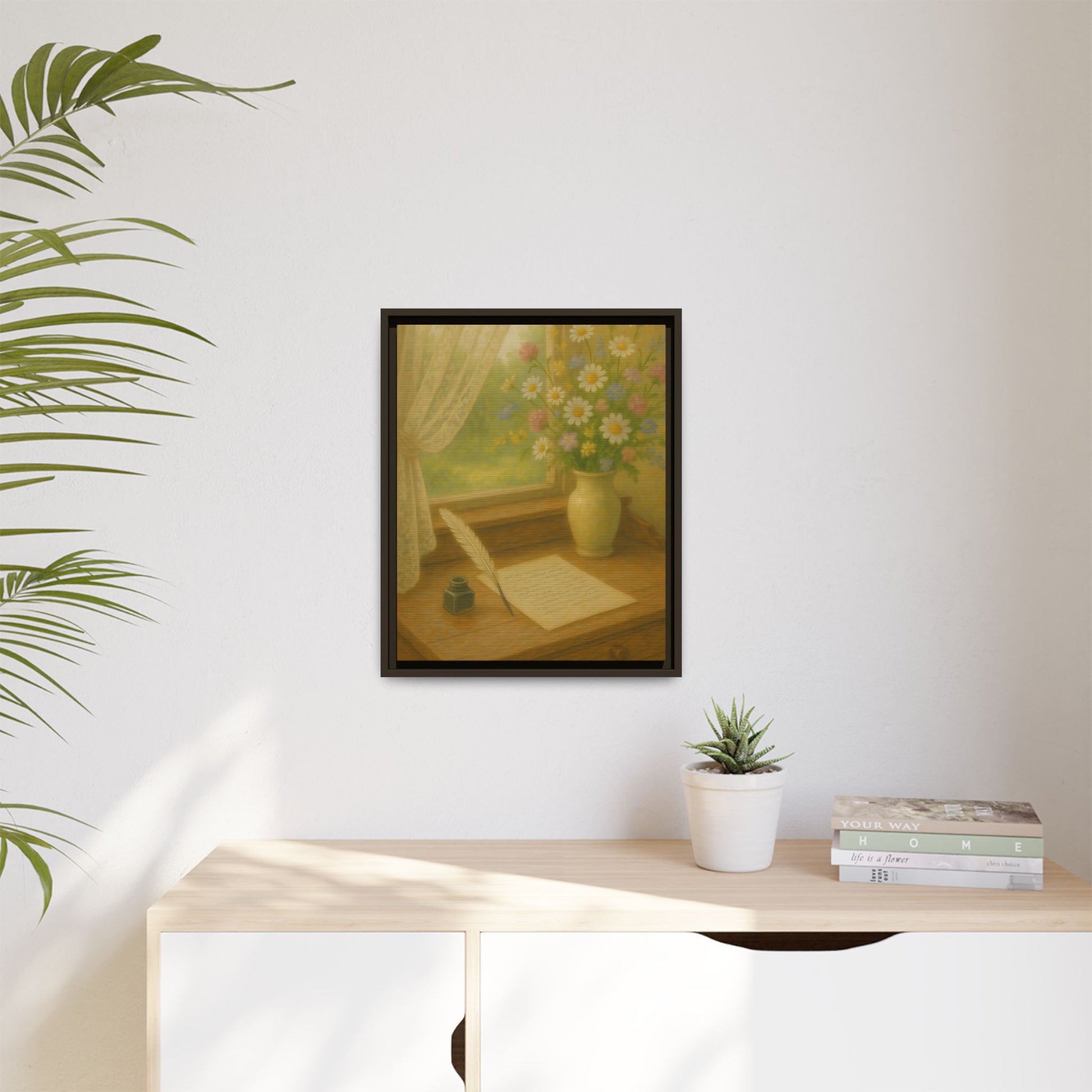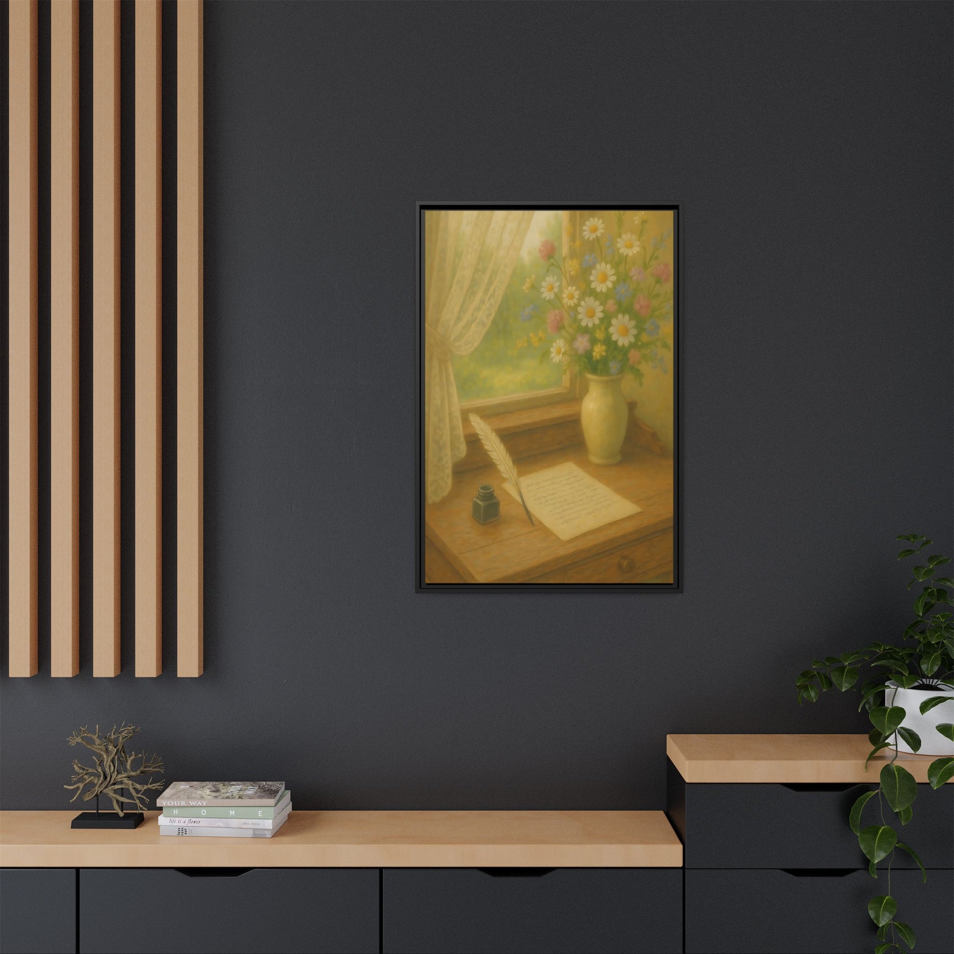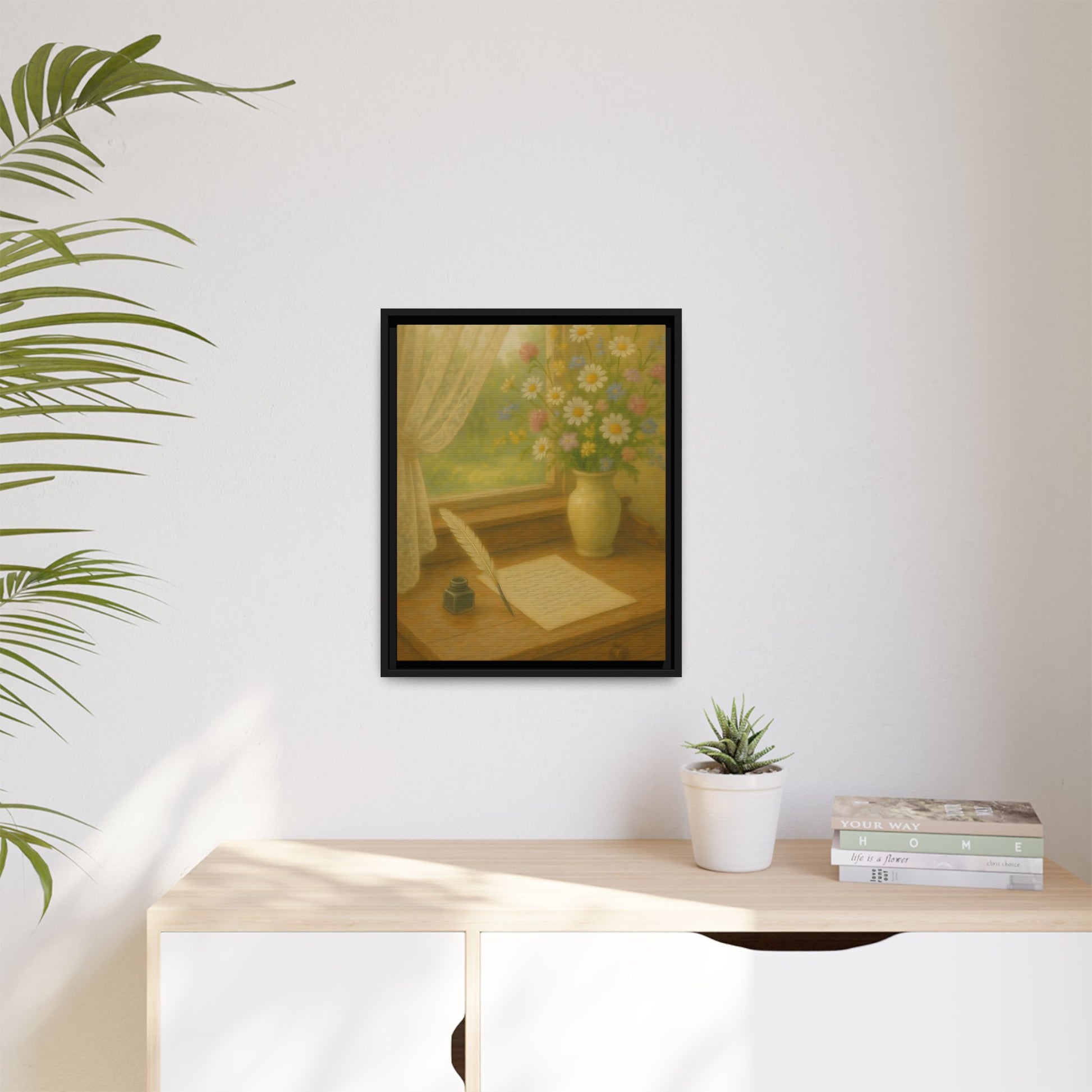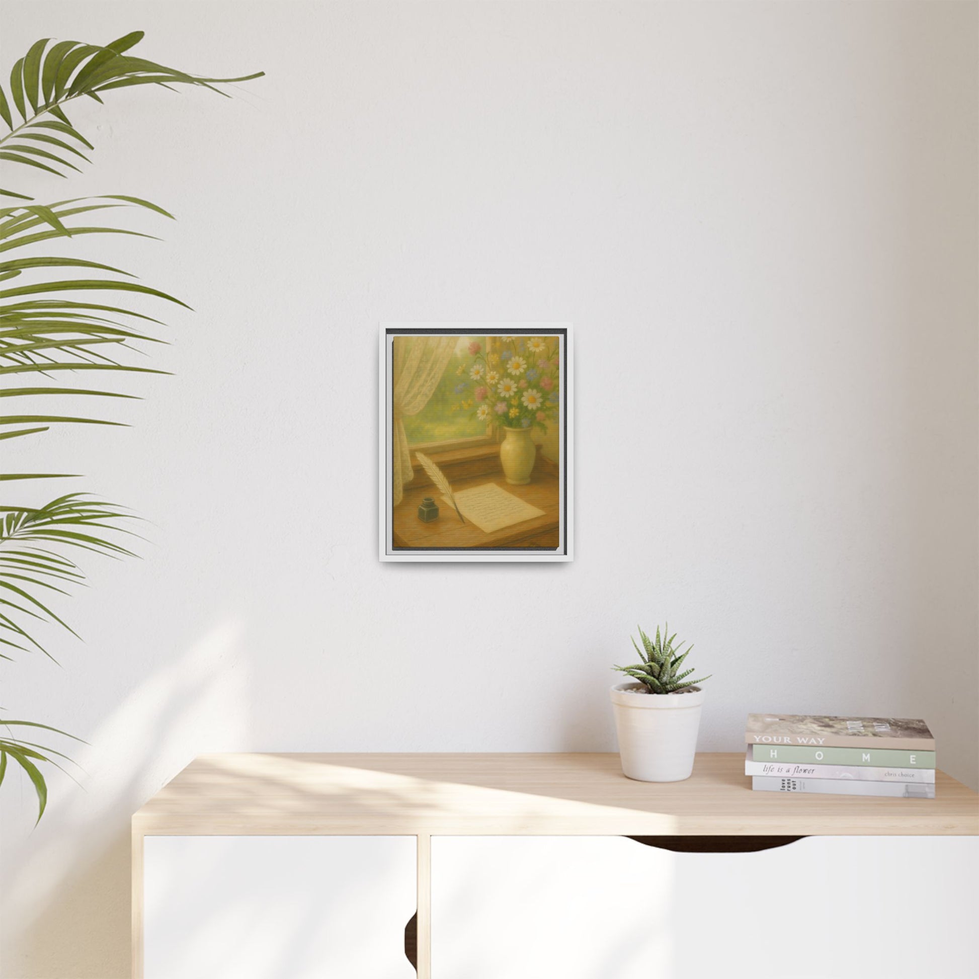 Sunlit Writing Desk – Framed Matte Canvas Art of Quill, Flowers & Lace Window.