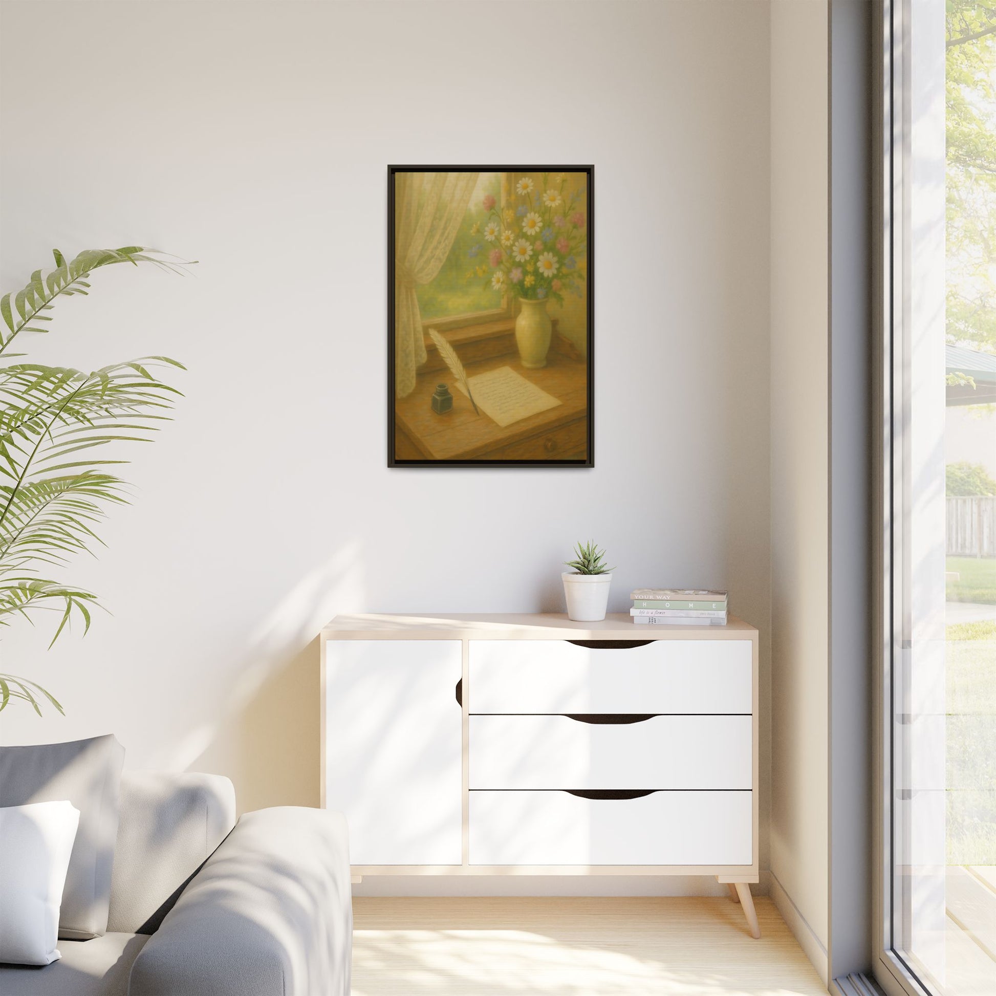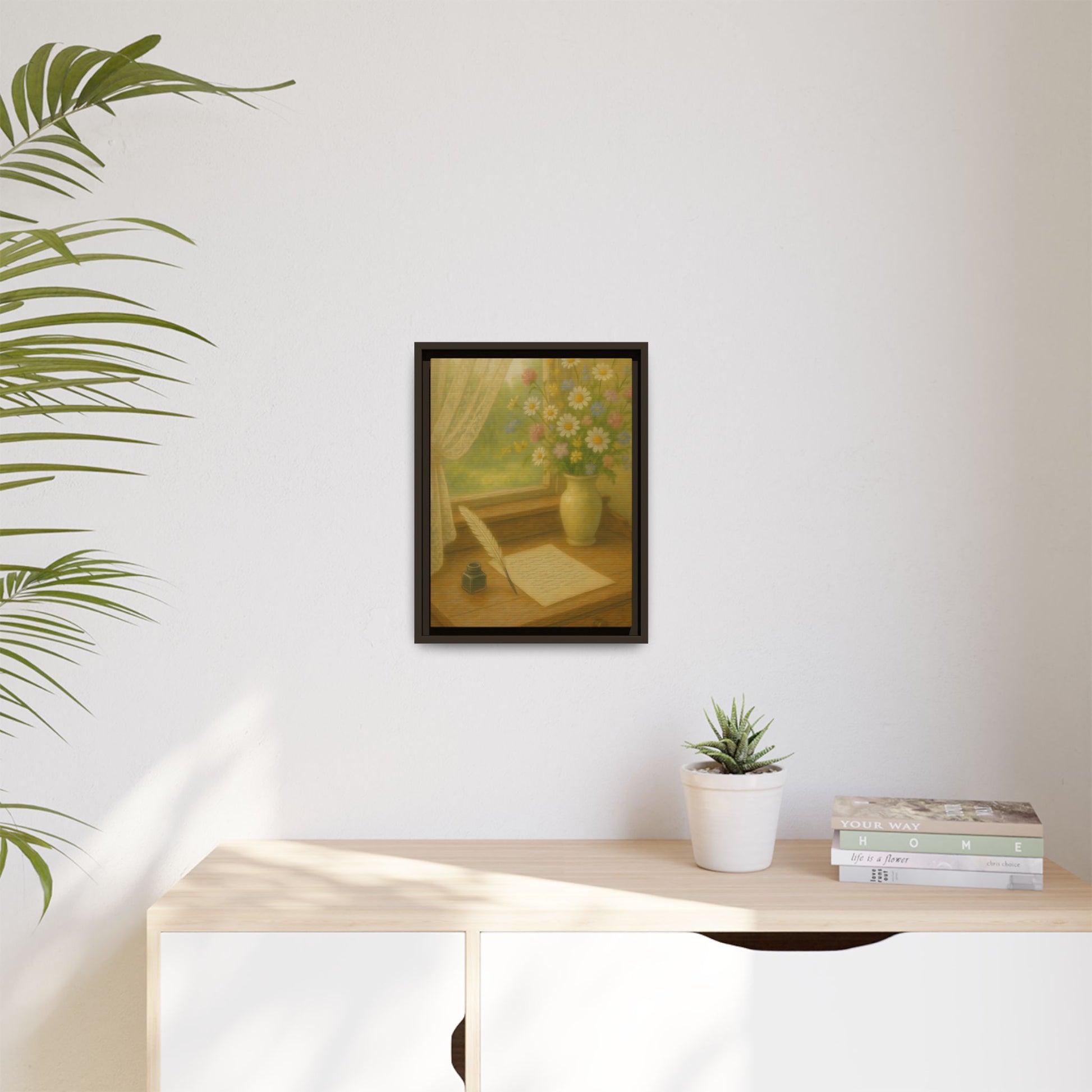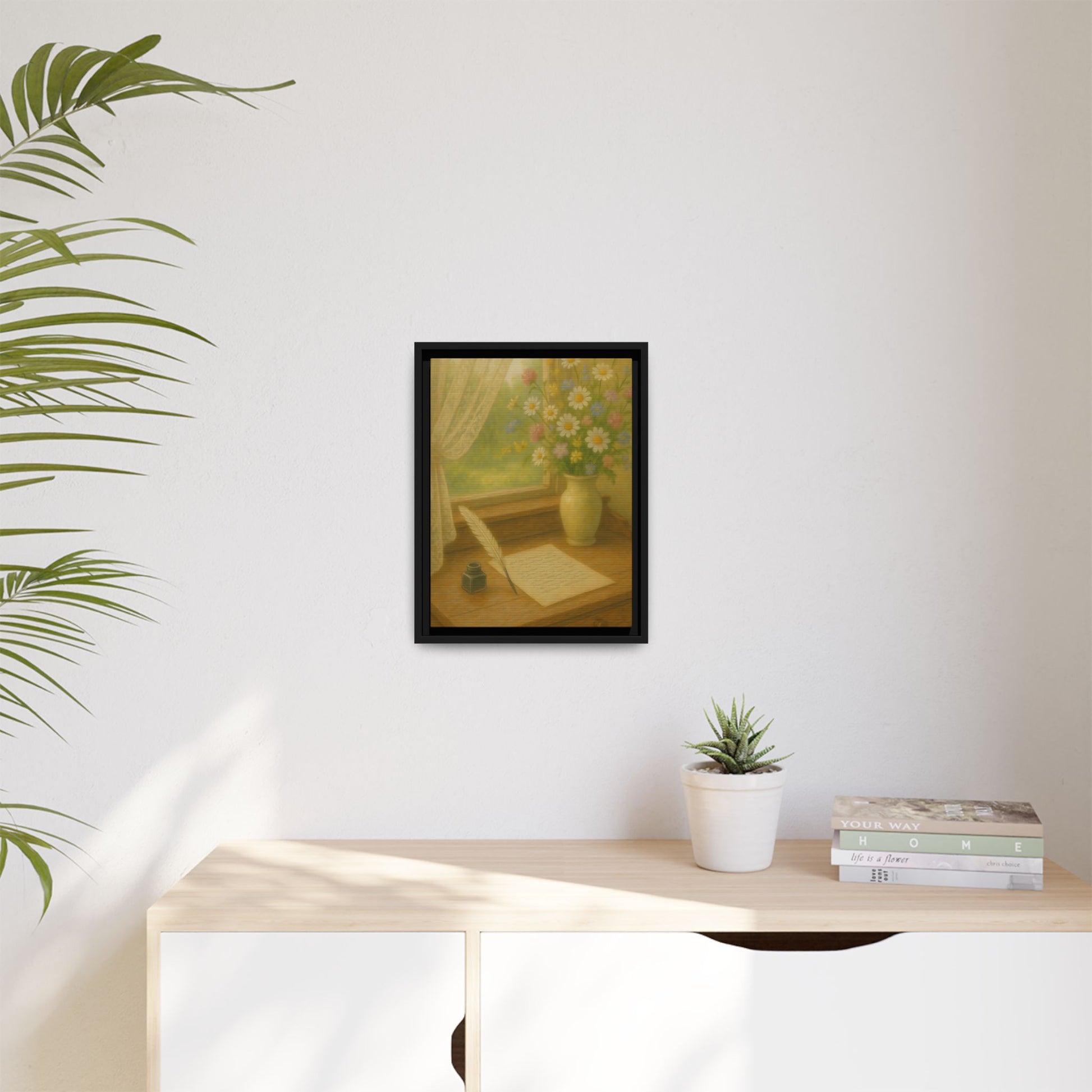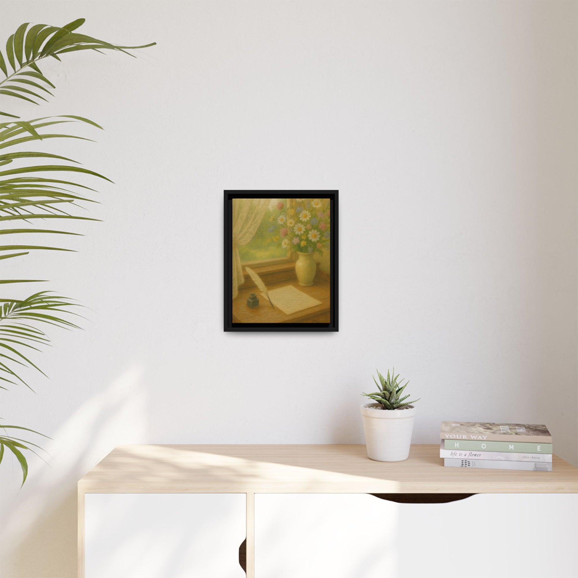 Sunlit Writing Desk – Framed Matte Canvas Art of Quill, Flowers & Lace Window.
