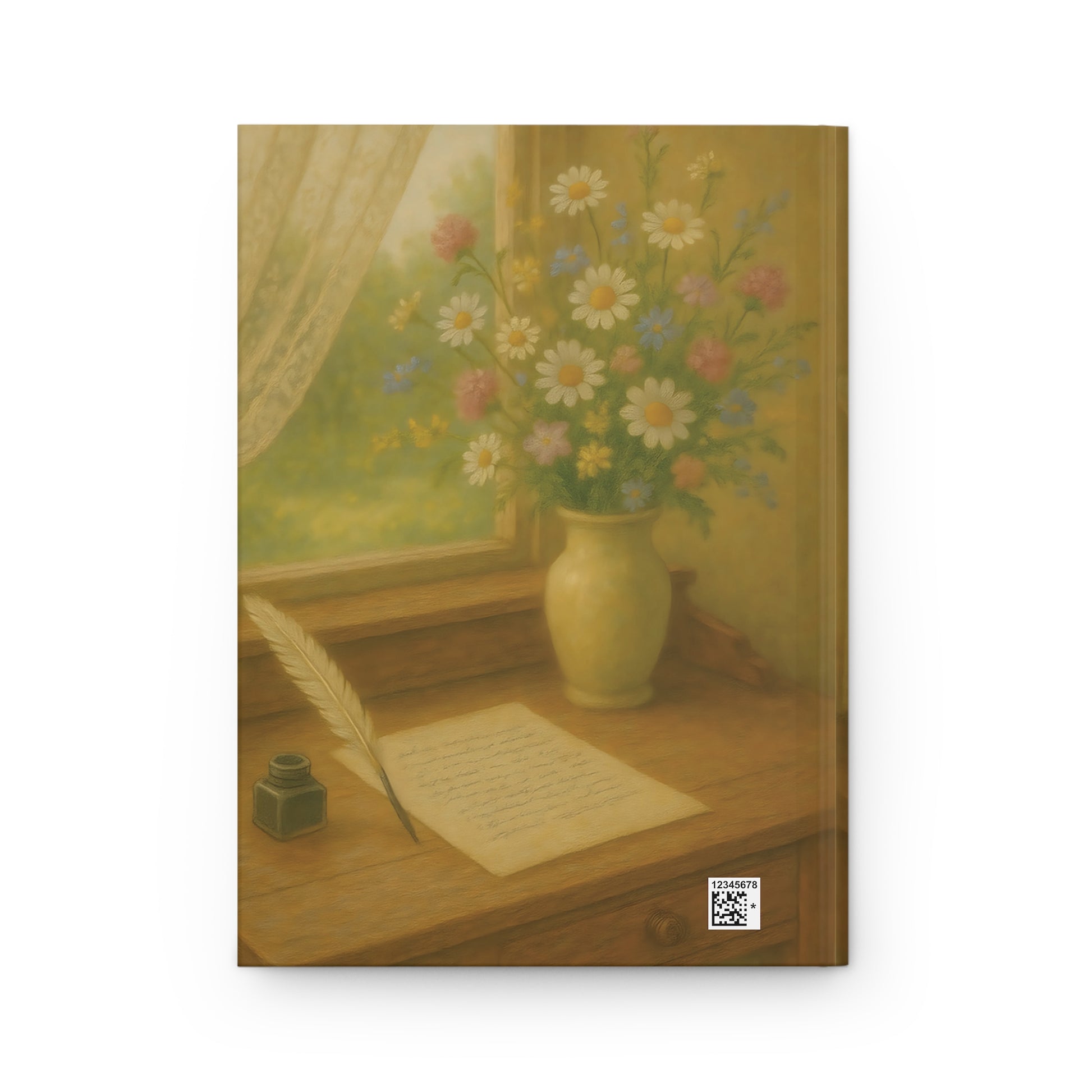 This beautifully illustrated hardcover journal features a romantic scene of a wooden desk by a lace-curtained window, complete with a quill pen, ink bottle, handwritten letter, and a vase of blooming wildflowers.