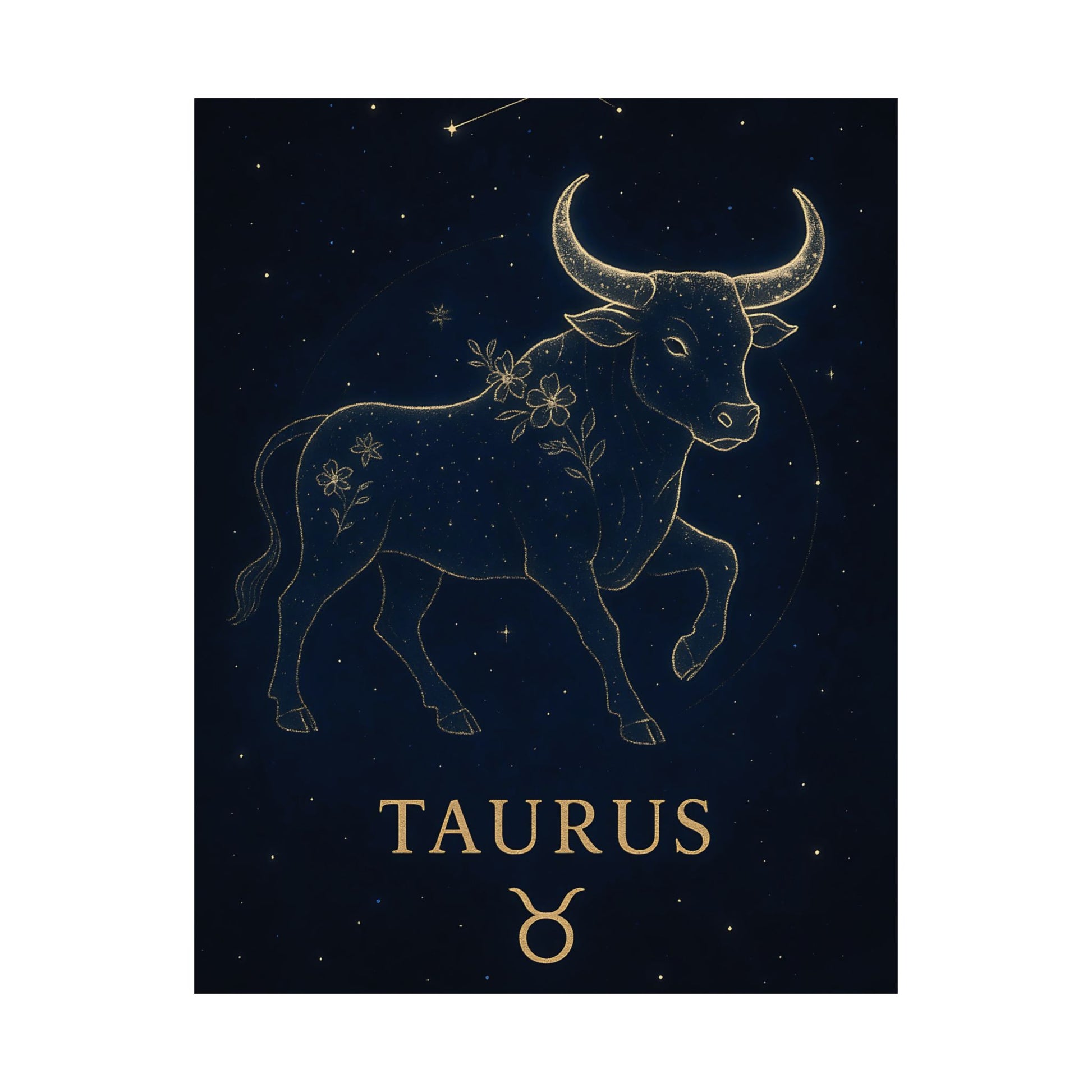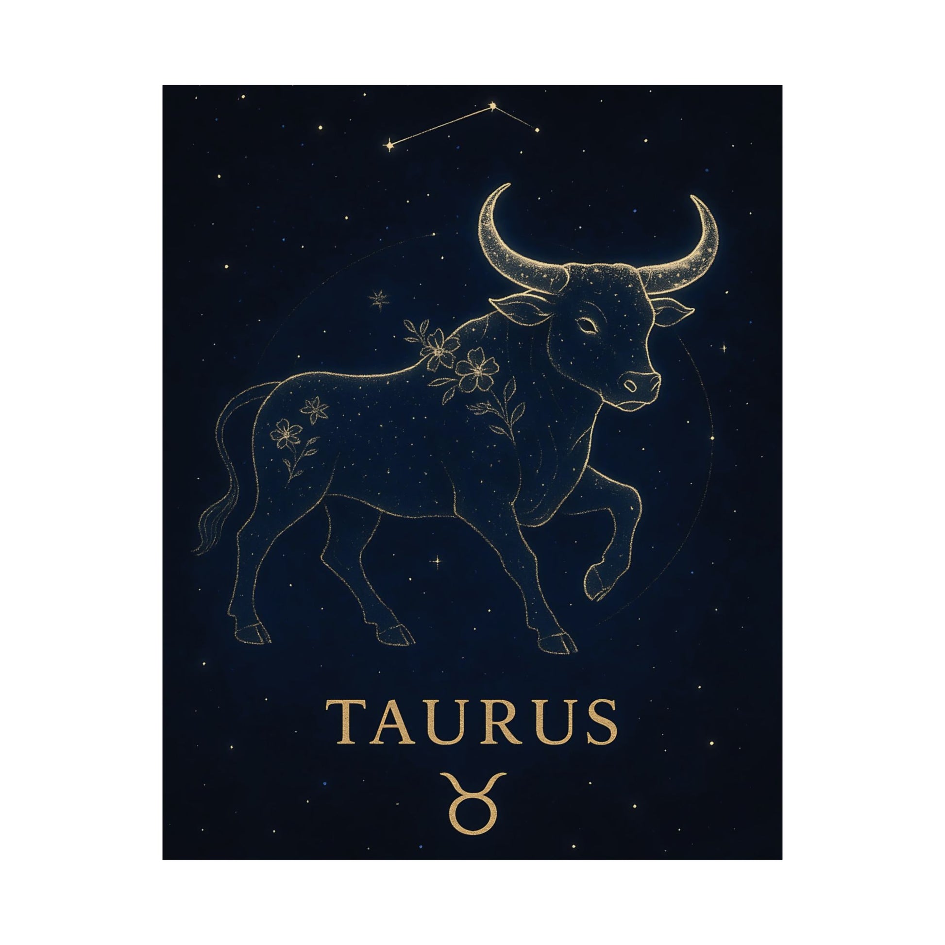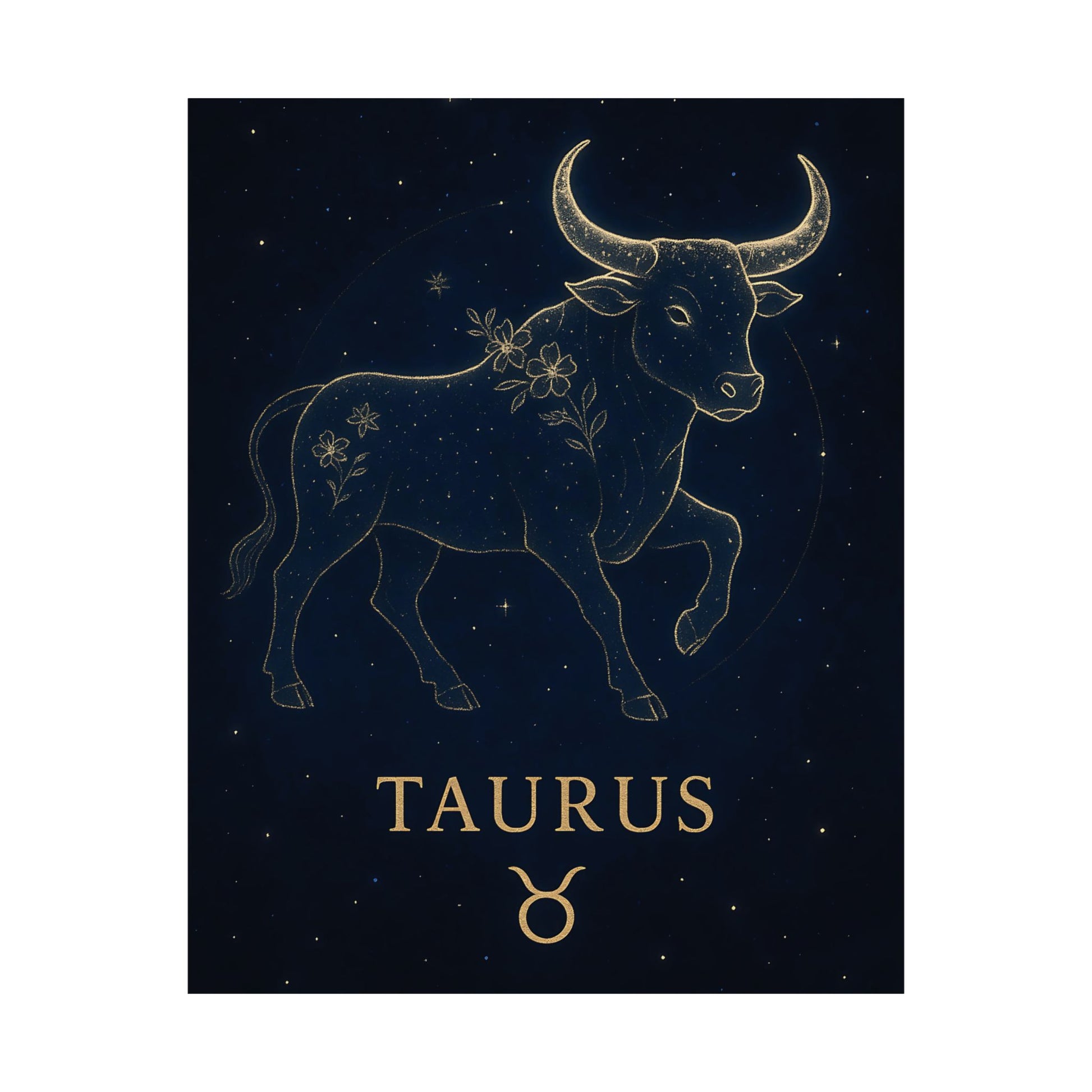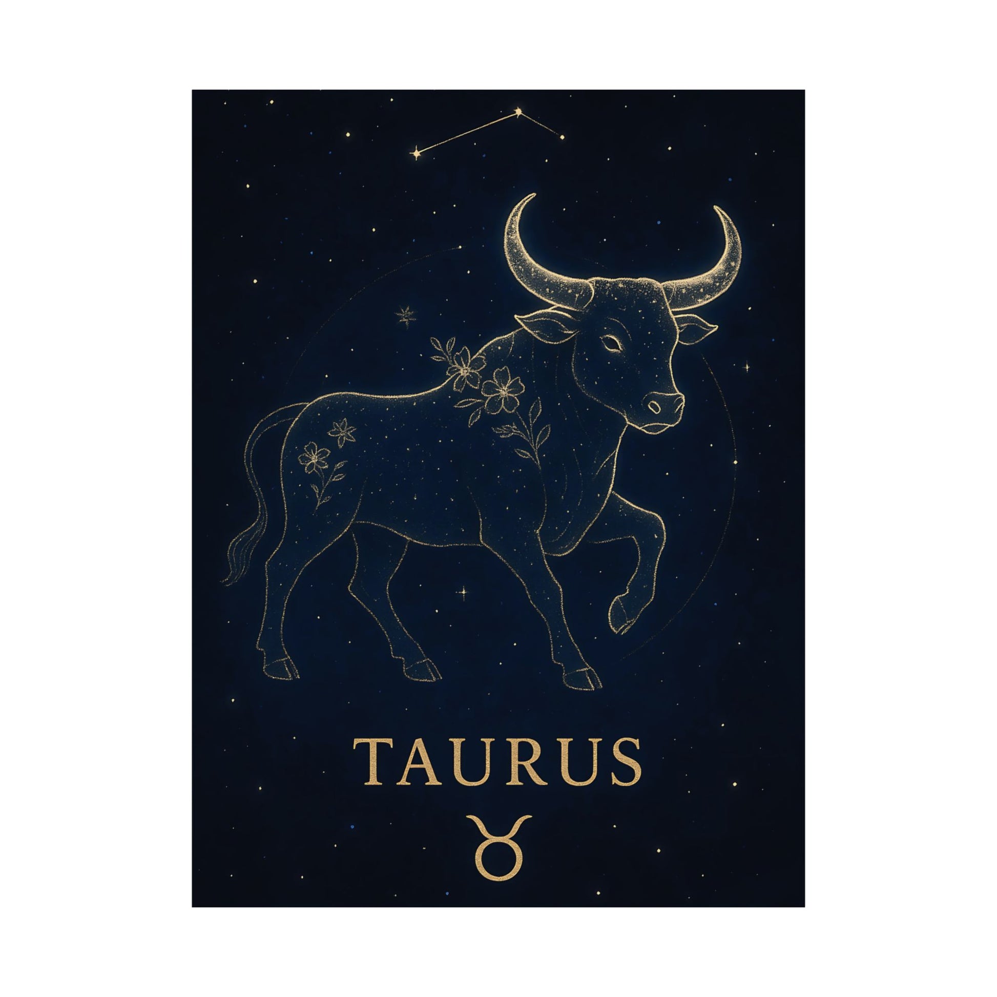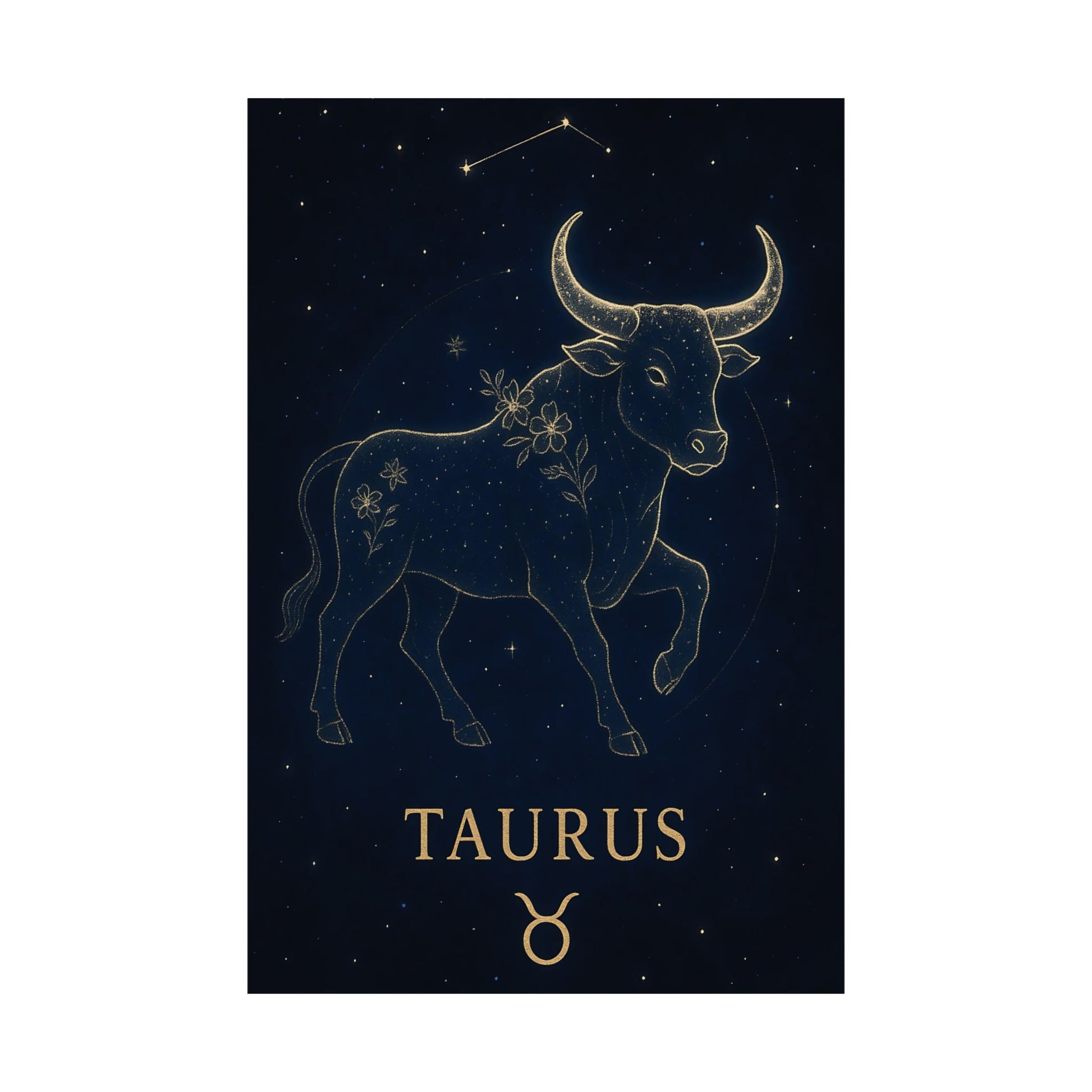 Celebrate your grounded and graceful nature with the Taurus Zodiac Constellation Matte Poster, showcasing a luminous golden bull surrounded by delicate starlight and floral accents on a deep celestial background.