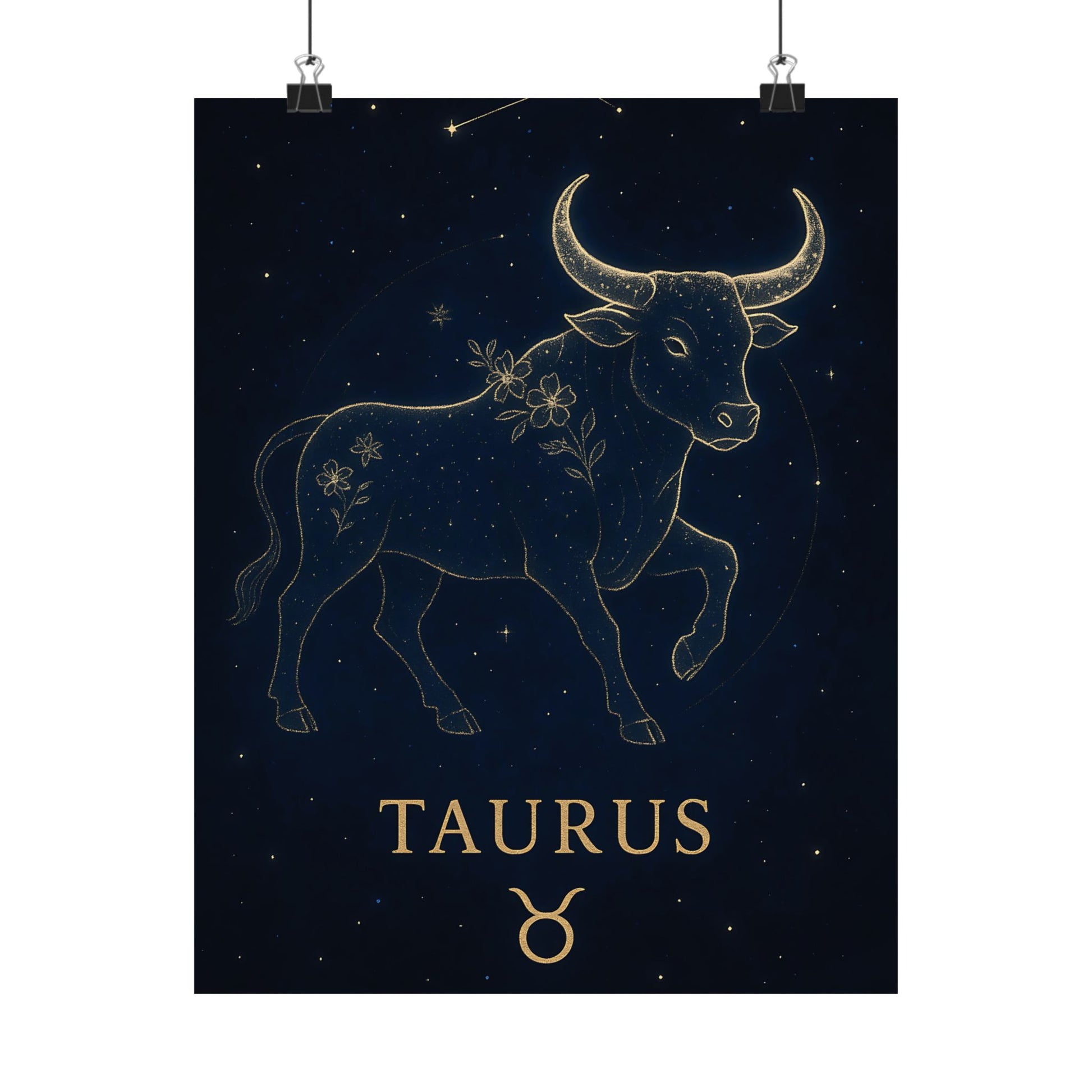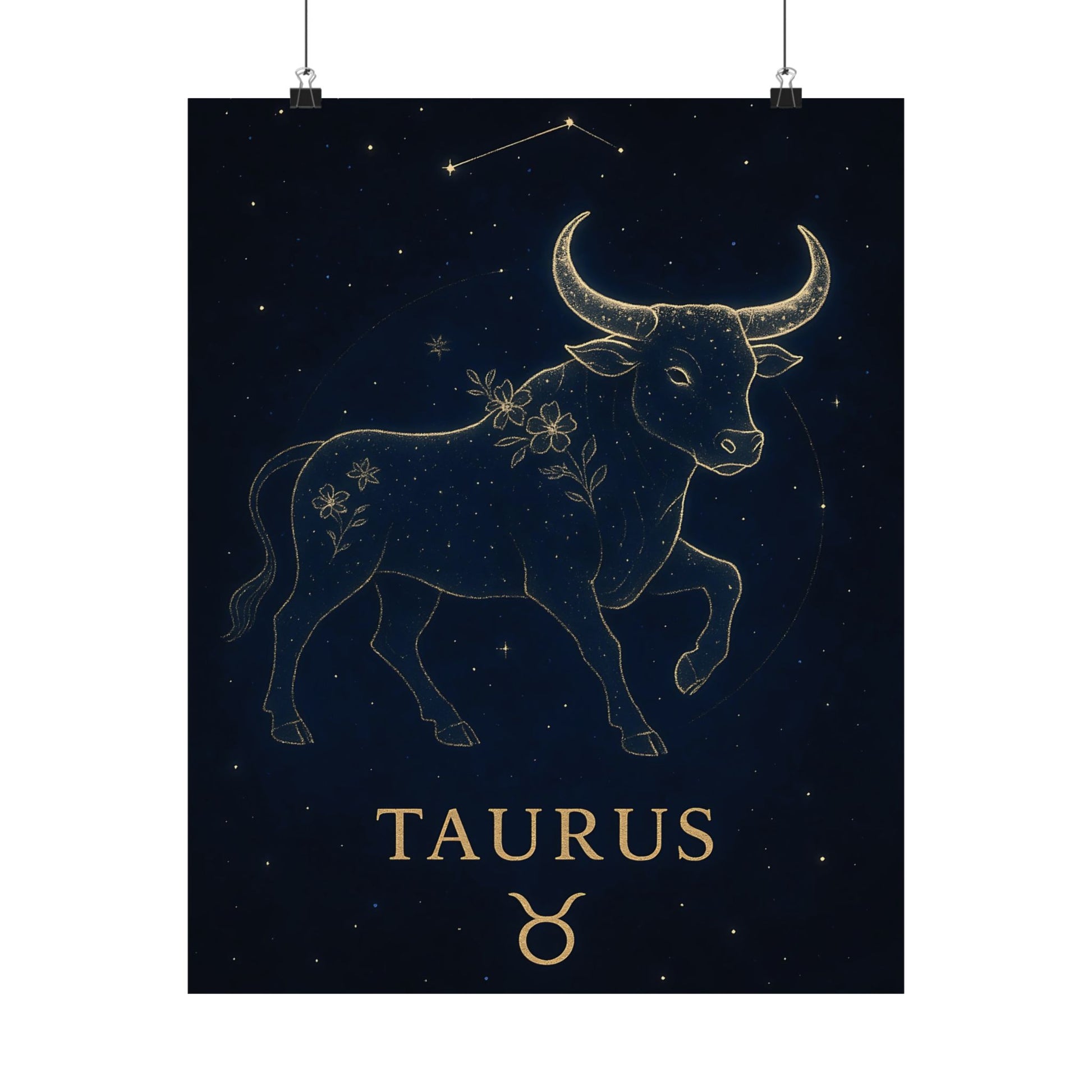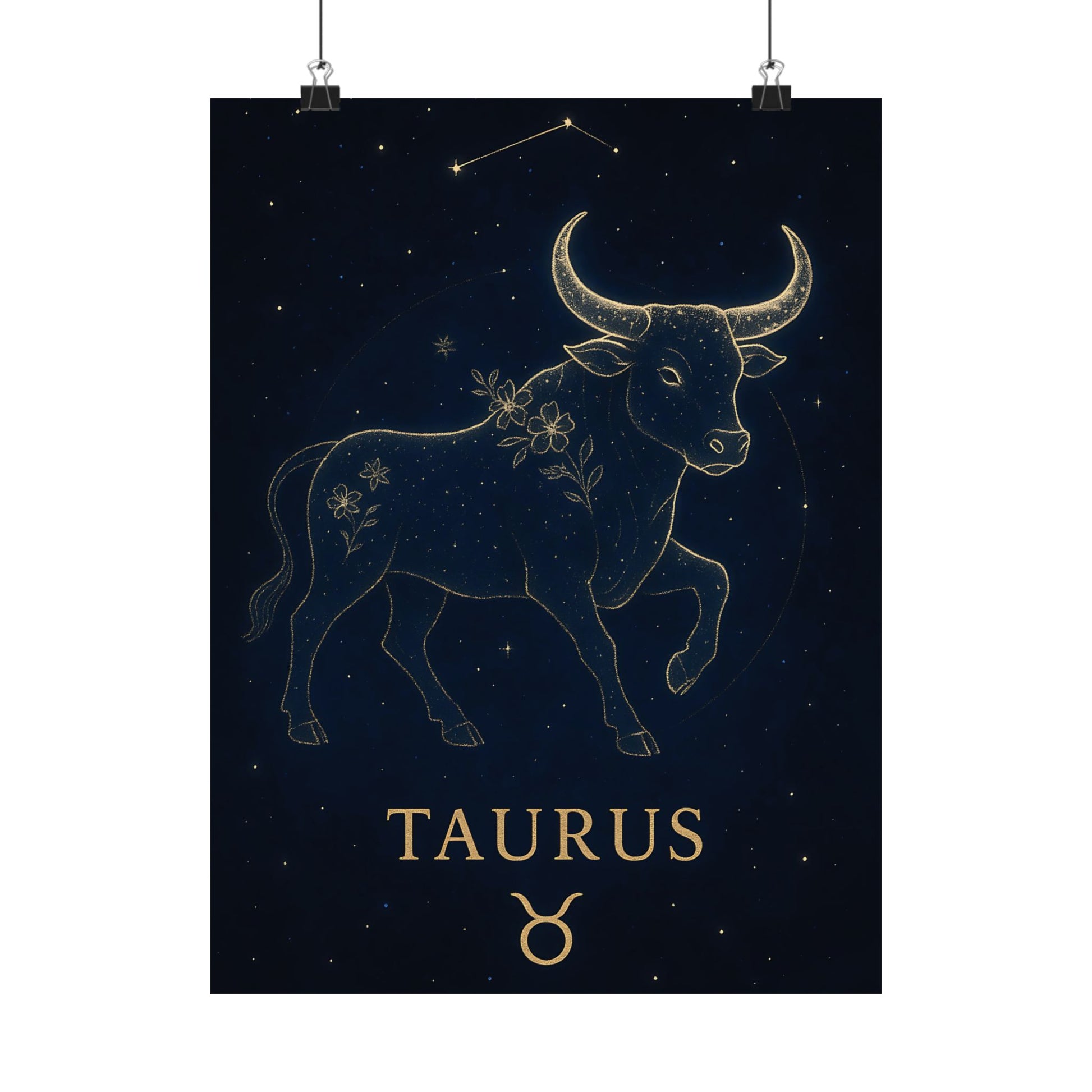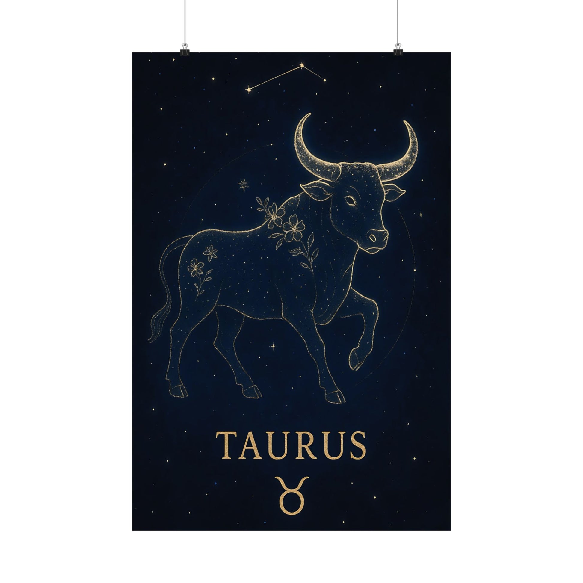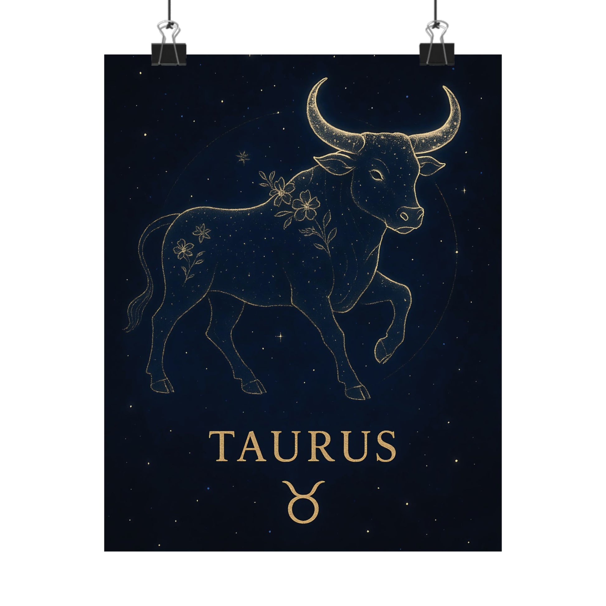 Celebrate your grounded and graceful nature with the Taurus Zodiac Constellation Matte Poster, showcasing a luminous golden bull surrounded by delicate starlight and floral accents on a deep celestial background.