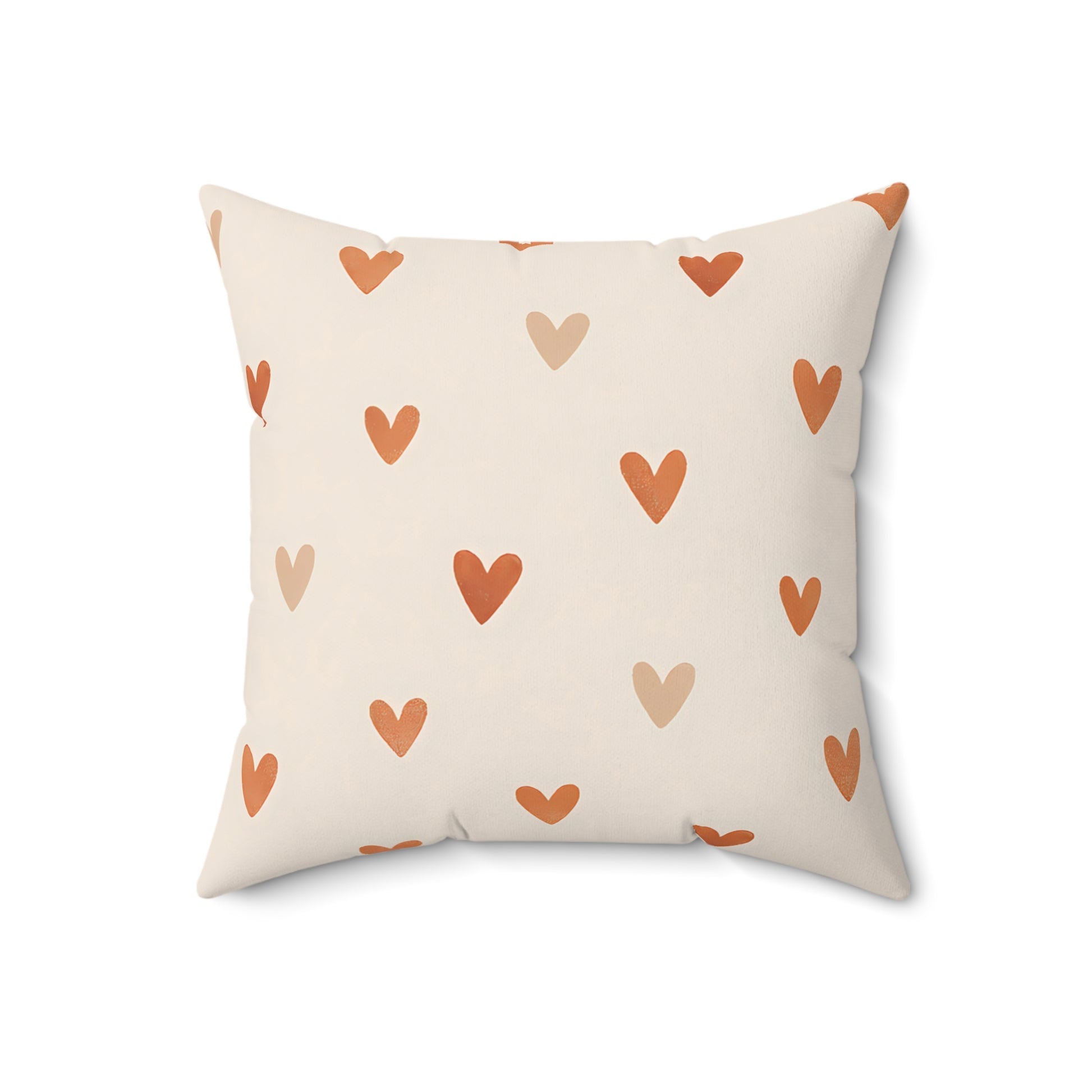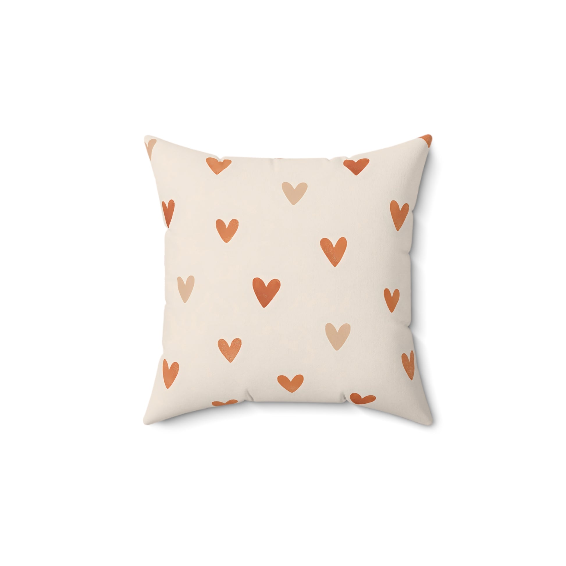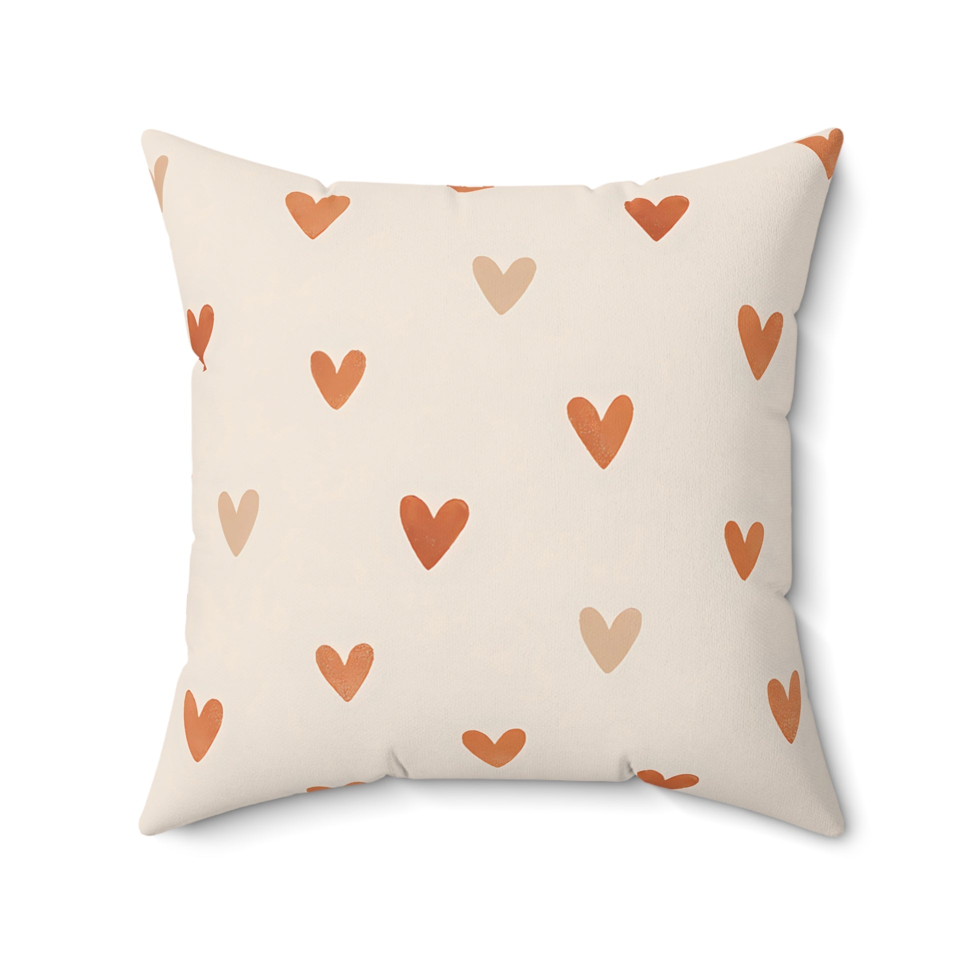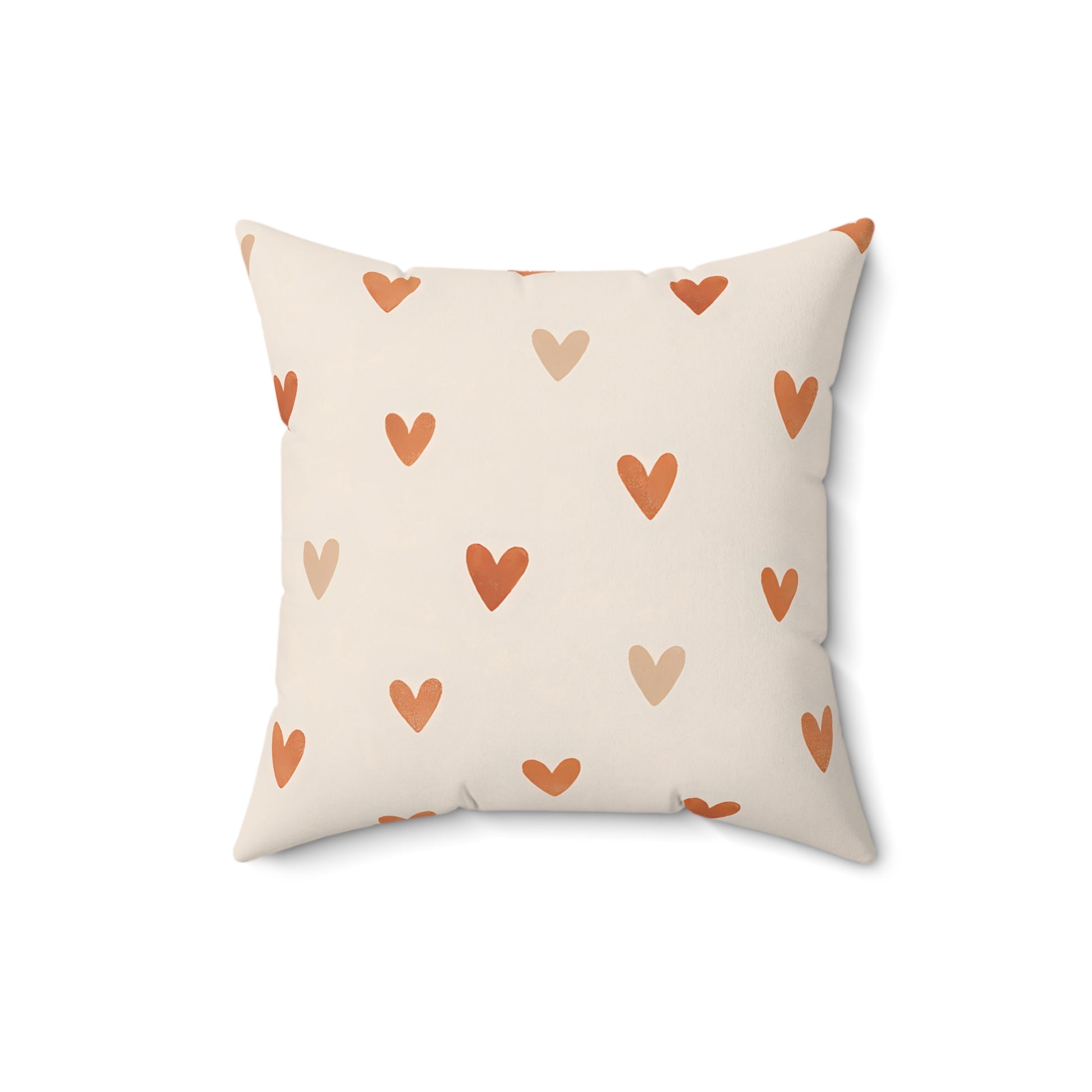 Add a playful and cozy accent to your space with this Terracotta Heart Print Throw Pillow, featuring a scattered heart pattern in warm blush and clay tones on a soft cream background.