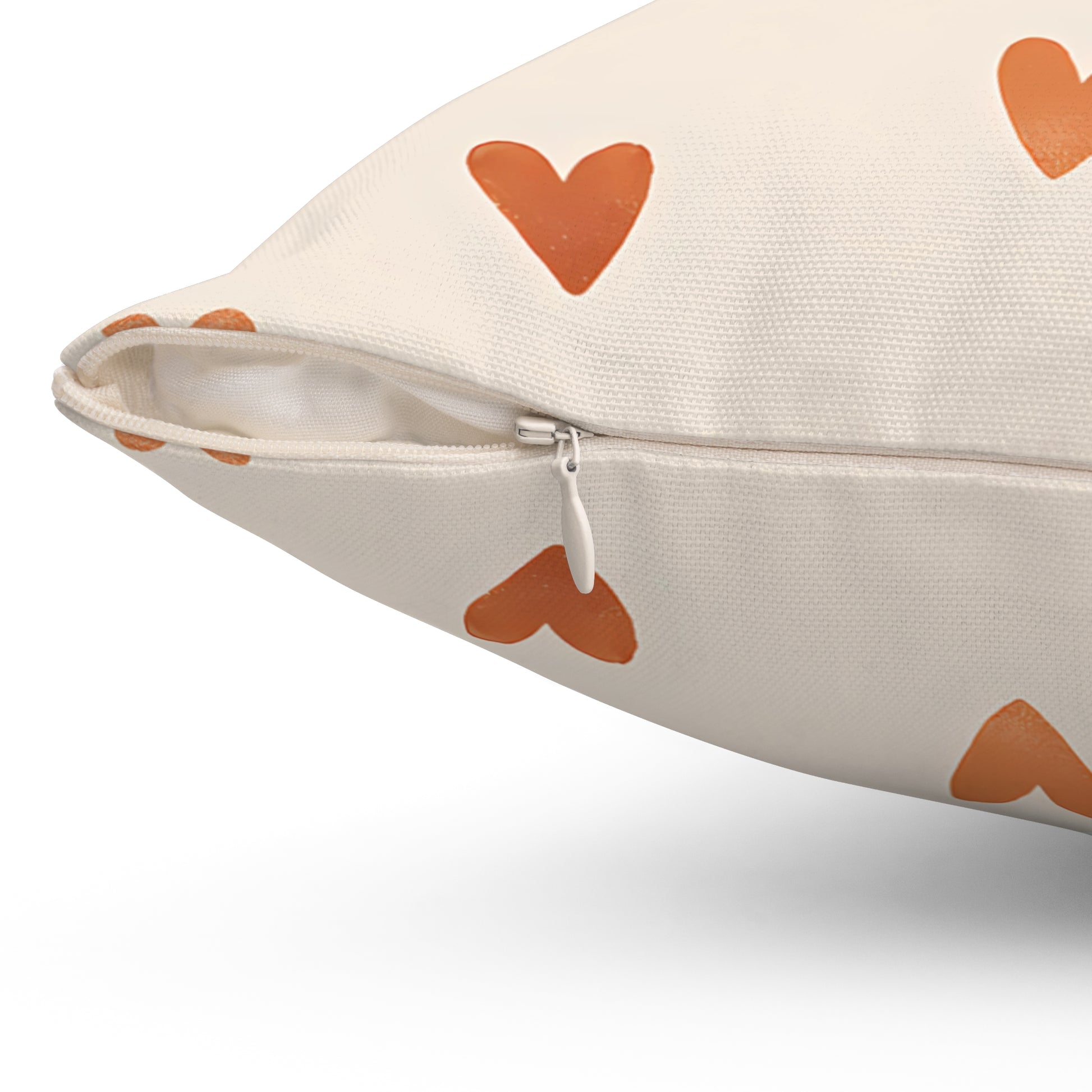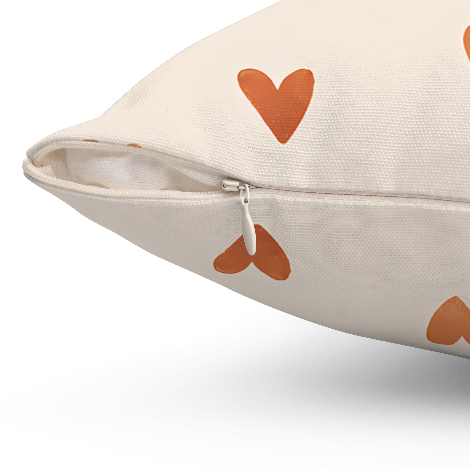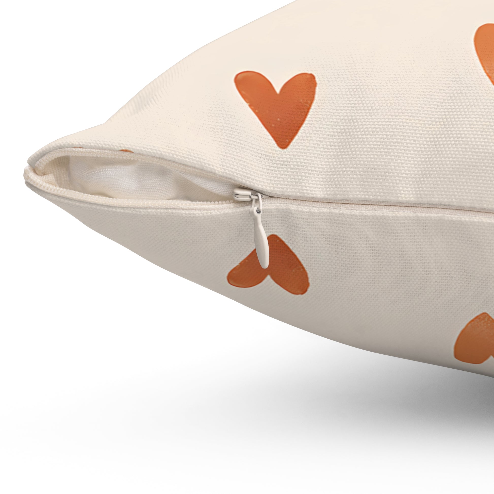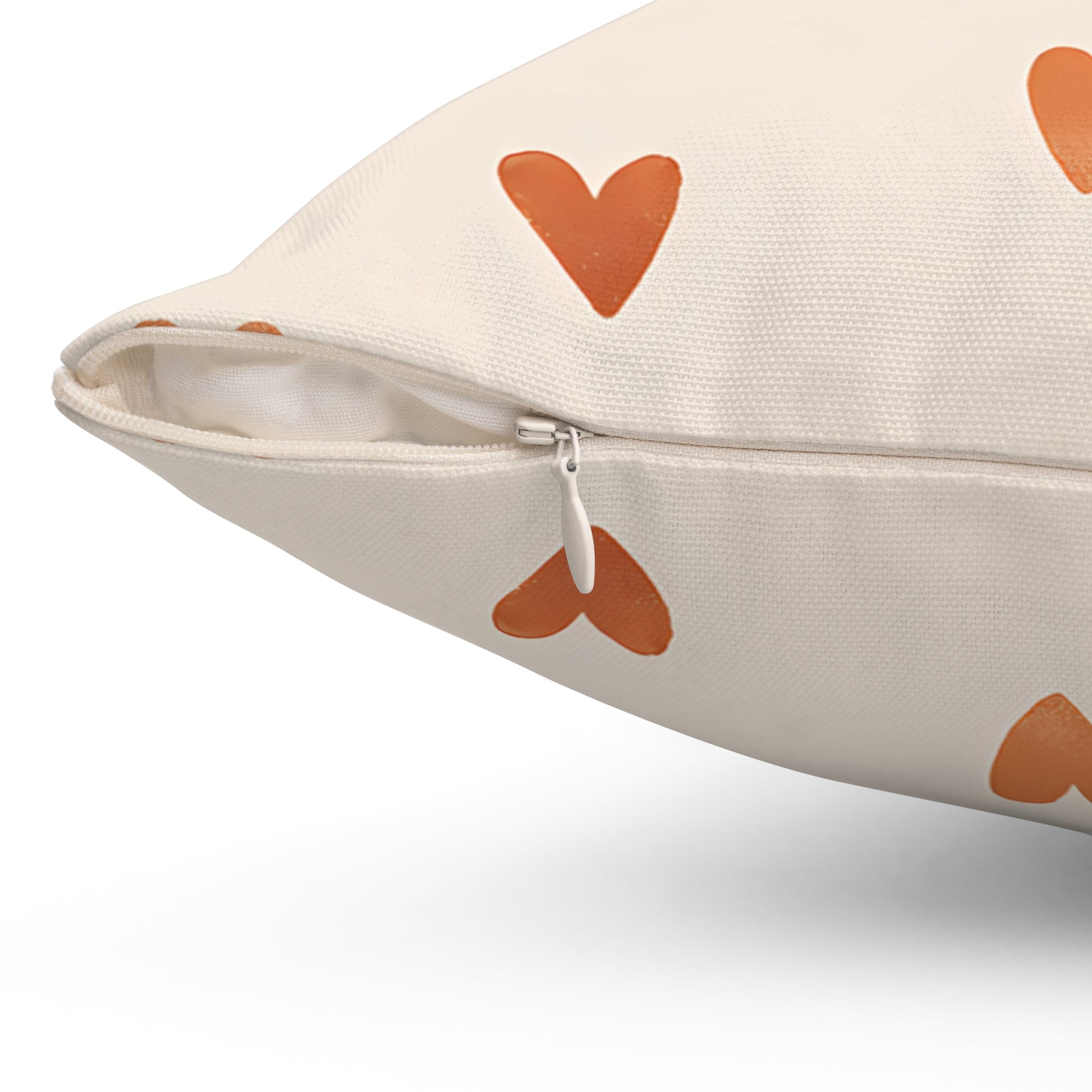 Add a playful and cozy accent to your space with this Terracotta Heart Print Throw Pillow, featuring a scattered heart pattern in warm blush and clay tones on a soft cream background.