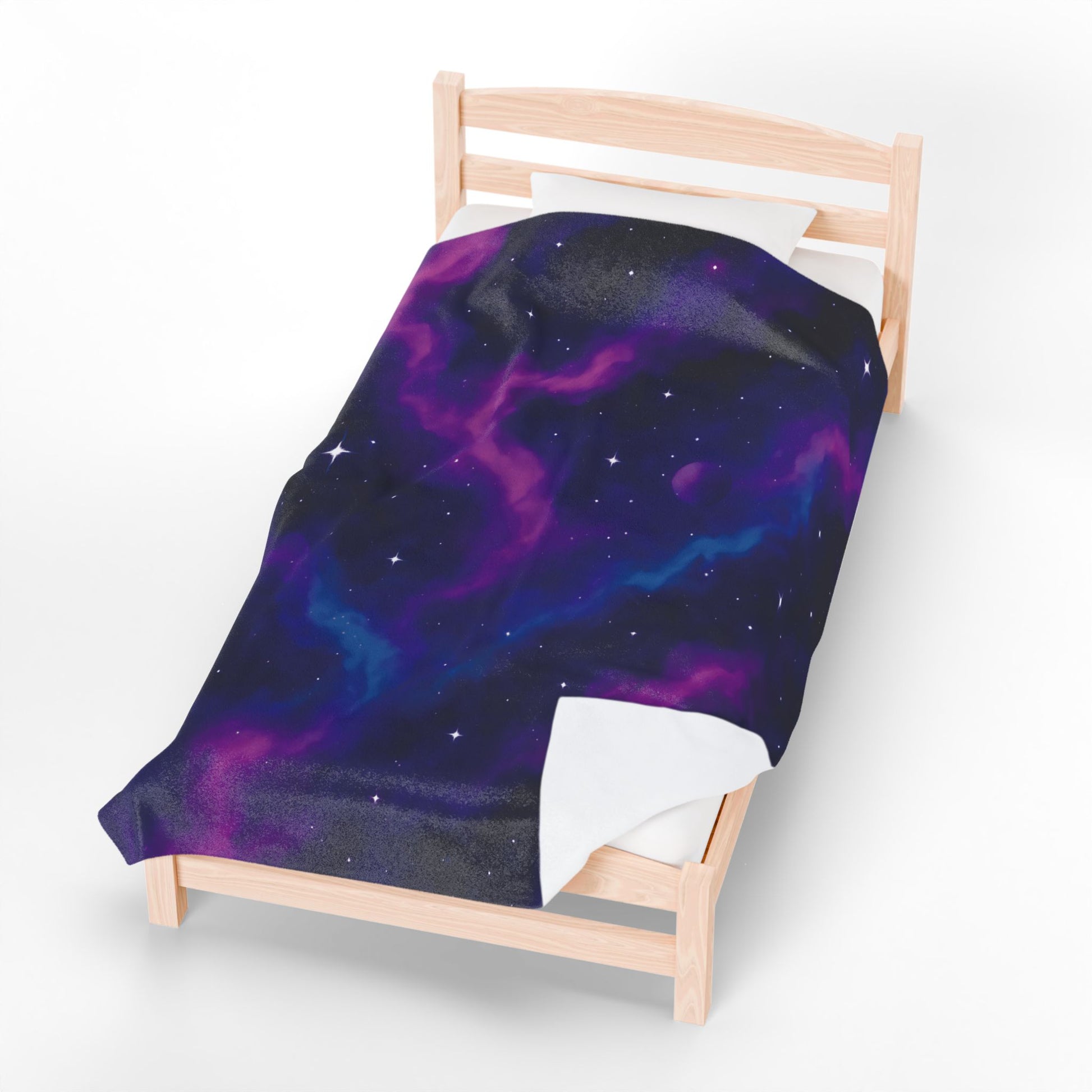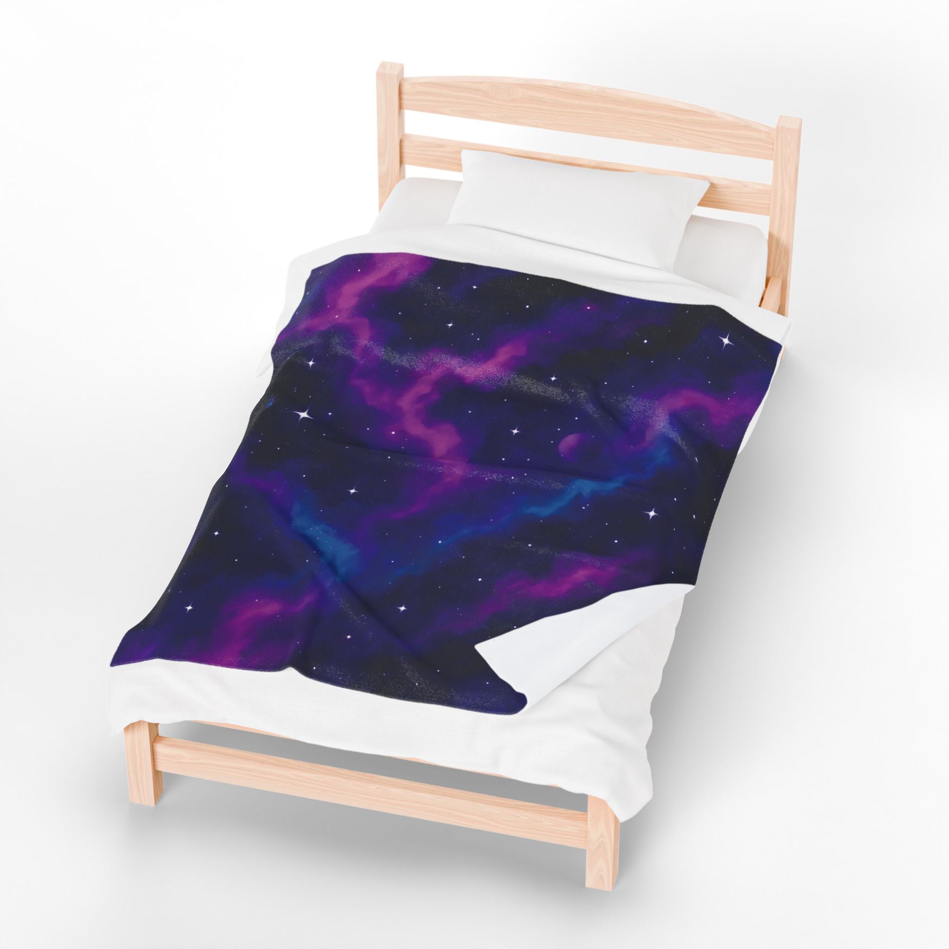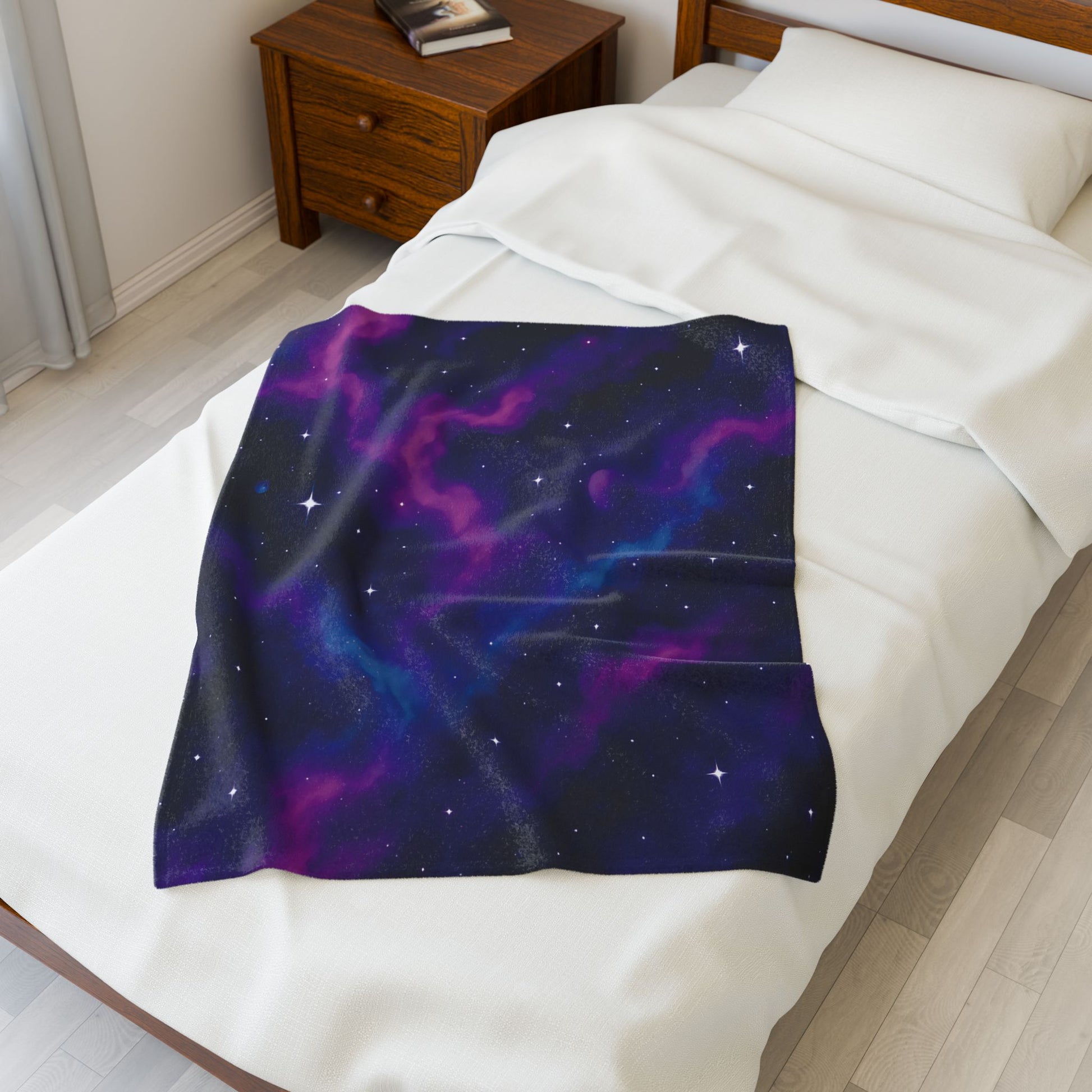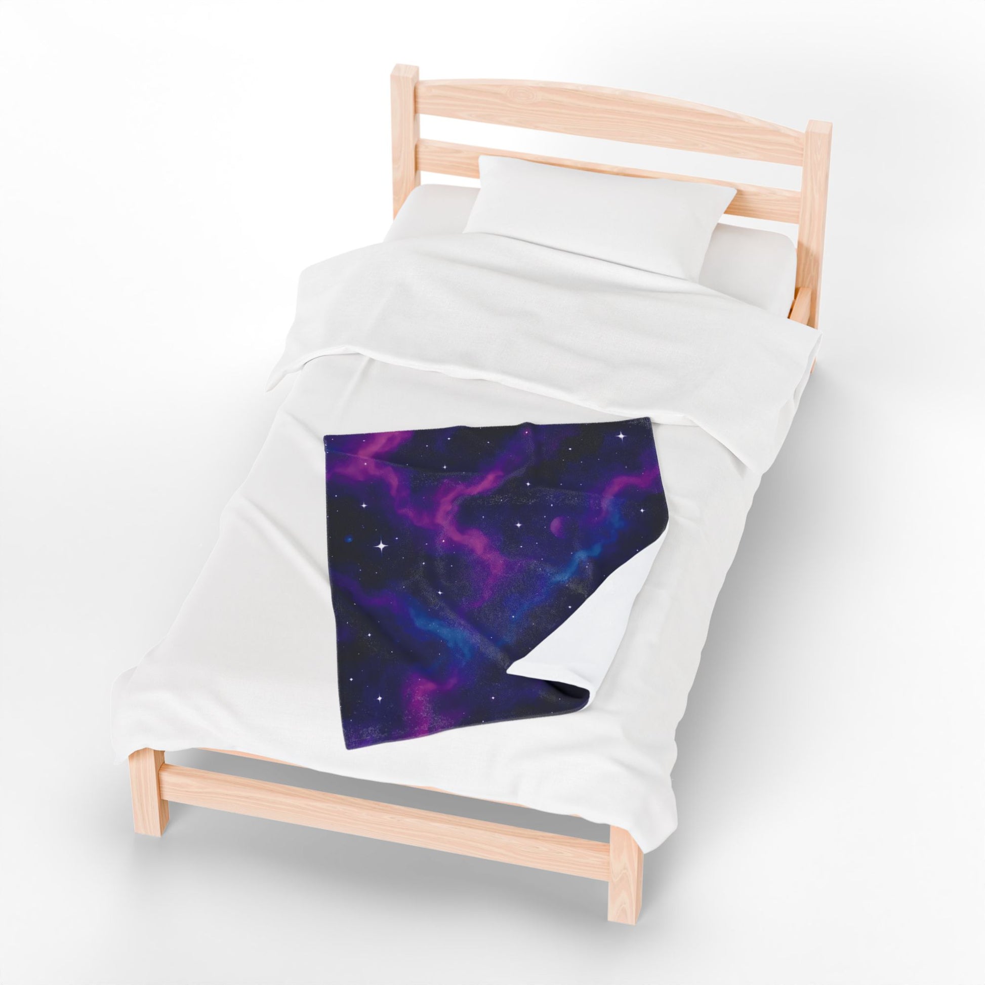 Velveteen Galaxy Plush Blanket – Cosmic Nebula Print in Purple & Blue (Adult Size).