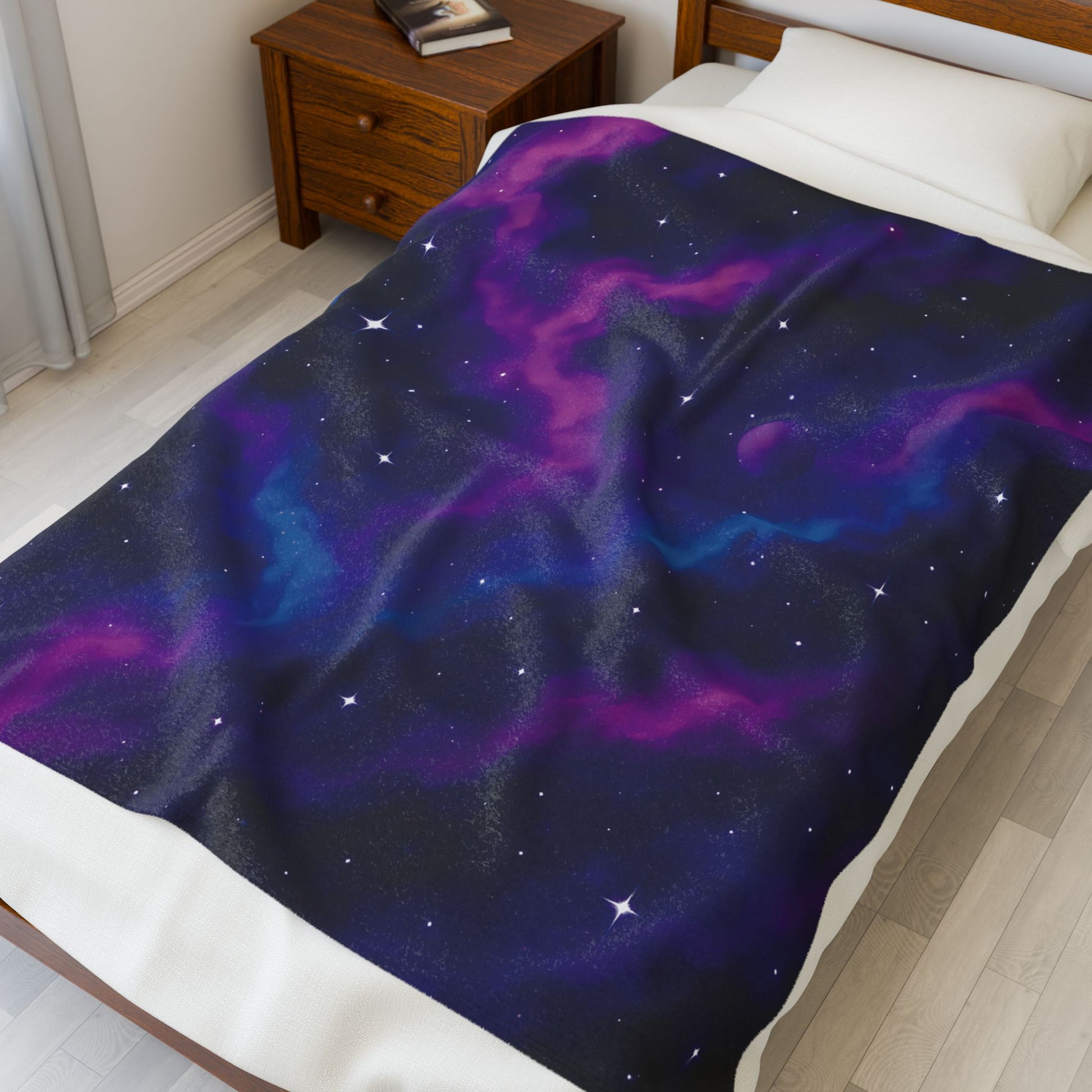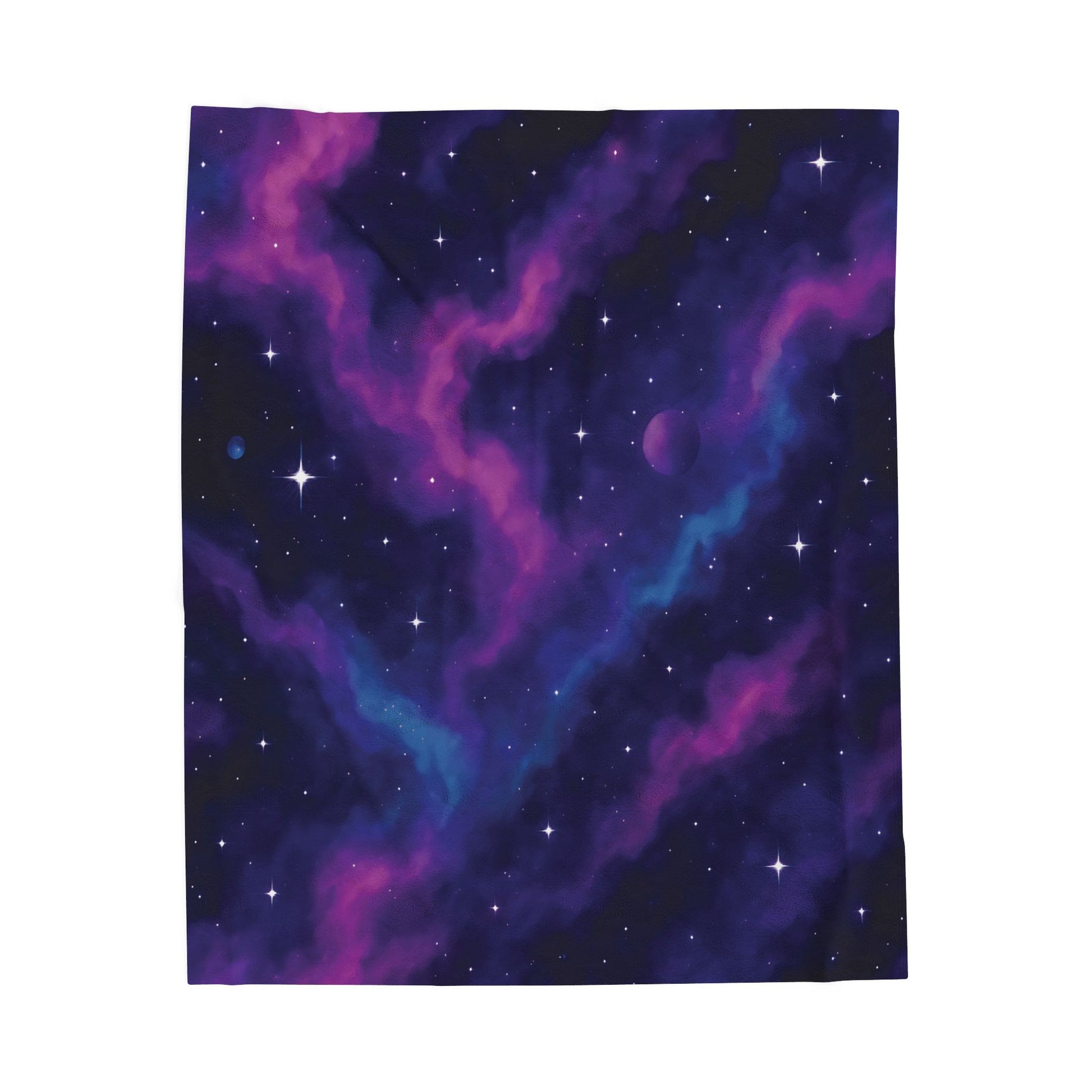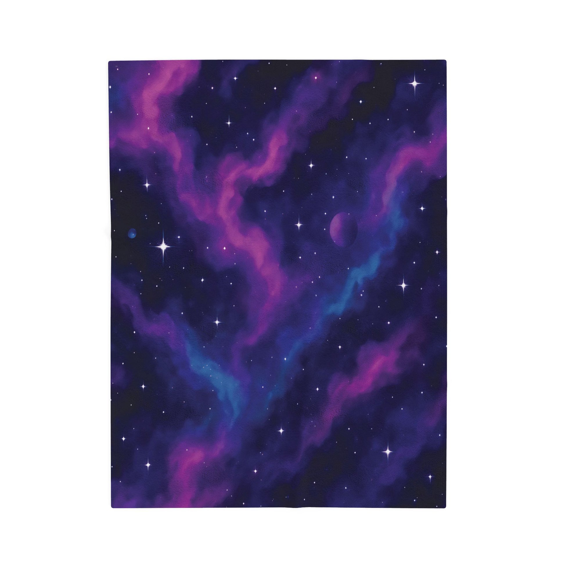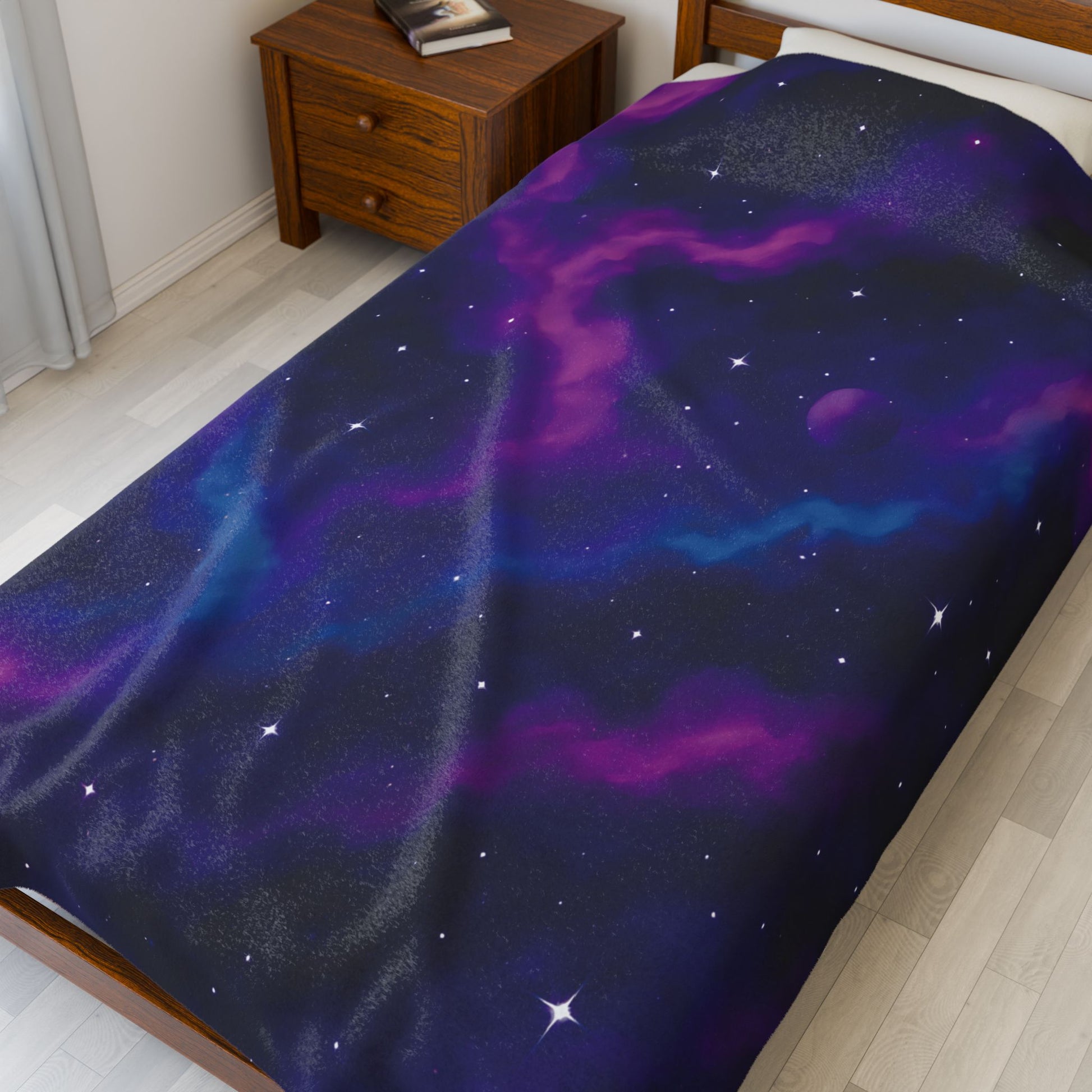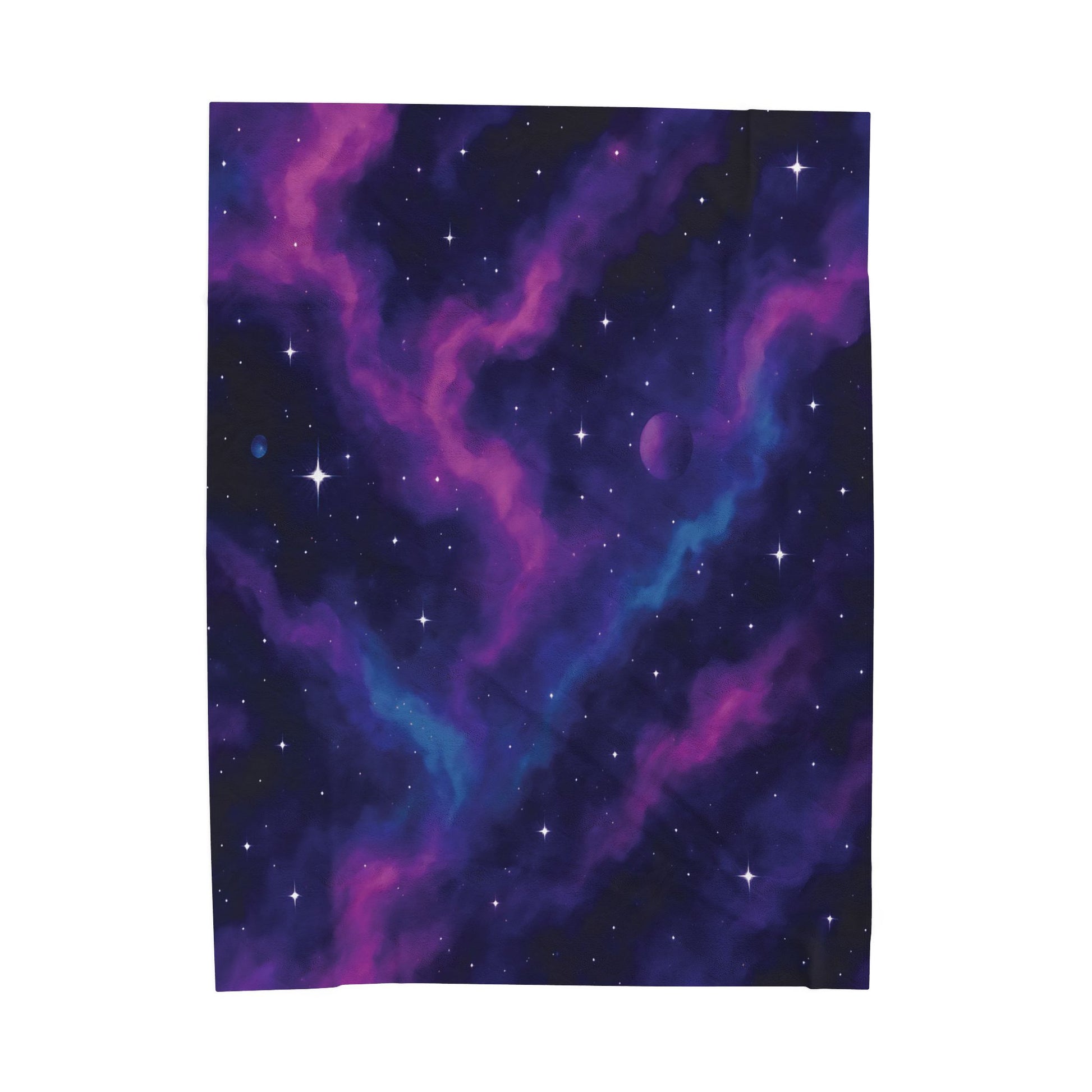Velveteen Galaxy Plush Blanket – Cosmic Nebula Print in Purple & Blue (Adult Size).