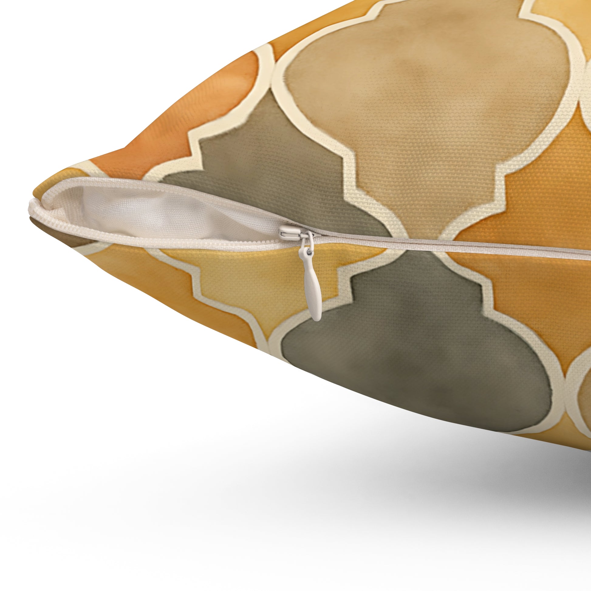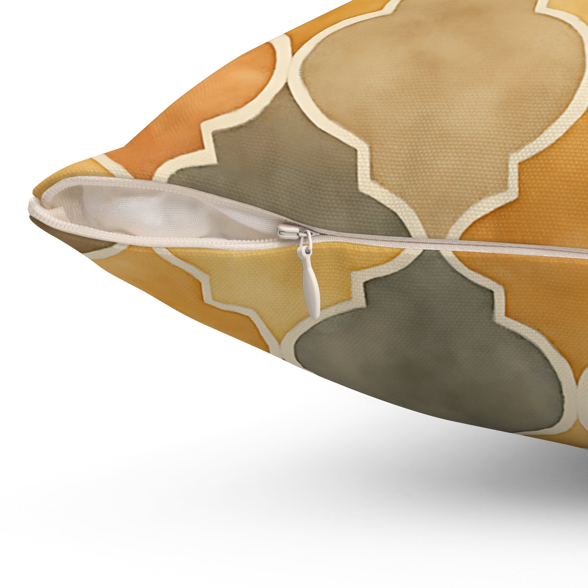Elevate your home décor with this Warm Moroccan Tile Throw Pillow, showcasing a rich blend of golden yellow, burnt orange, and earthy taupe tones in a classic quatrefoil pattern.