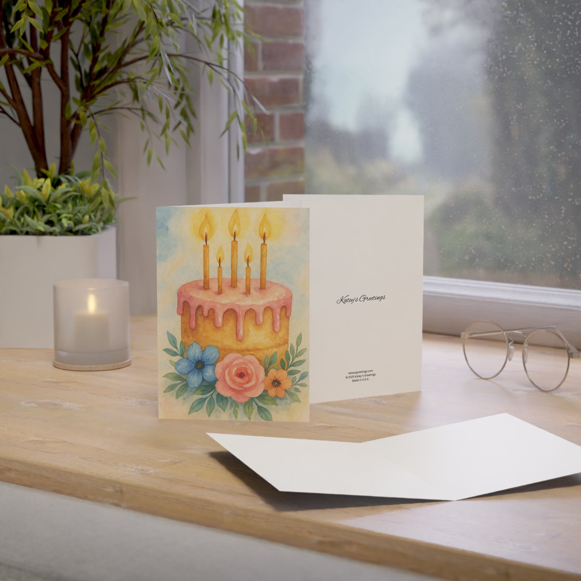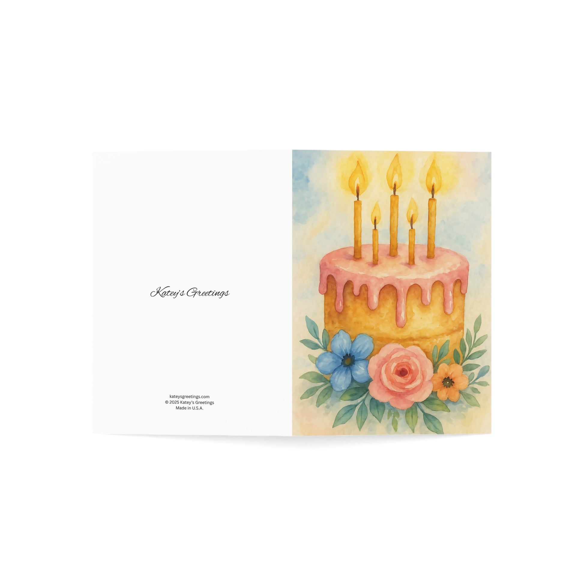 Watercolor Birthday Cake Greeting Card with Floral Accents – Blank Inside.