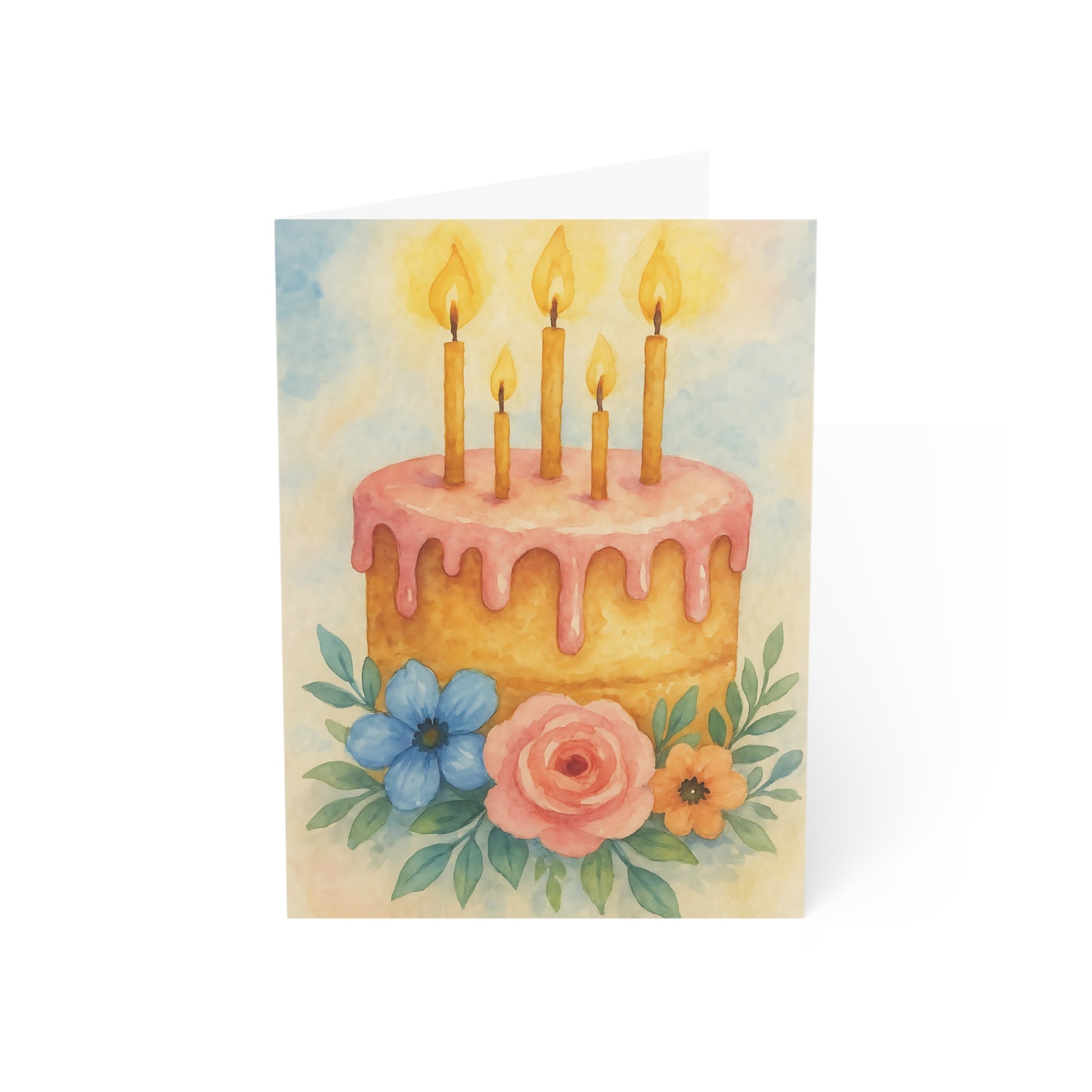 Make their special day even sweeter with this watercolor birthday greeting card, featuring a beautifully illustrated golden cake topped with pink frosting drip, five glowing candles, and a vibrant floral arrangement in soft pastel tones.