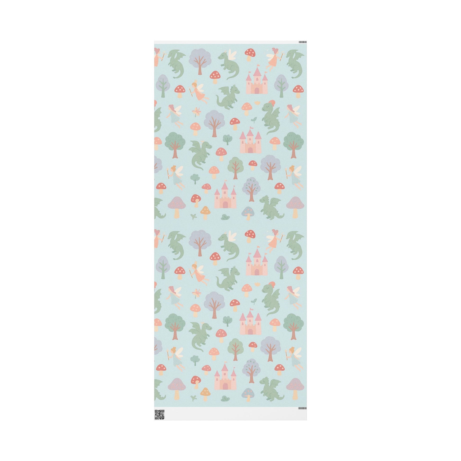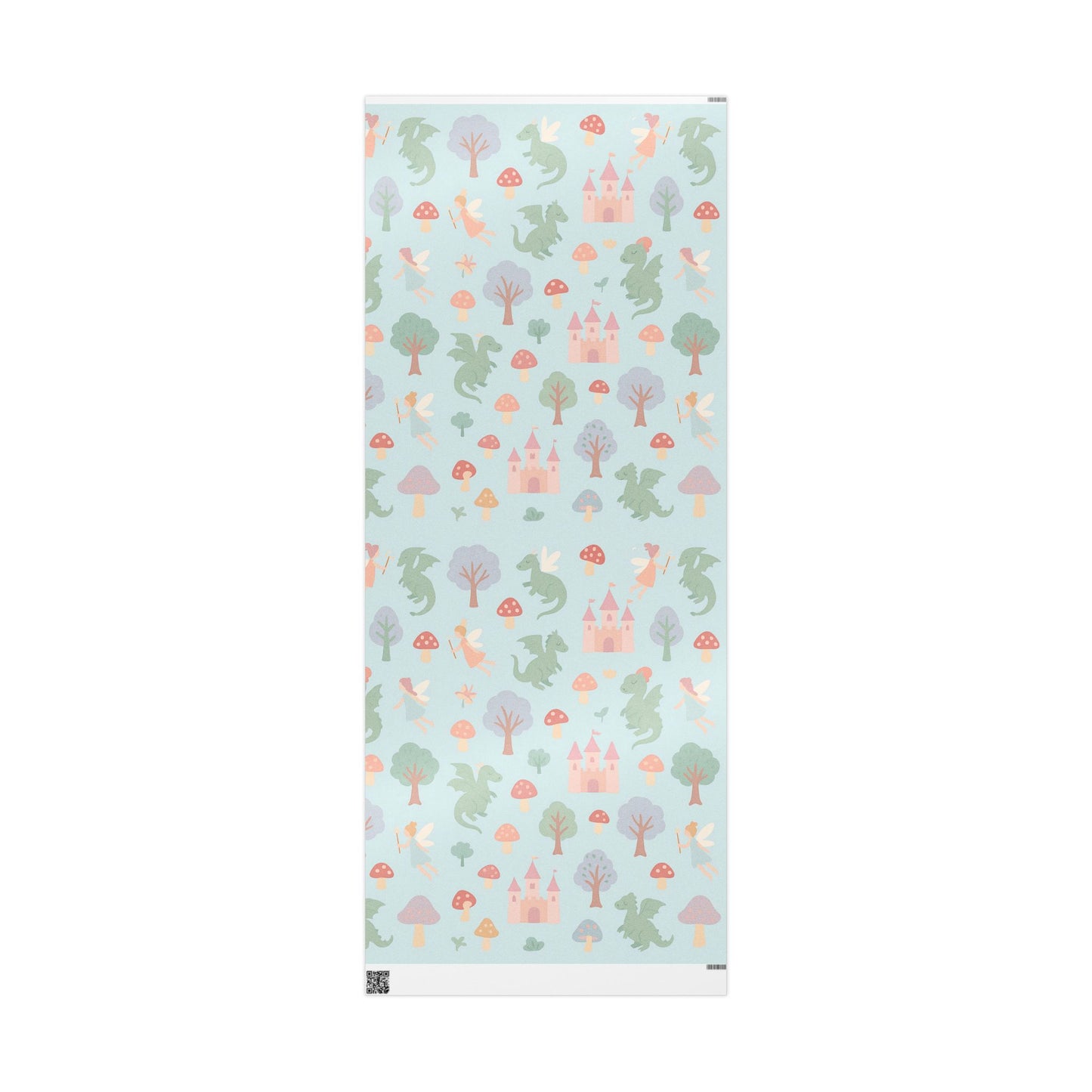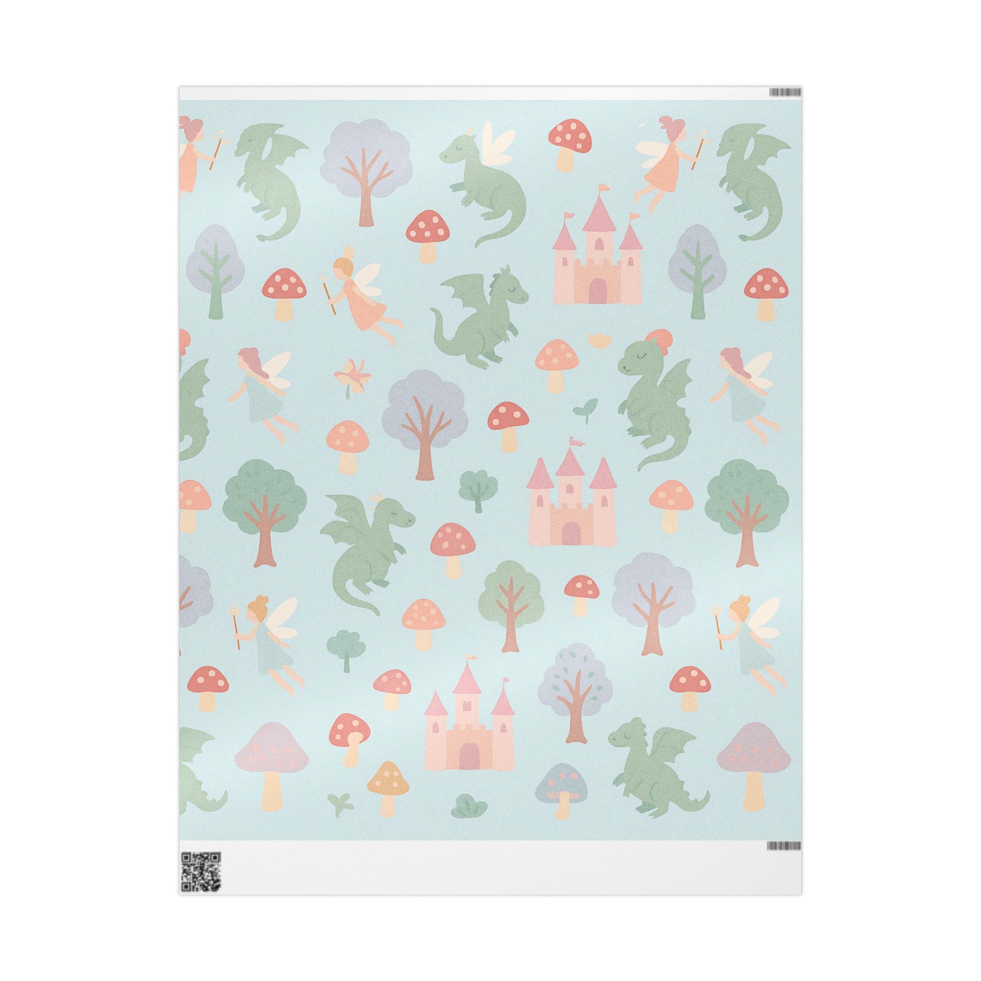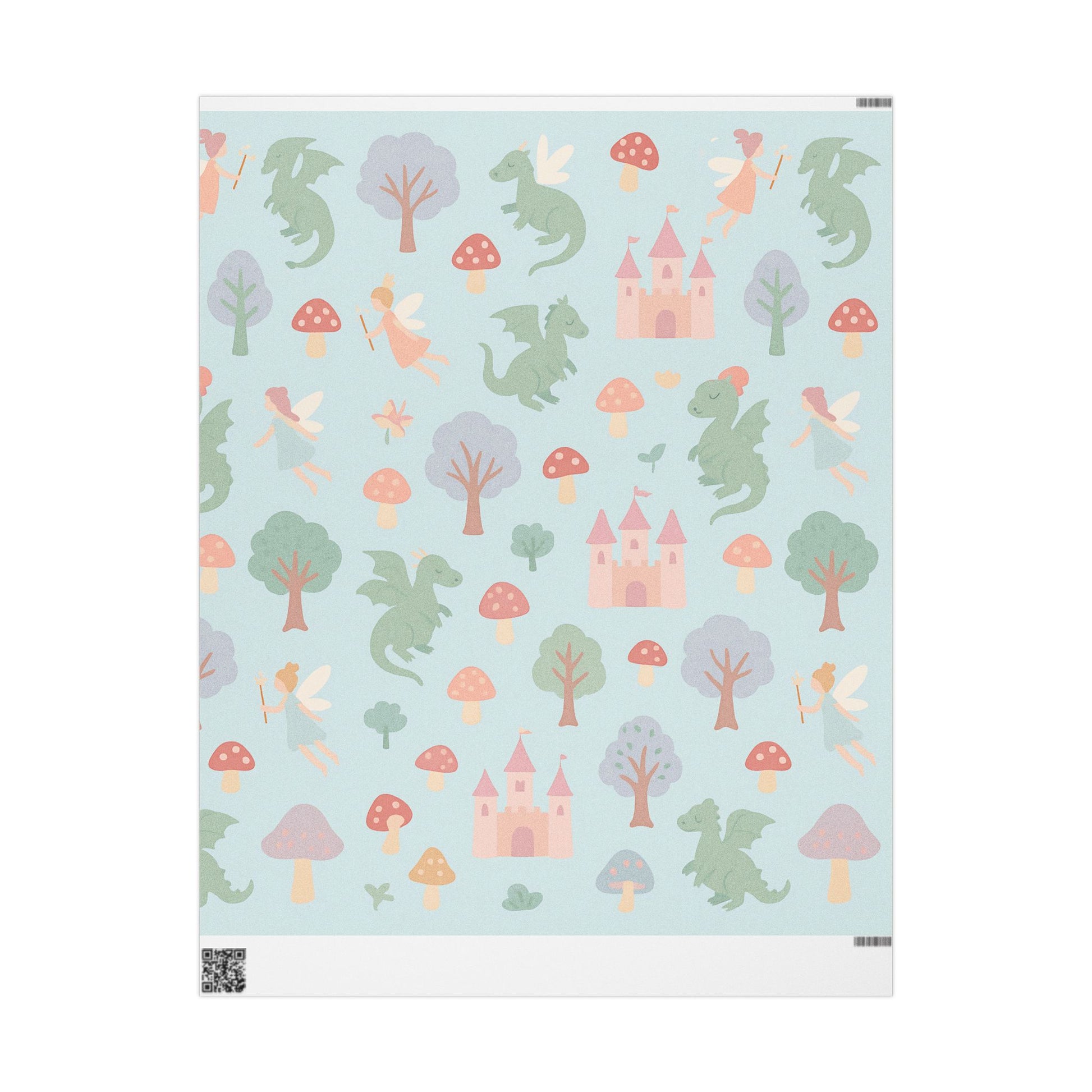 Turn your gifts into a magical moment with this Whimsical Fairy Tale Wrapping Paper, featuring a dreamy scene of pastel dragons, charming castles, fluttering fairies, enchanted trees, and cute mushrooms set against a soft sky-blue background.