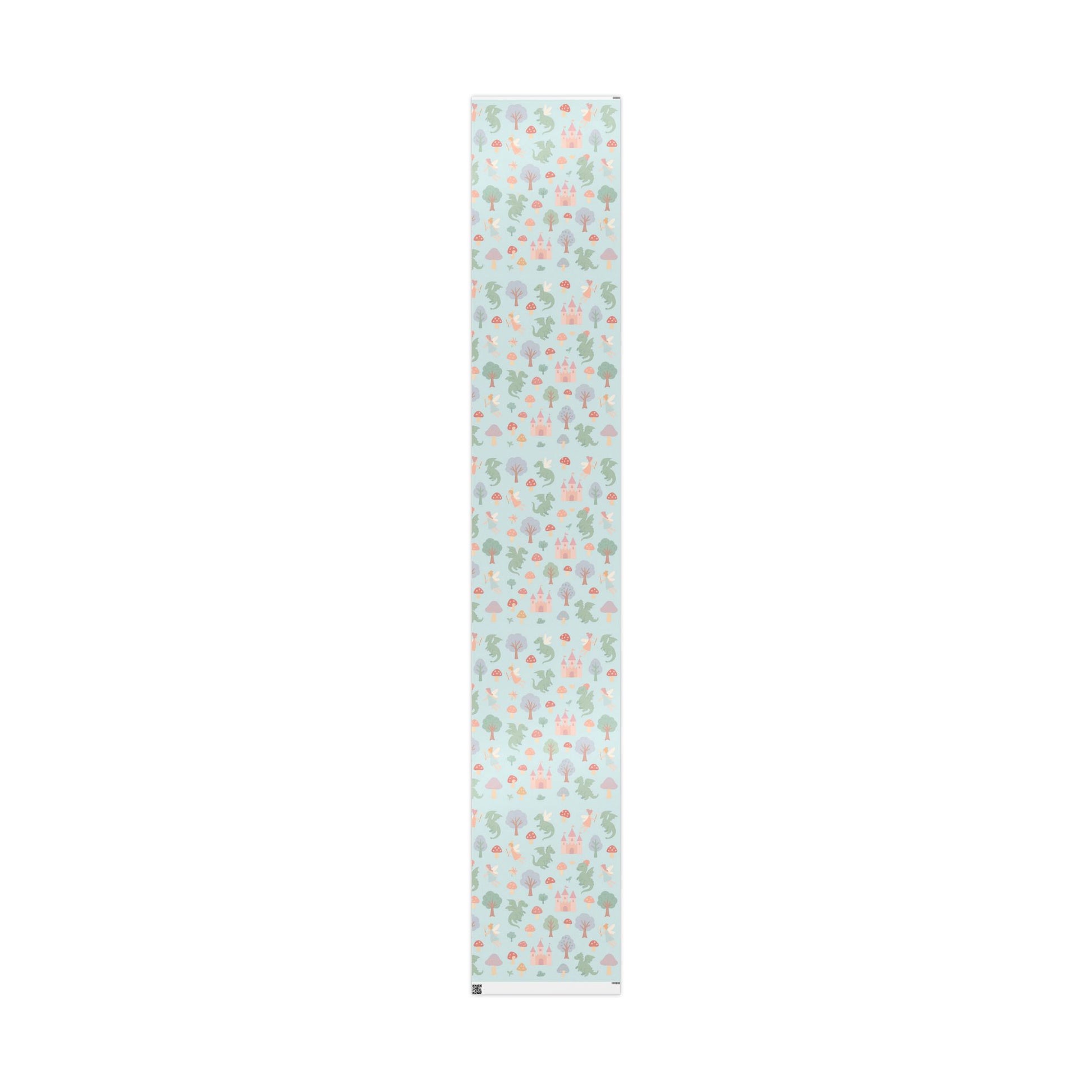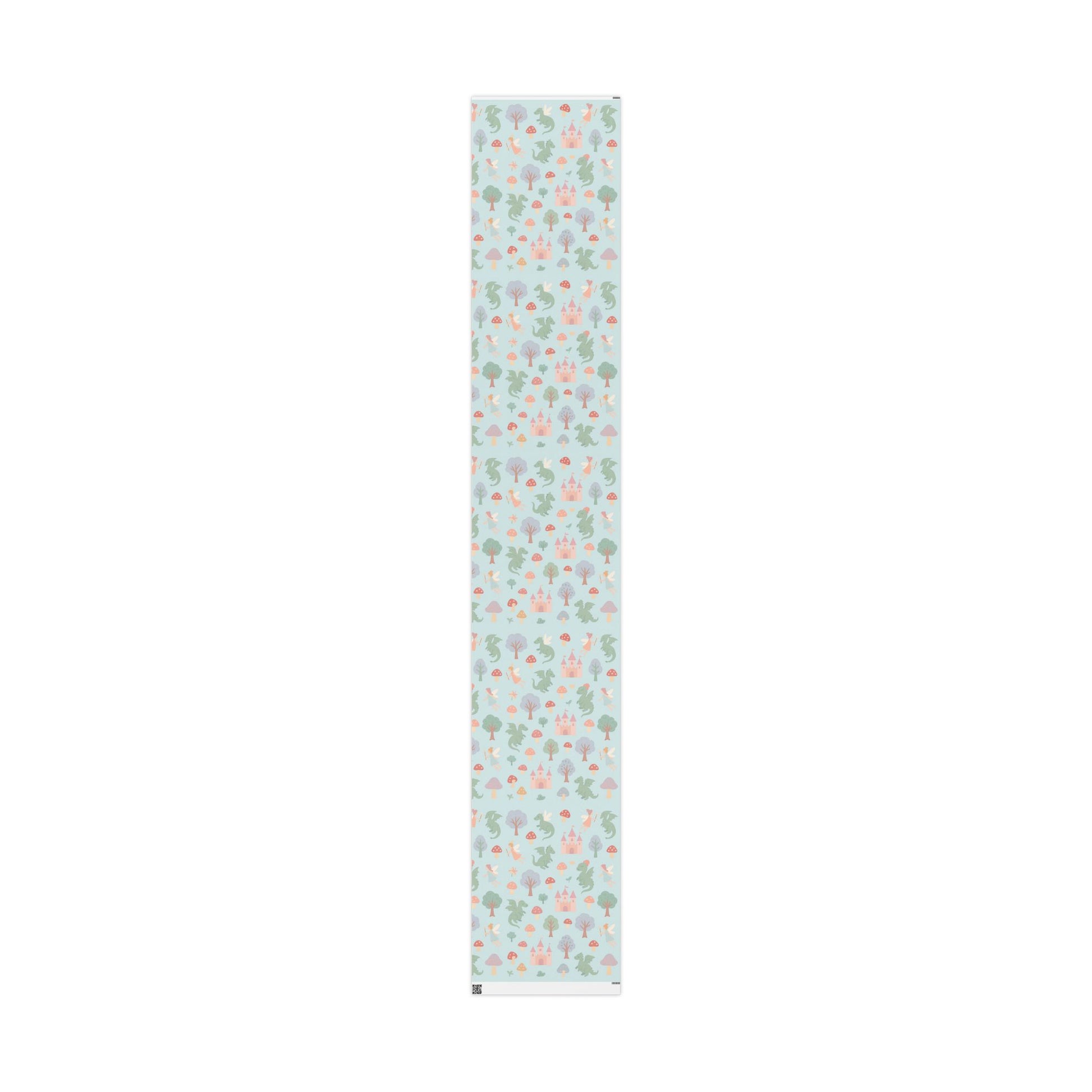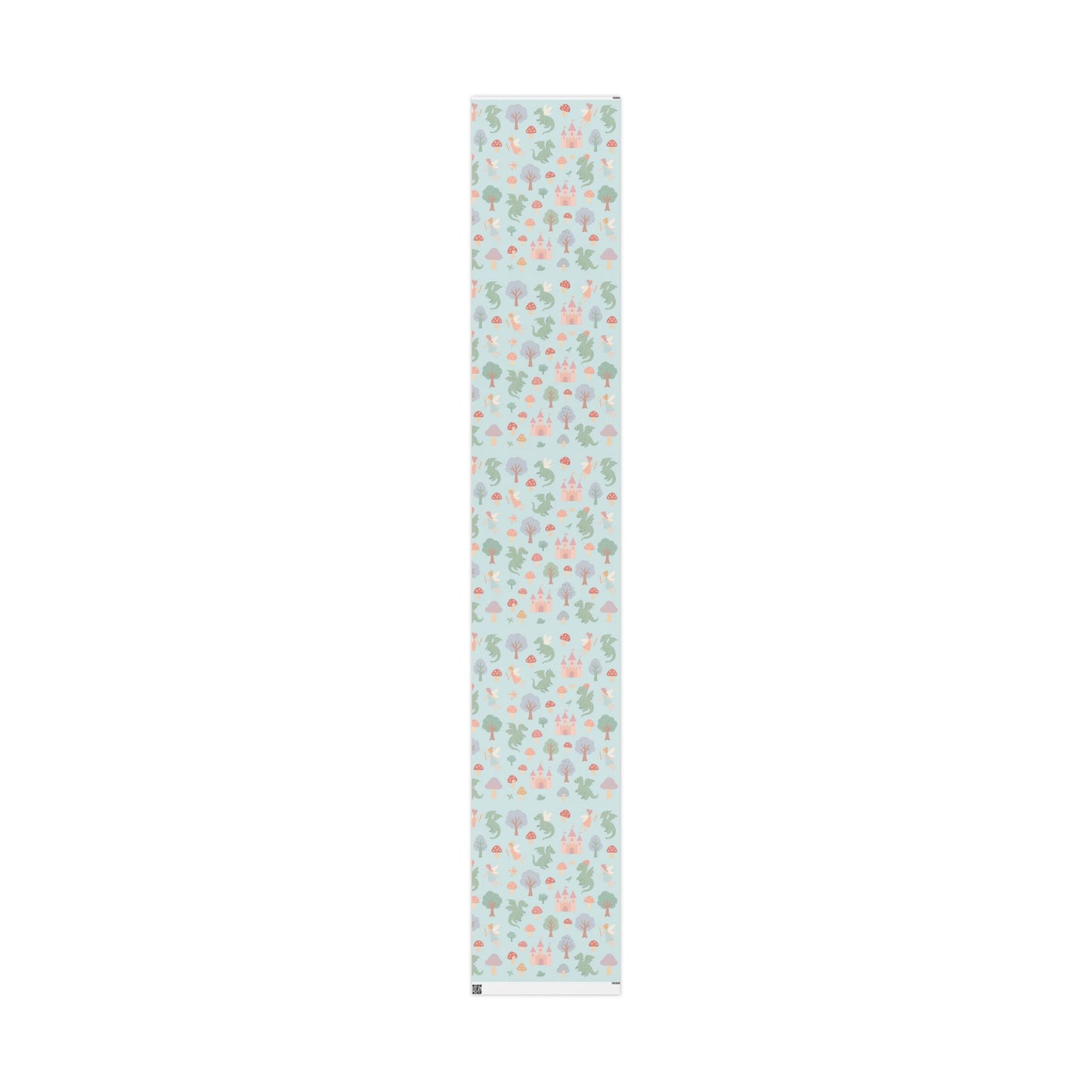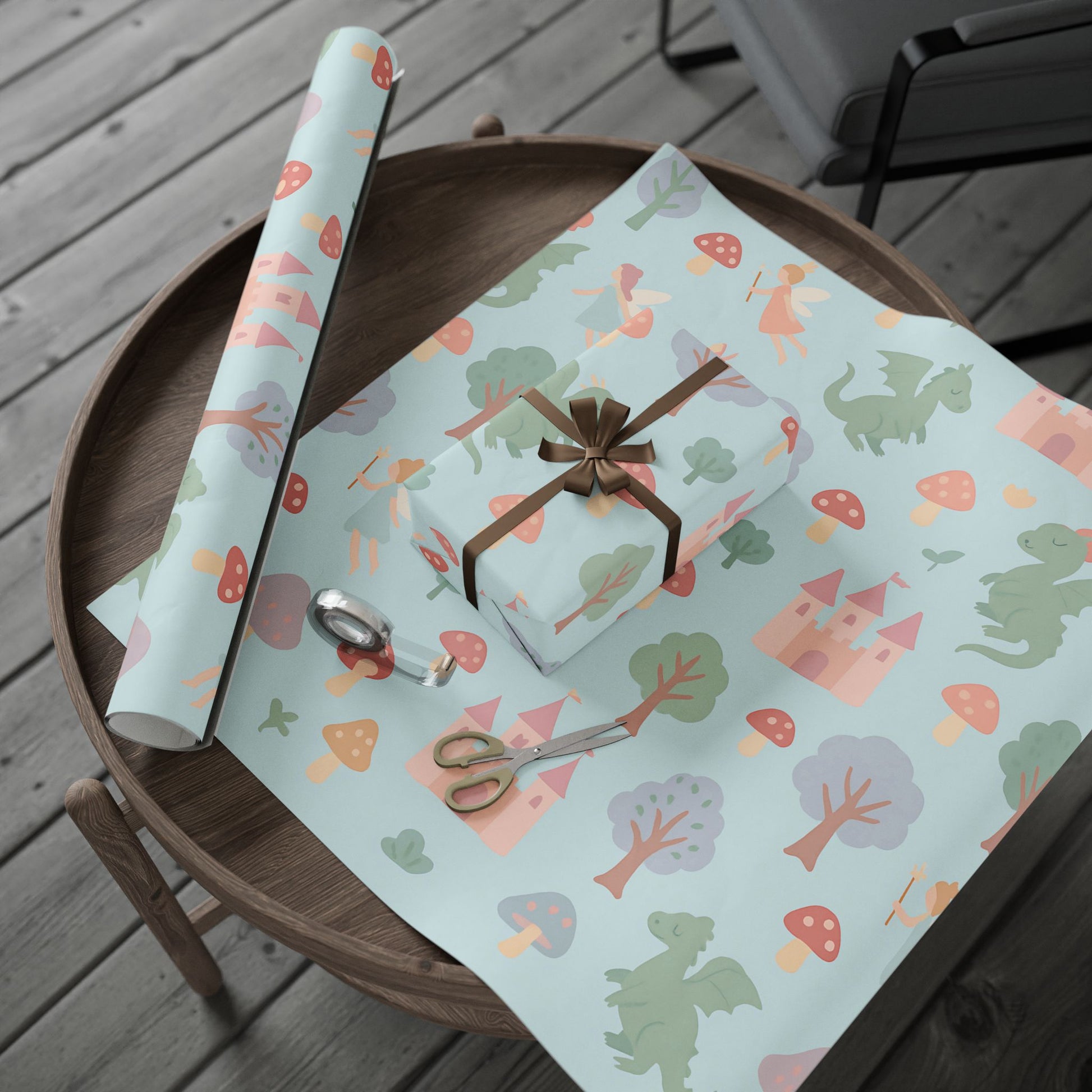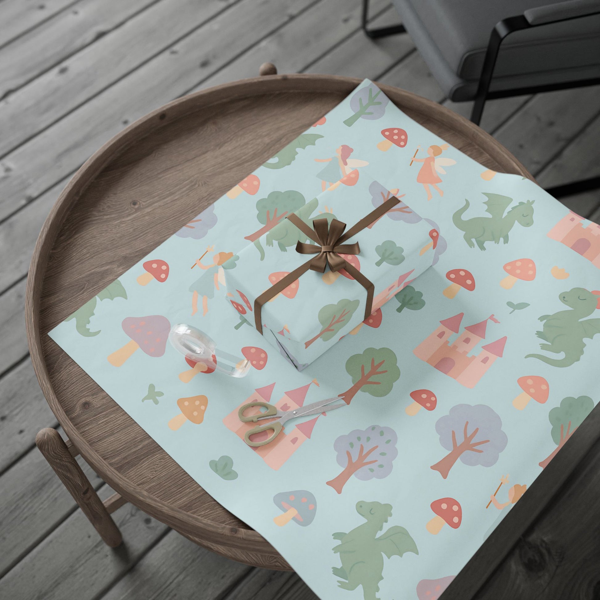 Turn your gifts into a magical moment with this Whimsical Fairy Tale Wrapping Paper, featuring a dreamy scene of pastel dragons, charming castles, fluttering fairies, enchanted trees, and cute mushrooms set against a soft sky-blue background.
