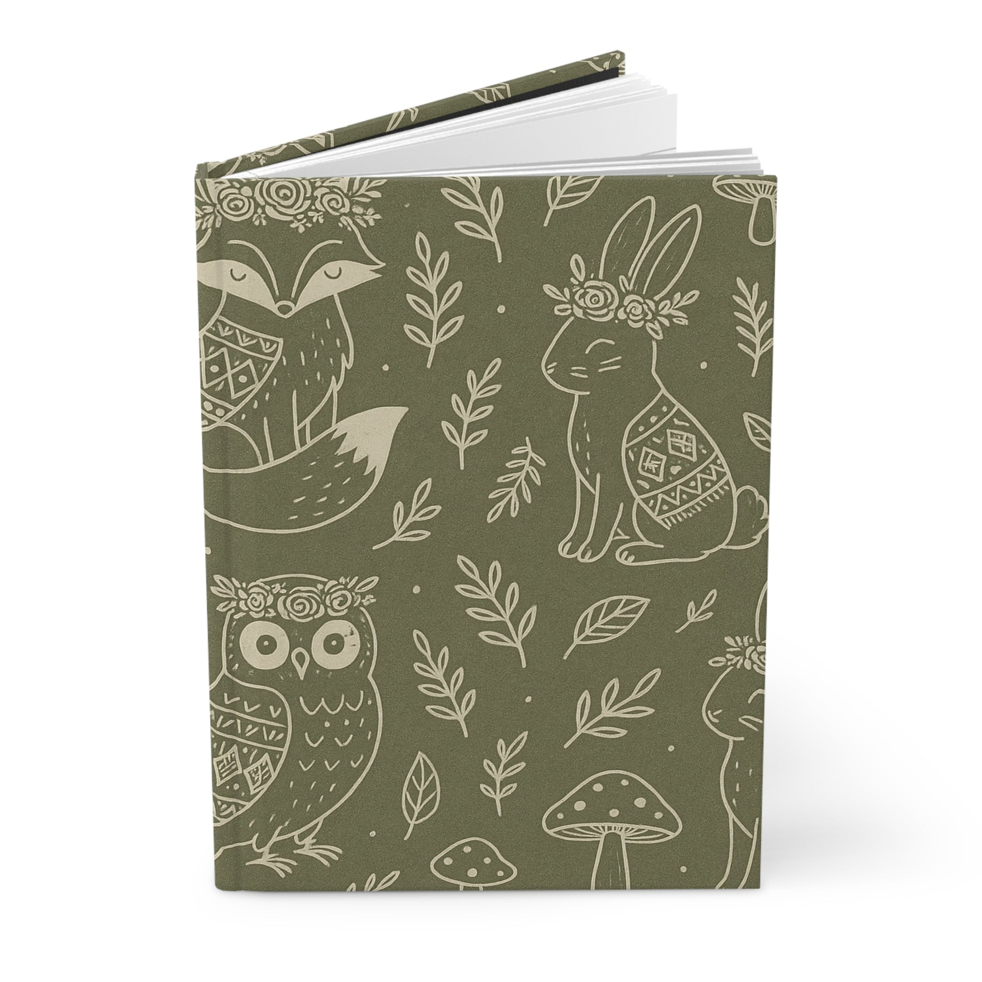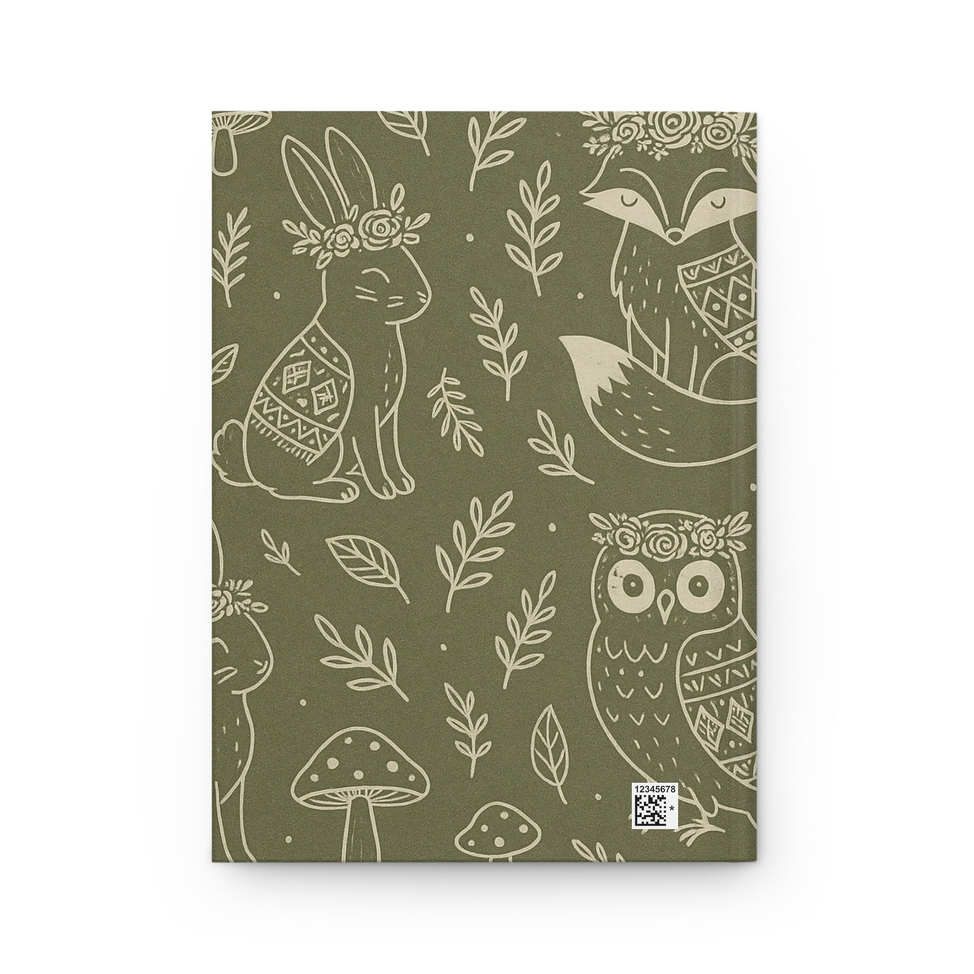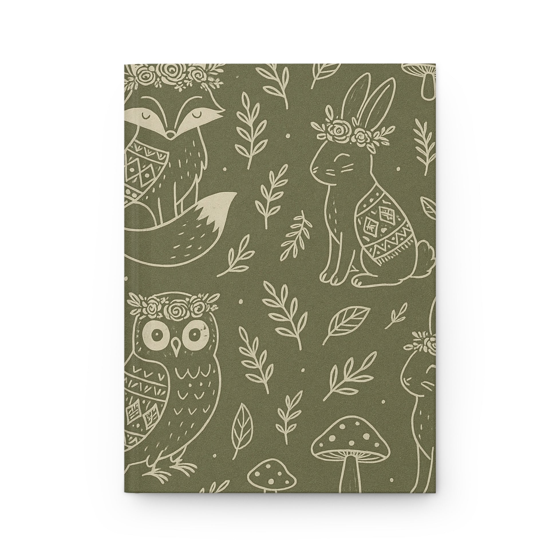 Capture your thoughts, dreams, and to-dos in this charming Whimsical Forest Friends Hardcover Journal, featuring an adorable all-over print of a fox, bunny, and owl adorned with floral crowns and surrounded by woodland leaves and mushrooms.