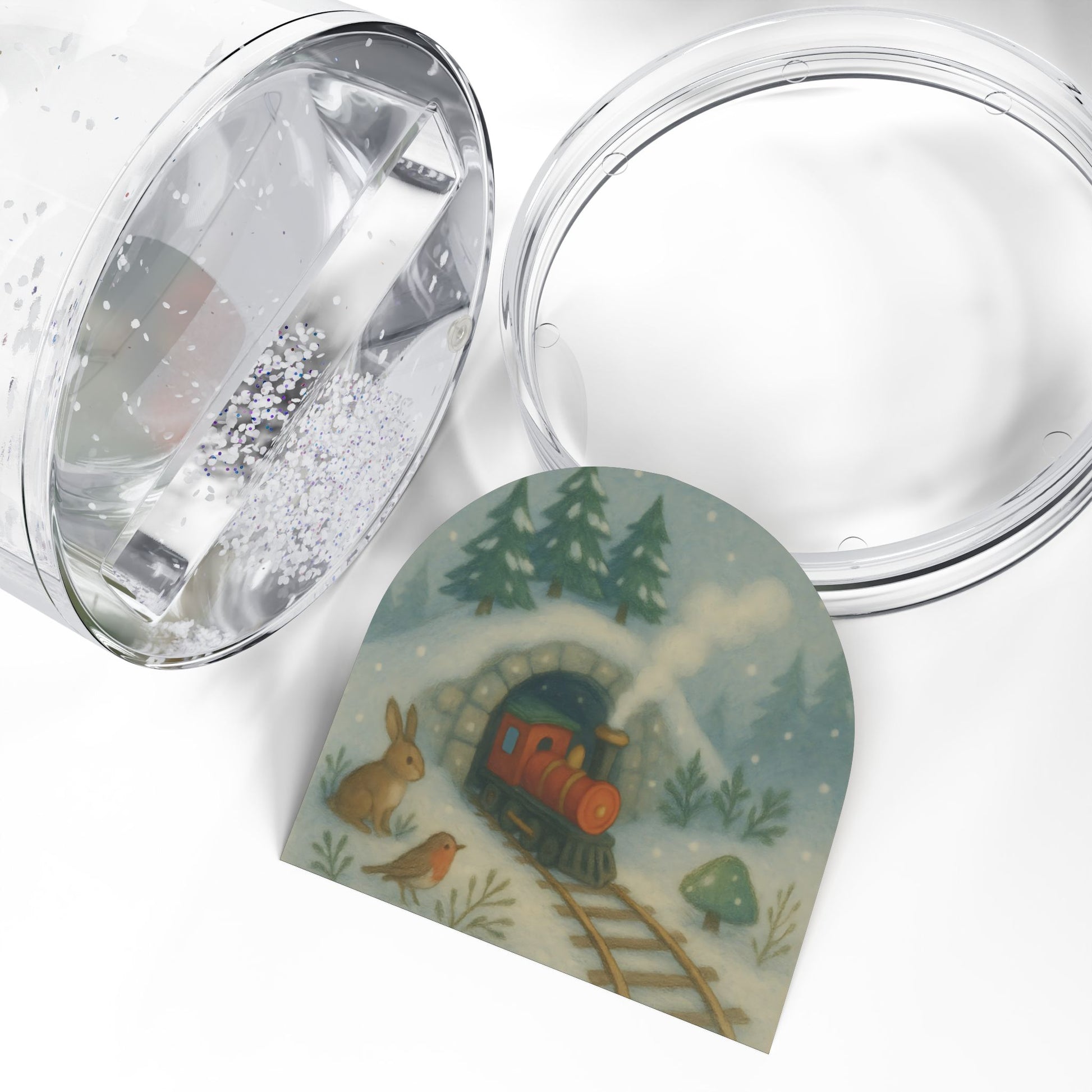 Whimsical Winter Train Snow Globe – Woodland Tunnel Scene with Forest Animals.