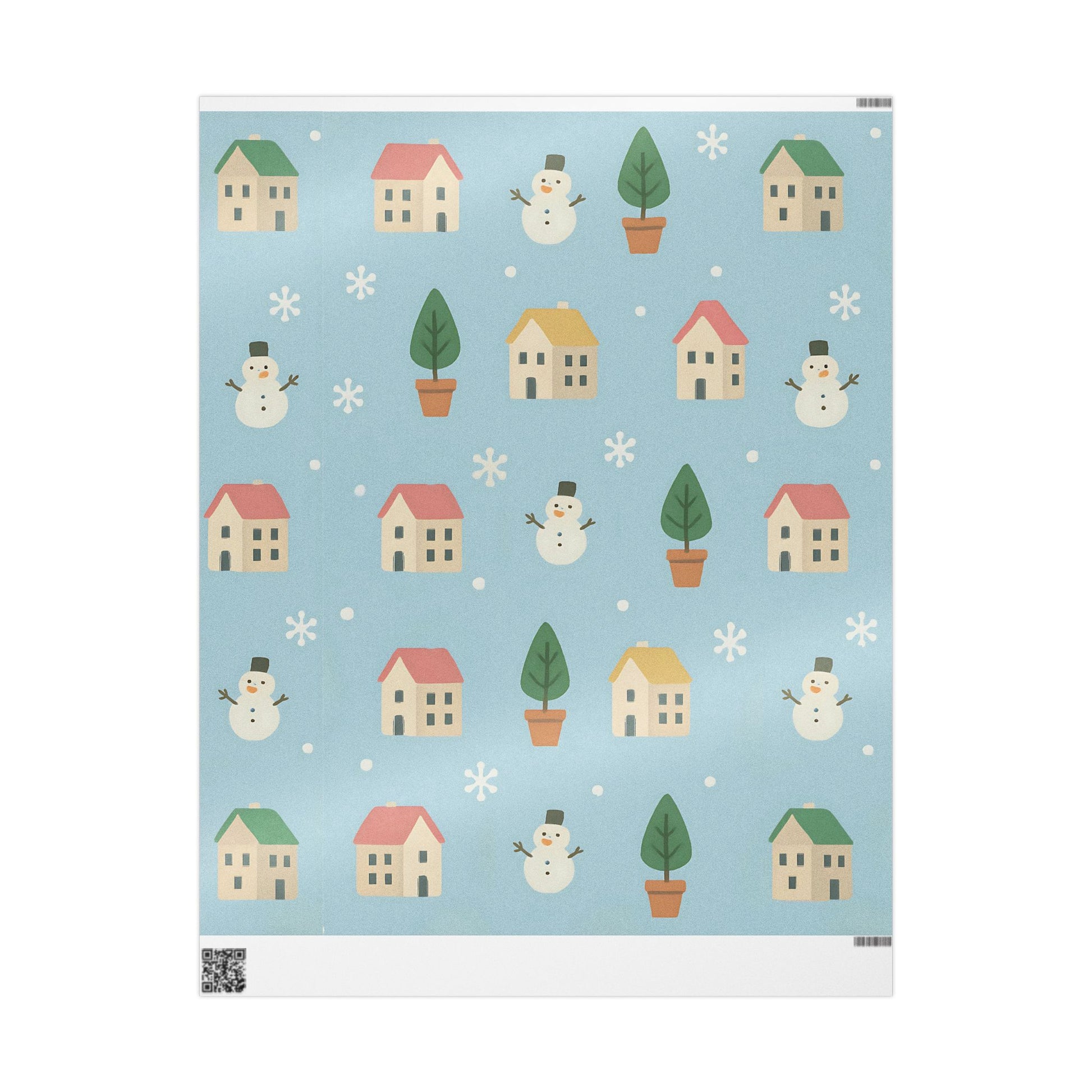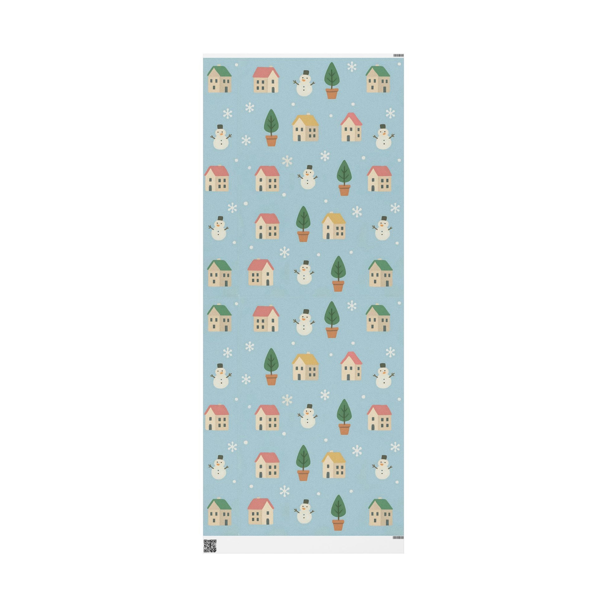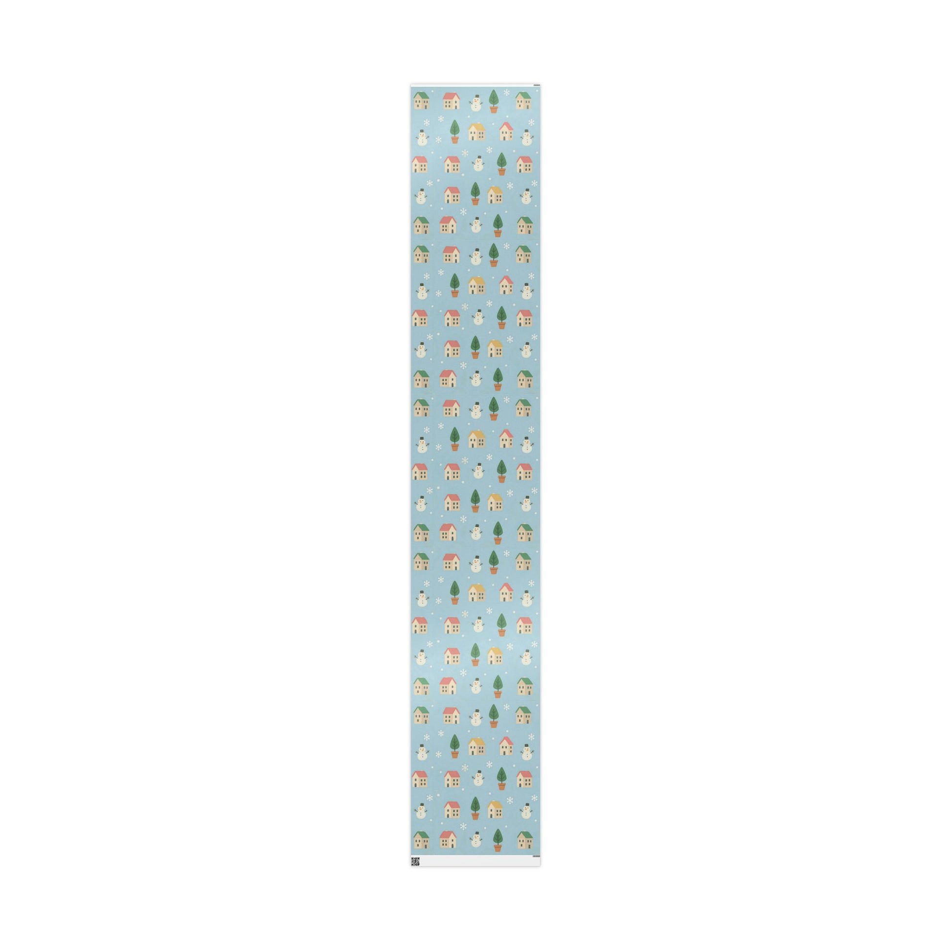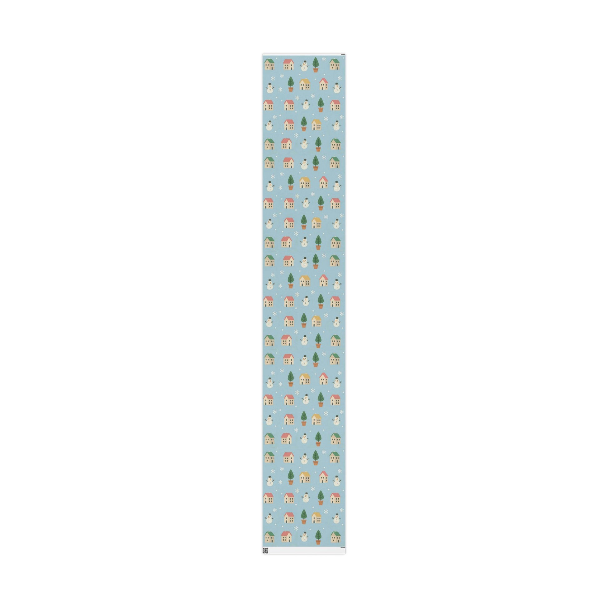 Featuring a delightful pattern of cozy houses, smiling snowmen, snowy trees, and gentle snowflakes, this pastel blue design captures the warmth of the holiday season with a playful, nostalgic touch.