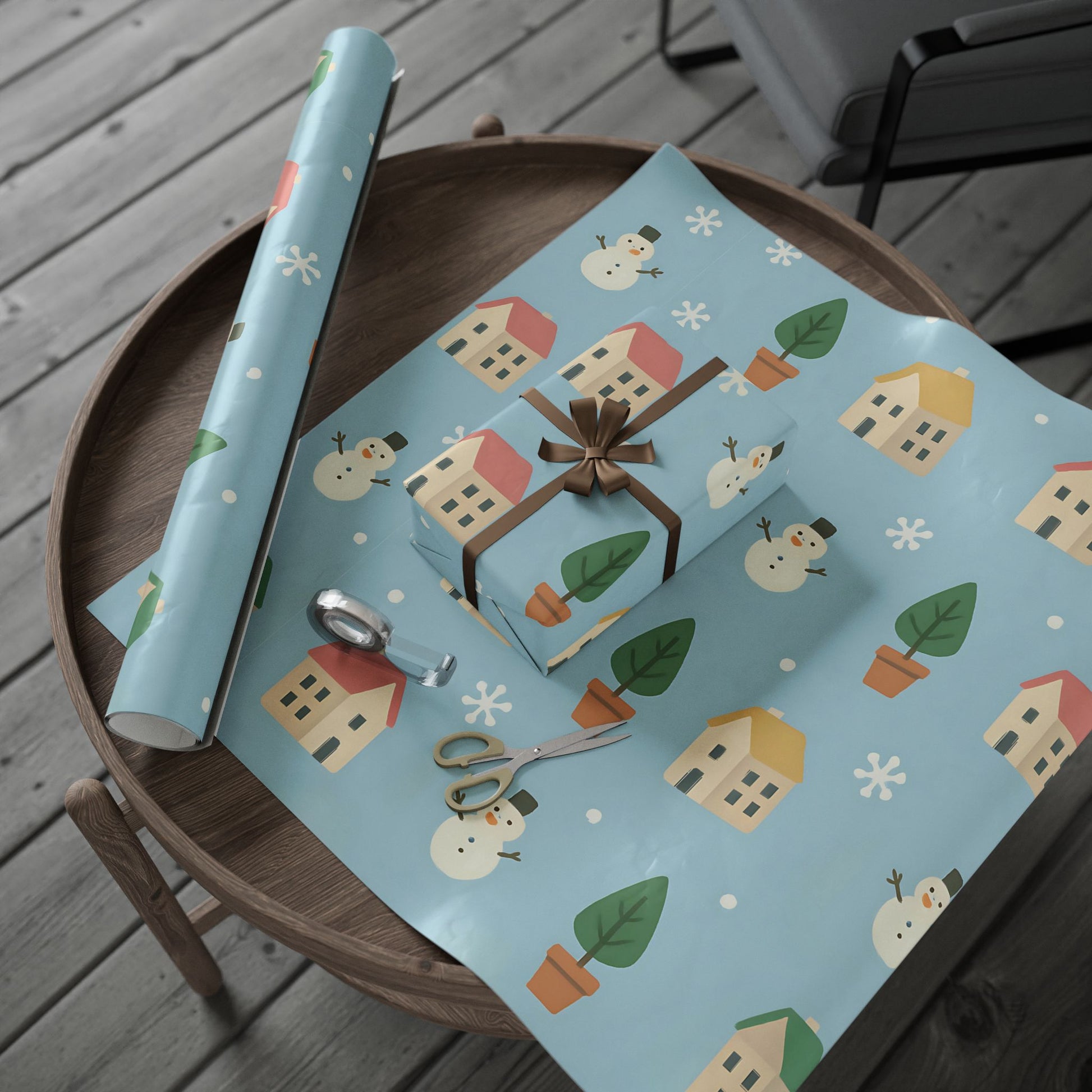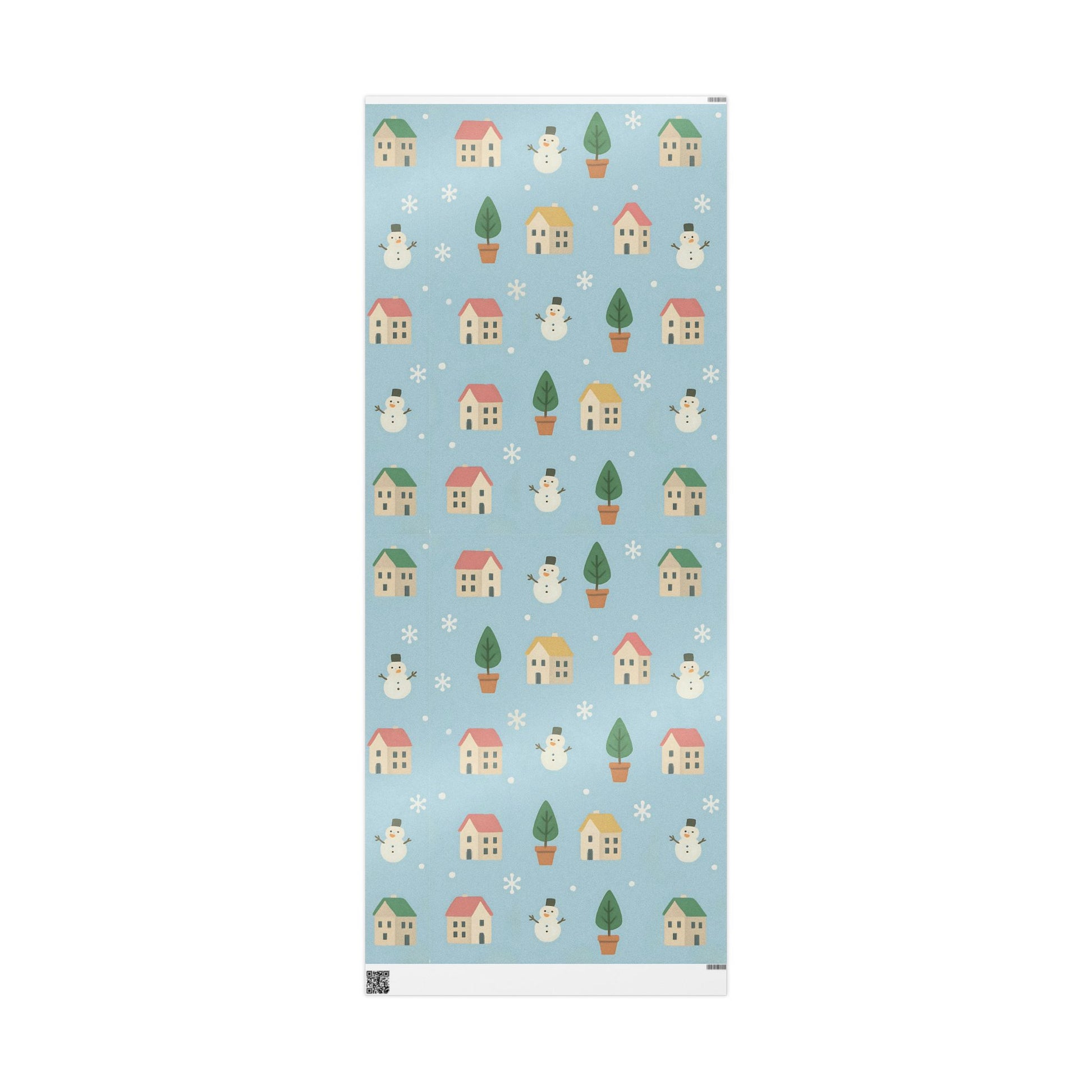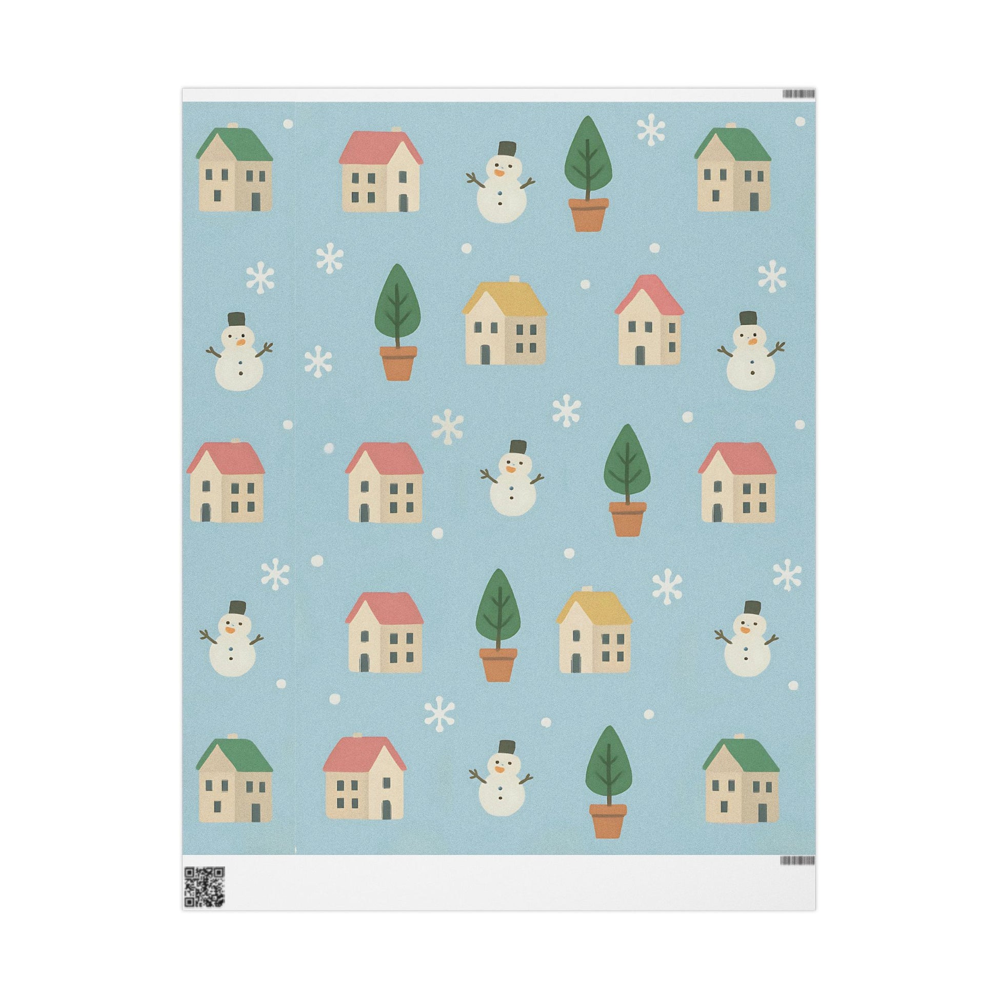 Featuring a delightful pattern of cozy houses, smiling snowmen, snowy trees, and gentle snowflakes, this pastel blue design captures the warmth of the holiday season with a playful, nostalgic touch.