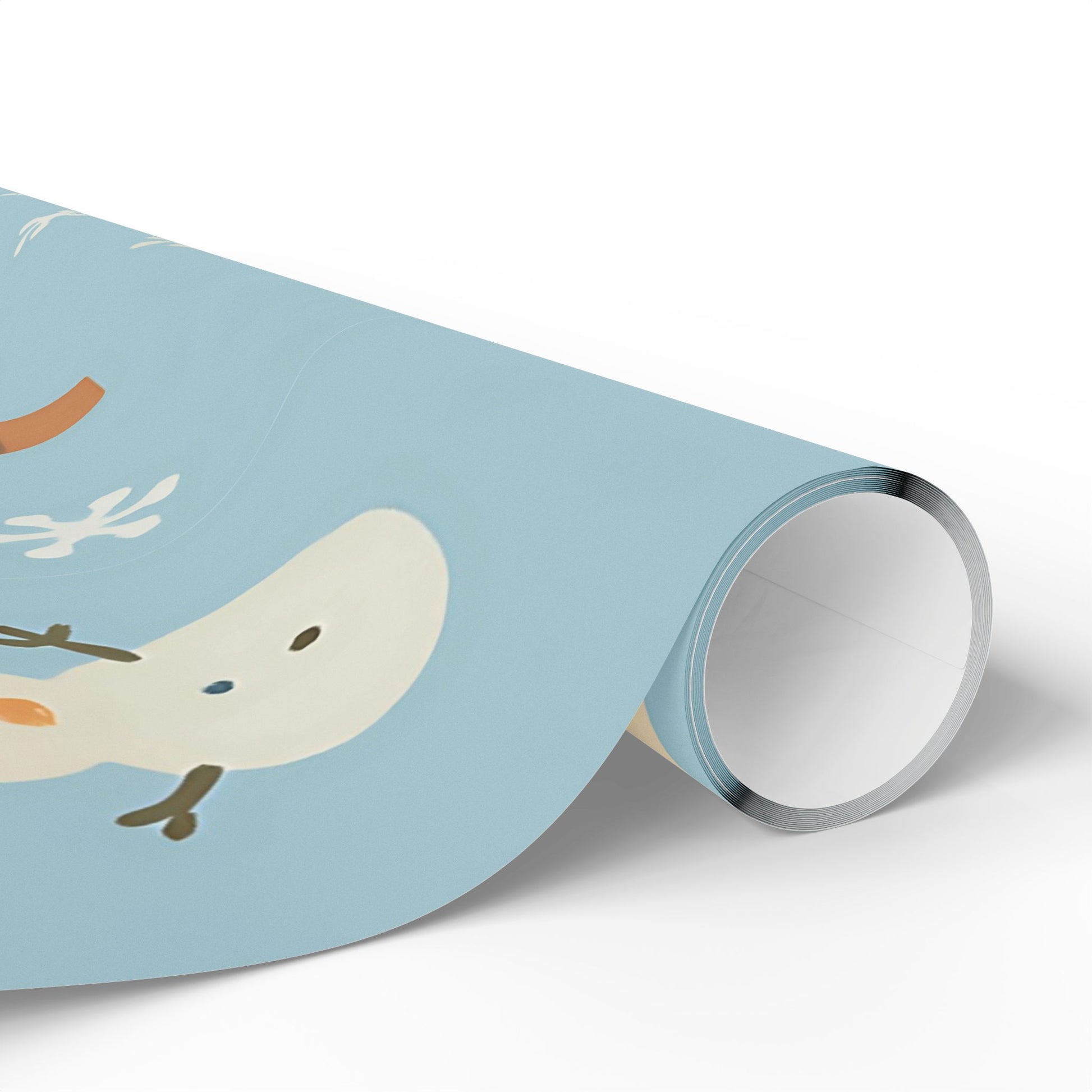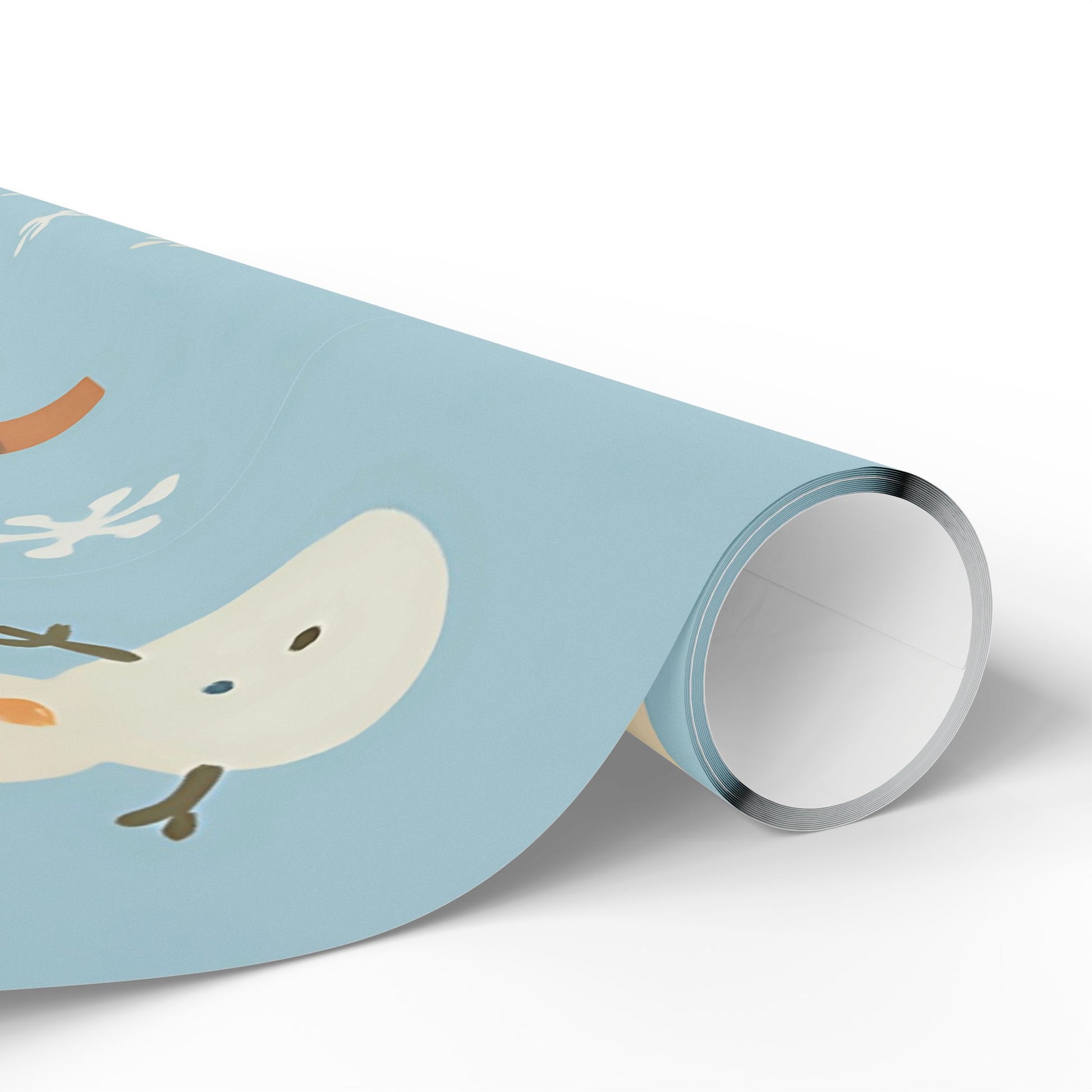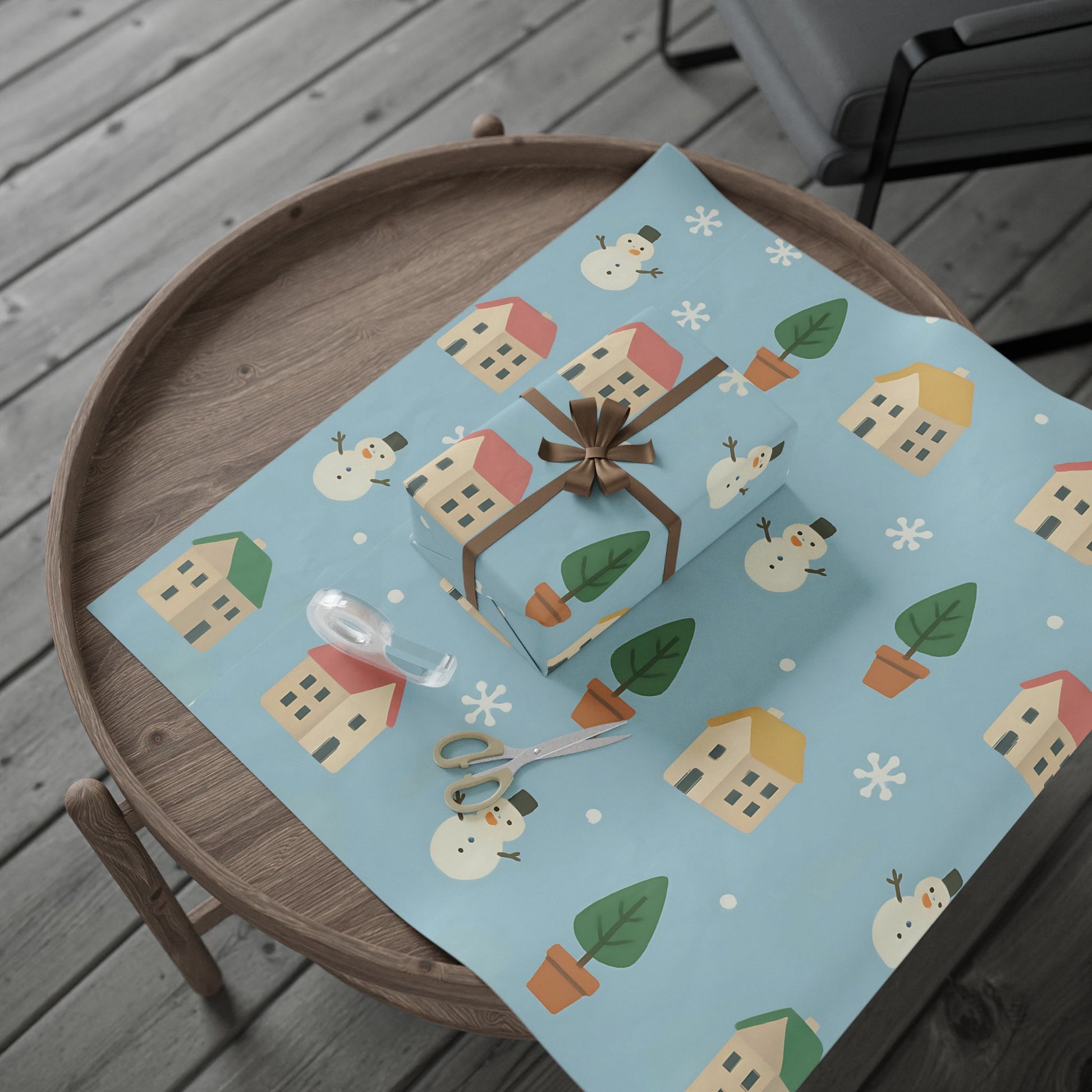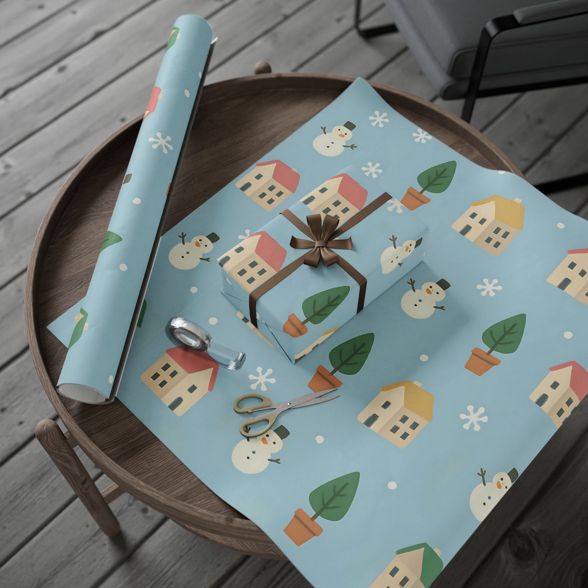 Featuring a delightful pattern of cozy houses, smiling snowmen, snowy trees, and gentle snowflakes, this pastel blue design captures the warmth of the holiday season with a playful, nostalgic touch.
